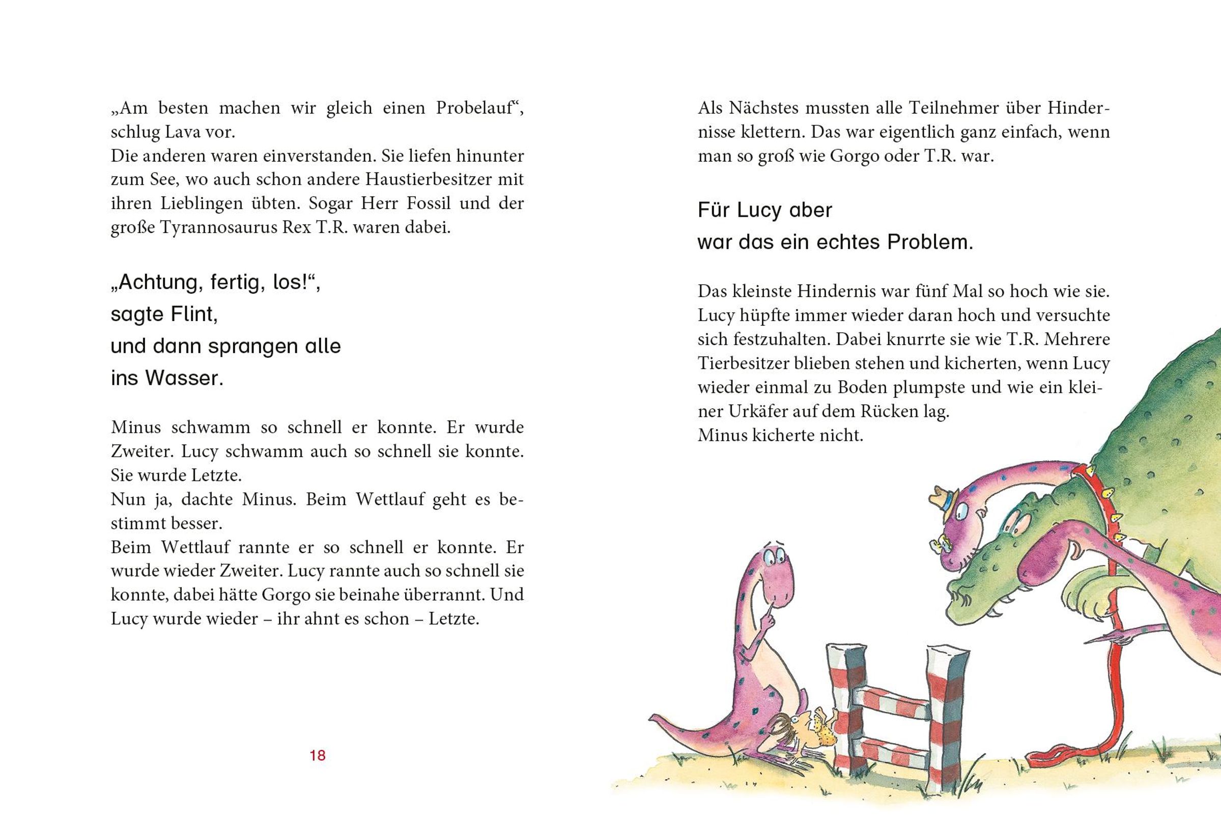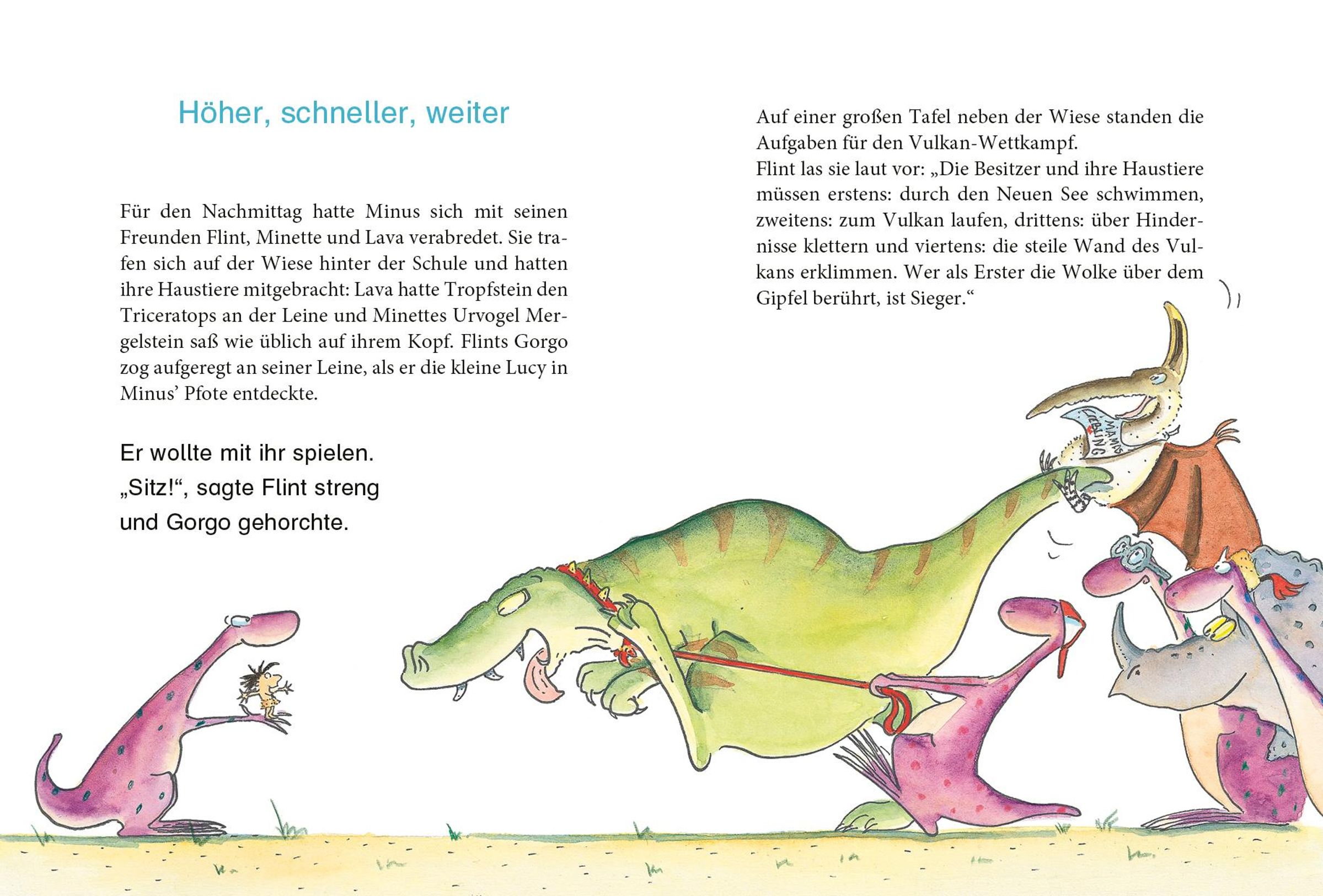 In Farnheim findet der jährliche große Vulkan-Wettkampf statt, an dem alle Dinosaurier zusammen mit ihren Haustieren teilnehmen dürfen. Schwimmen, Hindernislauf und Klettern stehen auf dem Programm. Natürlich möchte Minus Drei mit seinem Haustier, dem Urmädchen Lucy, unbedingt mitmachen. Nur leider hat die kleine Lucy gegen die anderen Haustiere keine Chance. Minus' Großonkel und Großtante wollen helfen - und tauschen Lucy gegen einen Gigantosaurus ein. Oje, das wollte Minus ganz sicher nicht! Wird er seine Lucy wiederfinden?