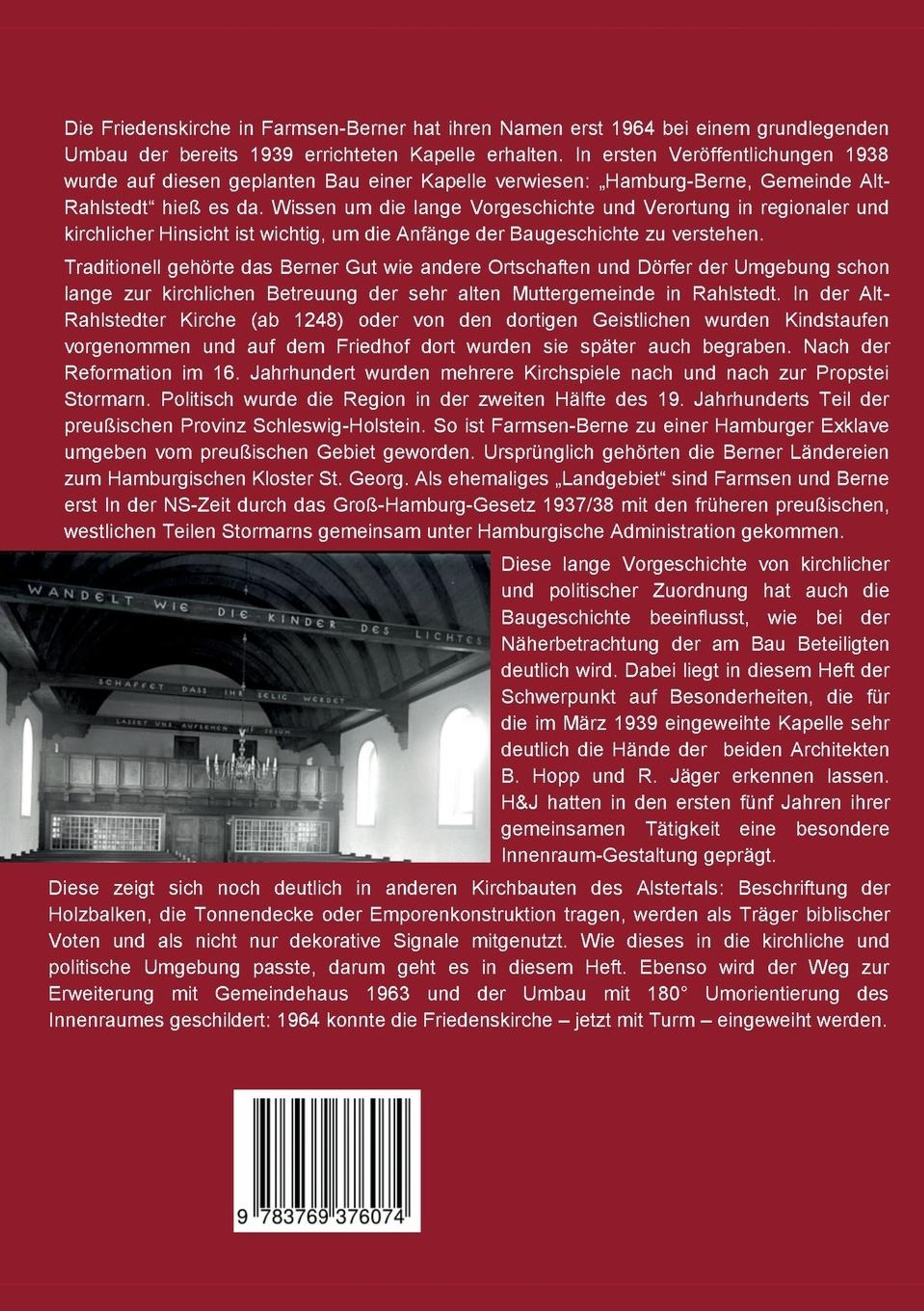 Diese zeigt sich noch deutlich in anderen Kirchbauten des Alstertals: Beschriftung der Holzbalken, die Tonnendecke oder Emporenkonstruktion tragen, werden als Träger biblischer Voten und als nicht nur dekorative Signale mit genutzt. Wie dieses in die kirchliche und politische Umgebung passte, darum geht es in diesem Heft. Ebenso wird der Weg zur Erweiterung mit Gemeindehaus 1963 und der Umbau mit 180 Grad Umorientierung des Innenraumes geschildert: 1964 konnte die Friedenskirche - jetzt mit Turm - eingeweiht werden.