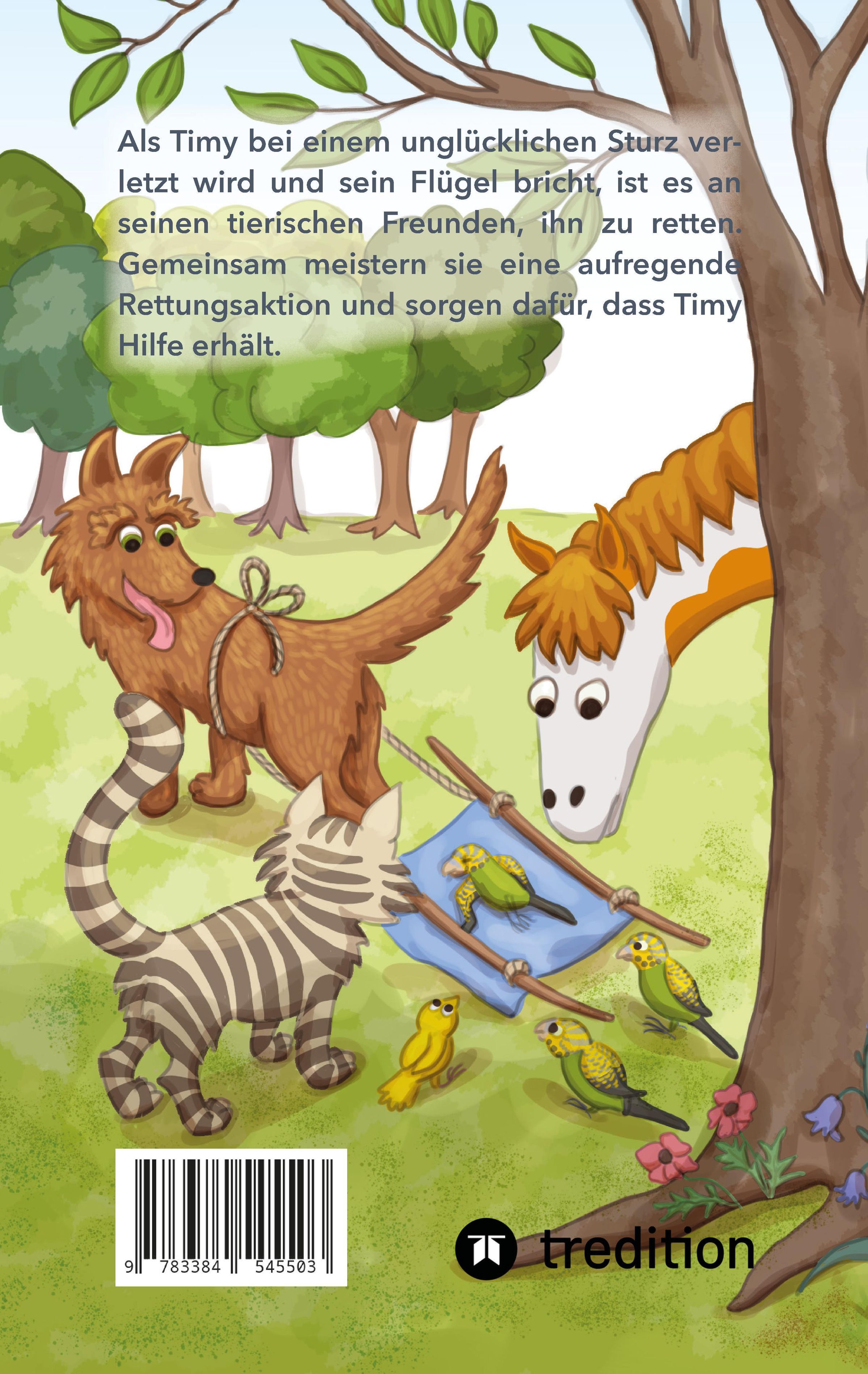 "Lucias Abenteuer 3: Der gebrochene Flügel, V.C. Schmitt." Illustration mit Hund, Pferd, Waschbär und Vögeln auf Wiese., Buch