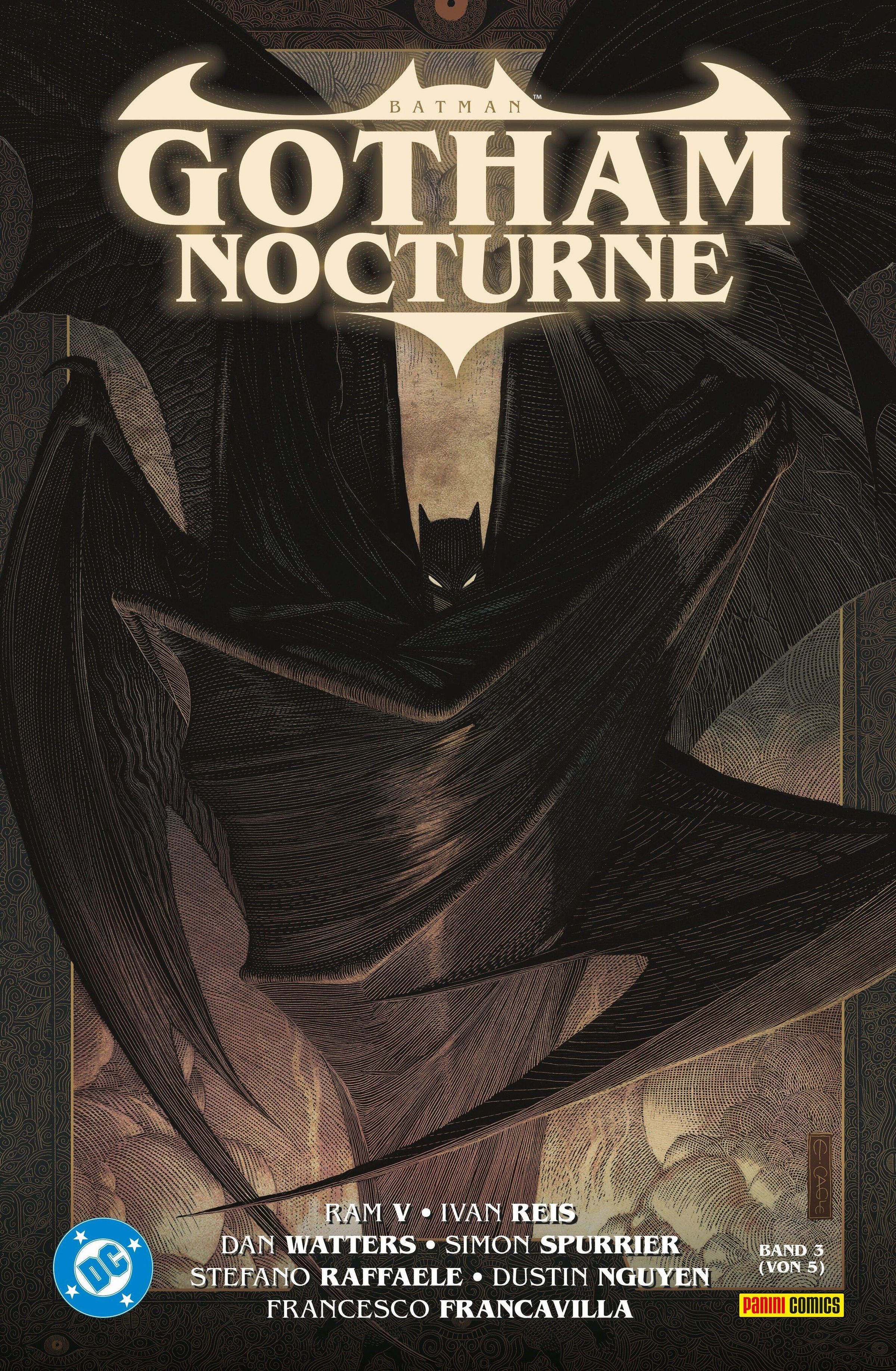 "Batman Gotham Nocturne" in großen Buchstaben. Dunkle Illustration mit Batman, der in einem Umhang verborgen ist., Buch
