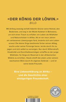 Valentin Grüner lebt den Traum vieler Menschen: Mit Anfang 20 gab er seine Heimat, den Bodensee, für ein Leben als Wildhüter und Naturschützer in Afrika auf und zog in die Wüste Kalahari in Botswana. Als er vor neun Jahren ein verlassenes Löwenjunges fand, änderte sich alles: Die kleine Sirga bestimmte fortan seinen Alltag, wuchs heran, lernte auf Streifzügen, mit Valentin zu jagen und sich selbst zu versorgen. Nur durch Willenskraft, Kreativität und Durchhaltevermögen schaffte es Valentin, für Sirga ein Reservat in der afrikanischen Wildnis zu errichten. Nun streift Sirga unter Valentins wachsamem Blick durch ihr eigenes Gelände. In seinem Buch erzählt Valentin Grüner von seiner abenteuerlichen Geschichte - und der Freundschaft zu der Löwin Sirga.