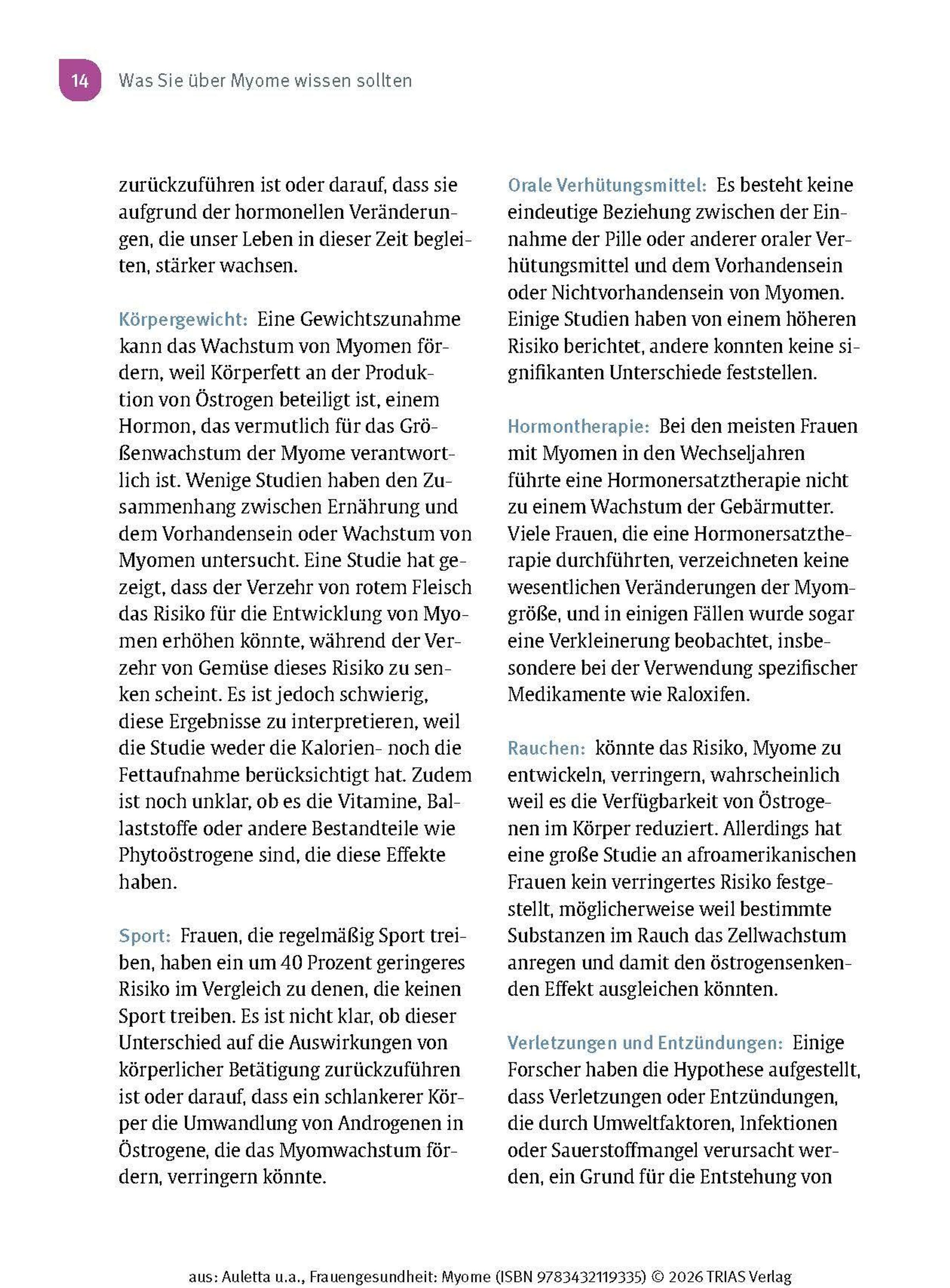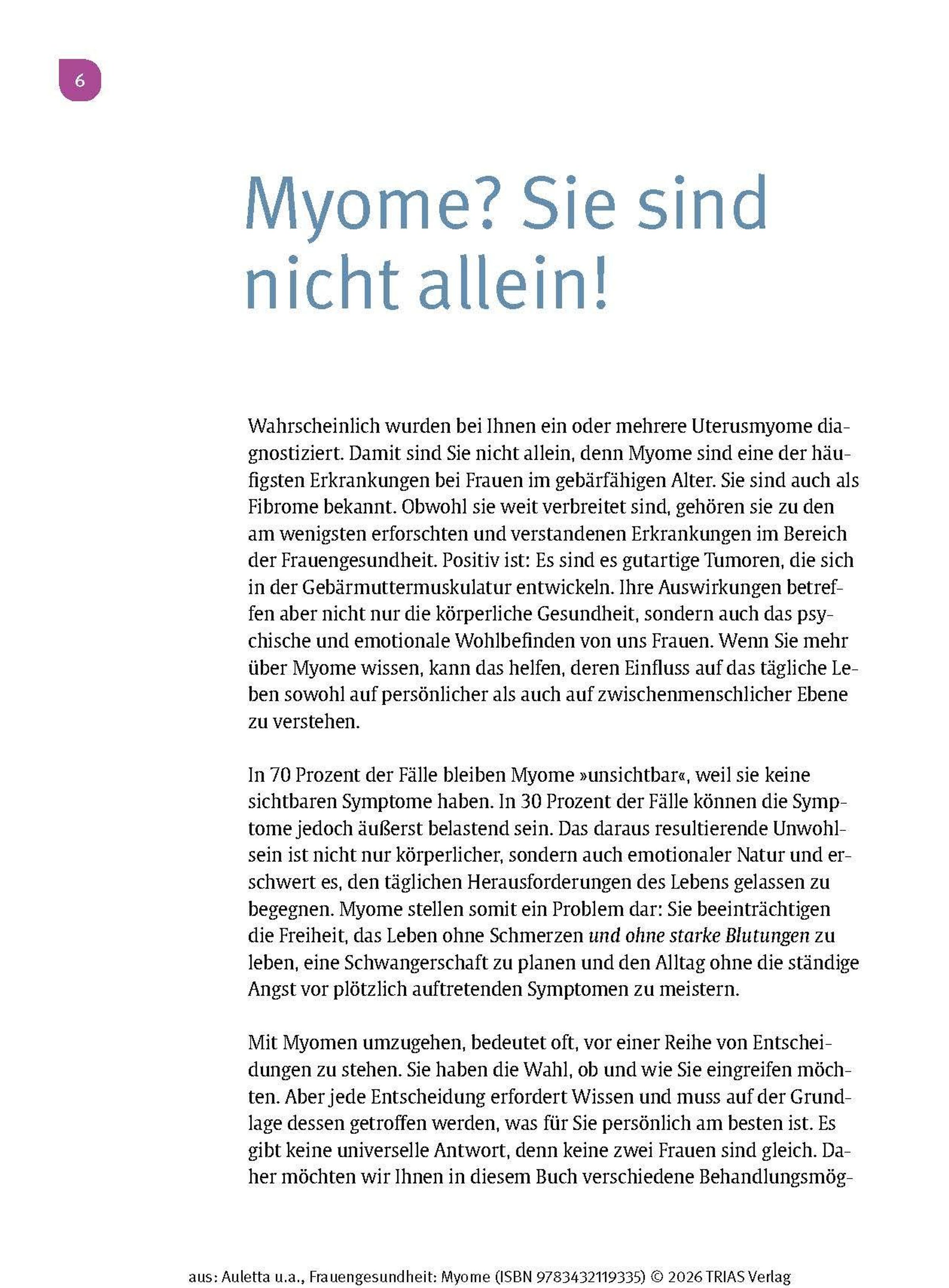 Myome gelten zwar als gutartig, sind aber häufig sehr unangenehm. Sie können Schmerzen im Unterbauch, starke Monatsblutungen, Verstopfung, Rückenschmerzen verursachen und Folgeerkrankungen nach sich ziehen. Auch auf die Fruchtbarkeit und eine Schwangerschaft können sie sich ungünstig auswirken. Aber keine Sorge, Sie müssen sich nicht mit Ihren Myomen abfinden. Dr. Valentina Auletta, Frauenärztin und Myom-Spezialistin, zeigt Ihnen alle wirksamen Therapien auf, die Myomen Einhalt gebieten und Beschwerden effektiv lindern.