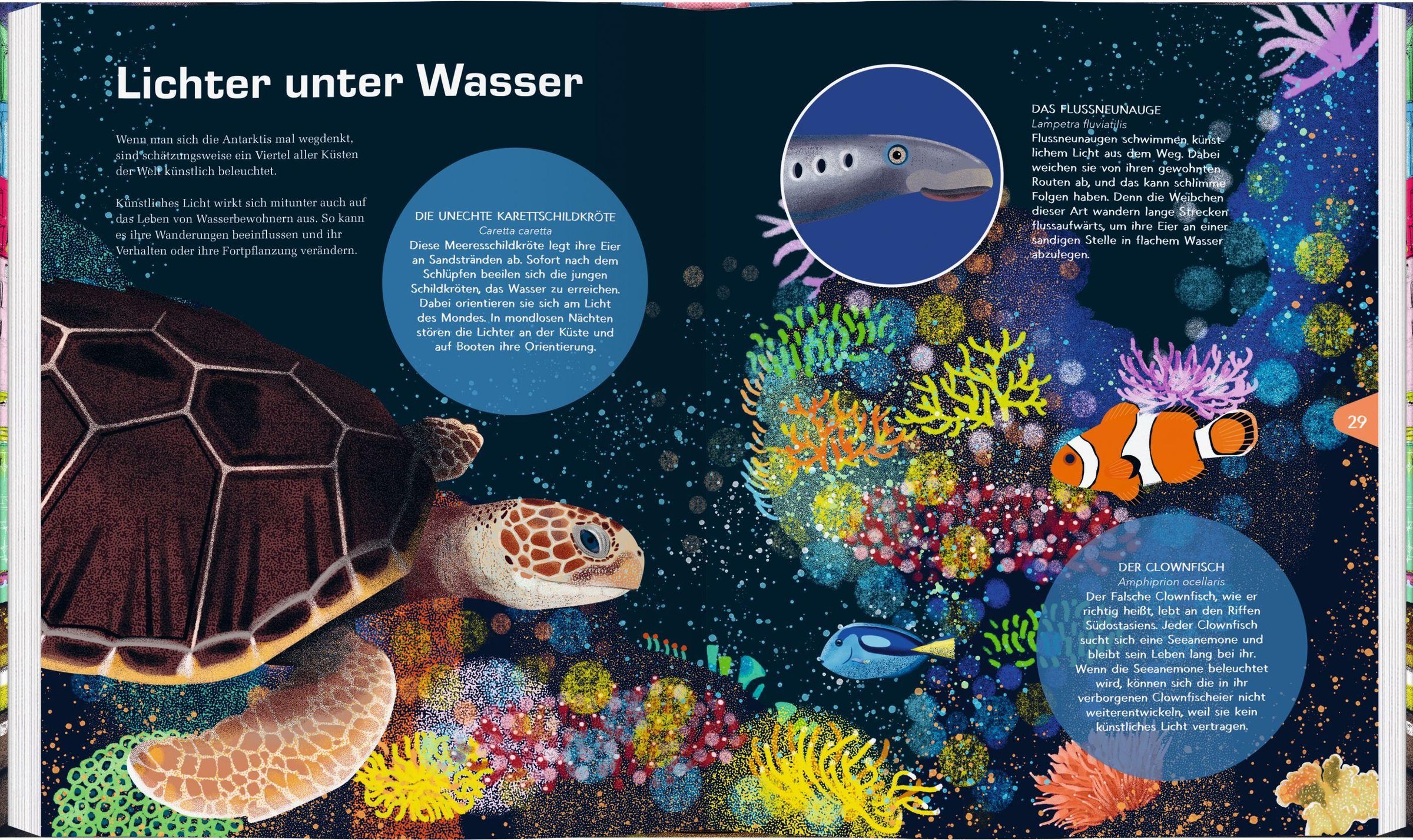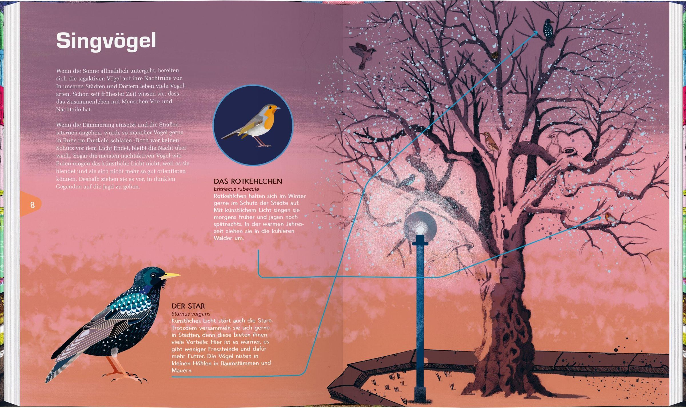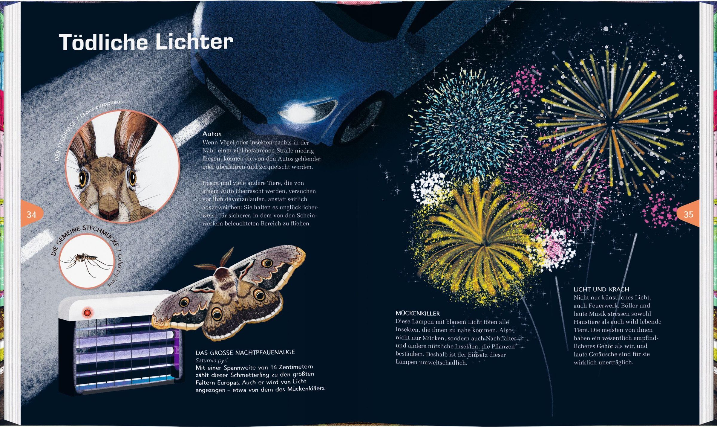 Wenn abends die Sonne untergeht, wird es draußen auf dem Land dunkel. Nicht aber in der Stadt: Straßenlaternen, Werbetafeln und Häuser strahlen um die Wette und vertreiben die Dunkelheit. Doch in den Städten leben nicht nur Menschen, auch Tiere und Pflanzen sind hier zu Hause. Und viele von ihnen erwachen erst nach der Dämmerung. Was tun Eule, Falter und Fledermaus, wenn die Nacht zum Tag wird? Dieses Buch erzählt von Zugvögeln auf Umwegen, Insekten im Bann der Laternen und den Auswirkungen von künstlichem Licht auf unsere Umwelt - von den Wipfeln der Bäume bis in die Tiefe der Meere. Mit spannenden Fakten zum Nachtleben unserer tierischen Nachbarn.