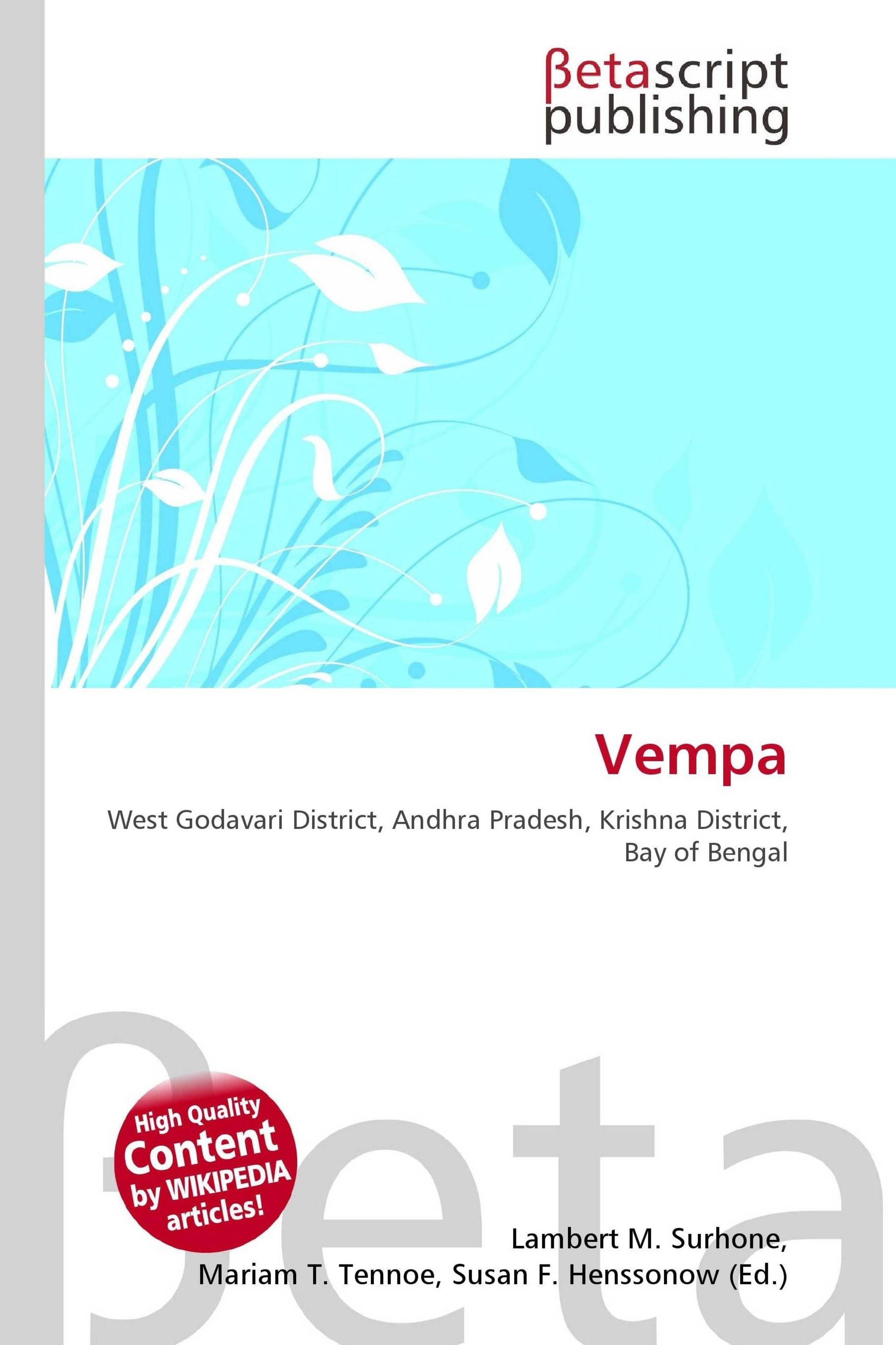 Please note that the content of this book primarily consists of articles available from Wikipedia or other free sources online. Vempa is a village in the West Godavari district of Andhra Pradesh, India. West Godavari District is one of the 23 districts of Andhra Pradesh, India. Eluru, is the district headquarter. The district had a population of 3, 803, 517 of which 9.74% were urban as of 2001. Other important places in the district are Akividu, Achanta, Bhimavaram, Narsapur, Palakollu, Penugonda, Kovvur, Nidadavole, Tallapudi, Tanuku, Tadepalligudem, Attili, Jangareddigudem, Koyyalagudem, Polavaram and Pappikondallu.