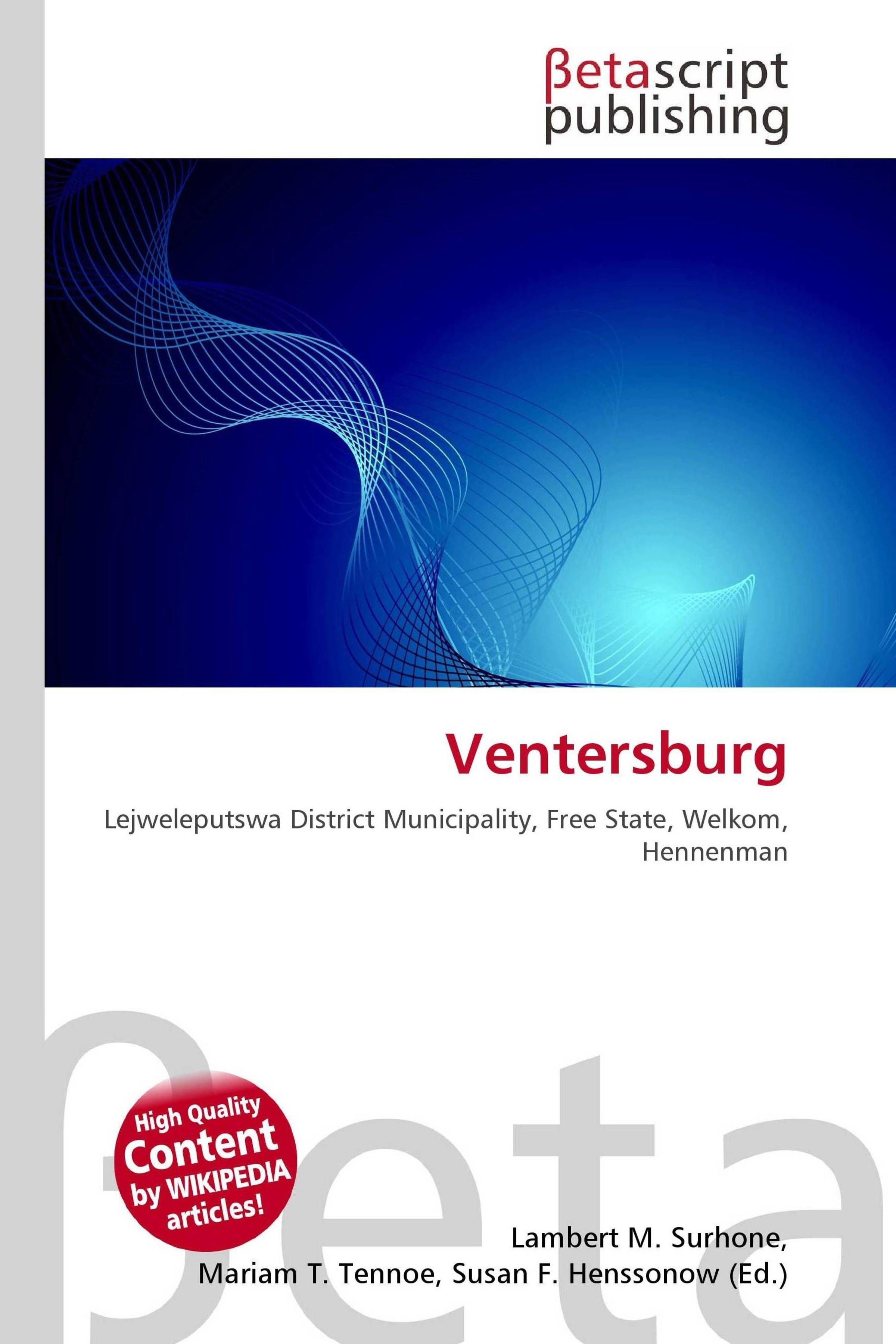 Please note that the content of this book primarily consists of articles available from Wikipedia or other free sources online. Ventersburg is a small town in the Lejweleputswa District Municipality of the Free State province in South Africa. It was established on the farm Kromfontein which was owned by PA Venter who died in 1857. His son allowed a Reform Church to be established on the farm in 1864 and by 1871, the first plots of the original farm were sold. Ventersburg was decared on 6 May 1873. The Dutch Reform Church was built in Ventersburg in 1891 but it was burnt down in 1900 by the British forces during the Boer War. The church was later re-built in 1912.