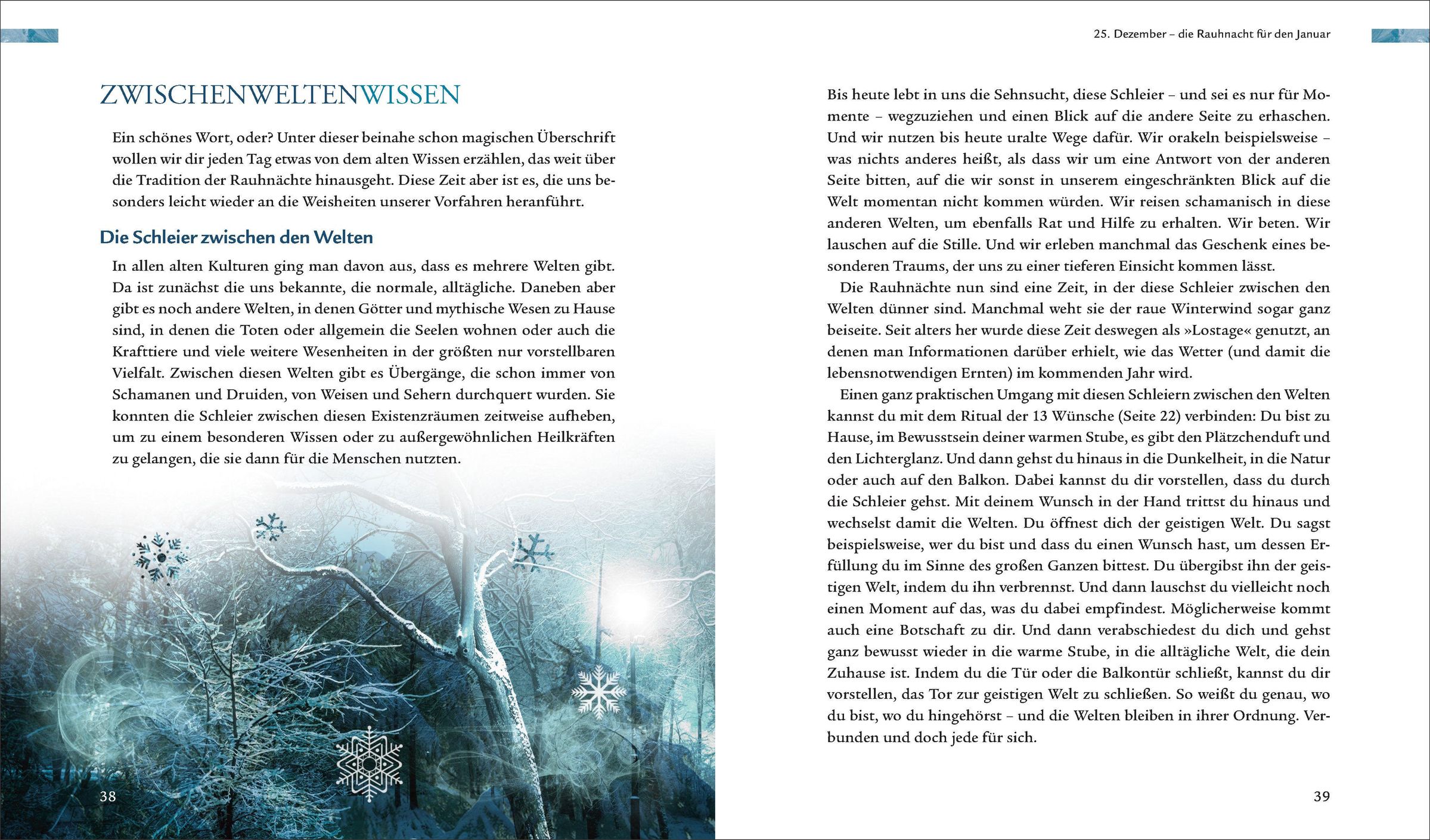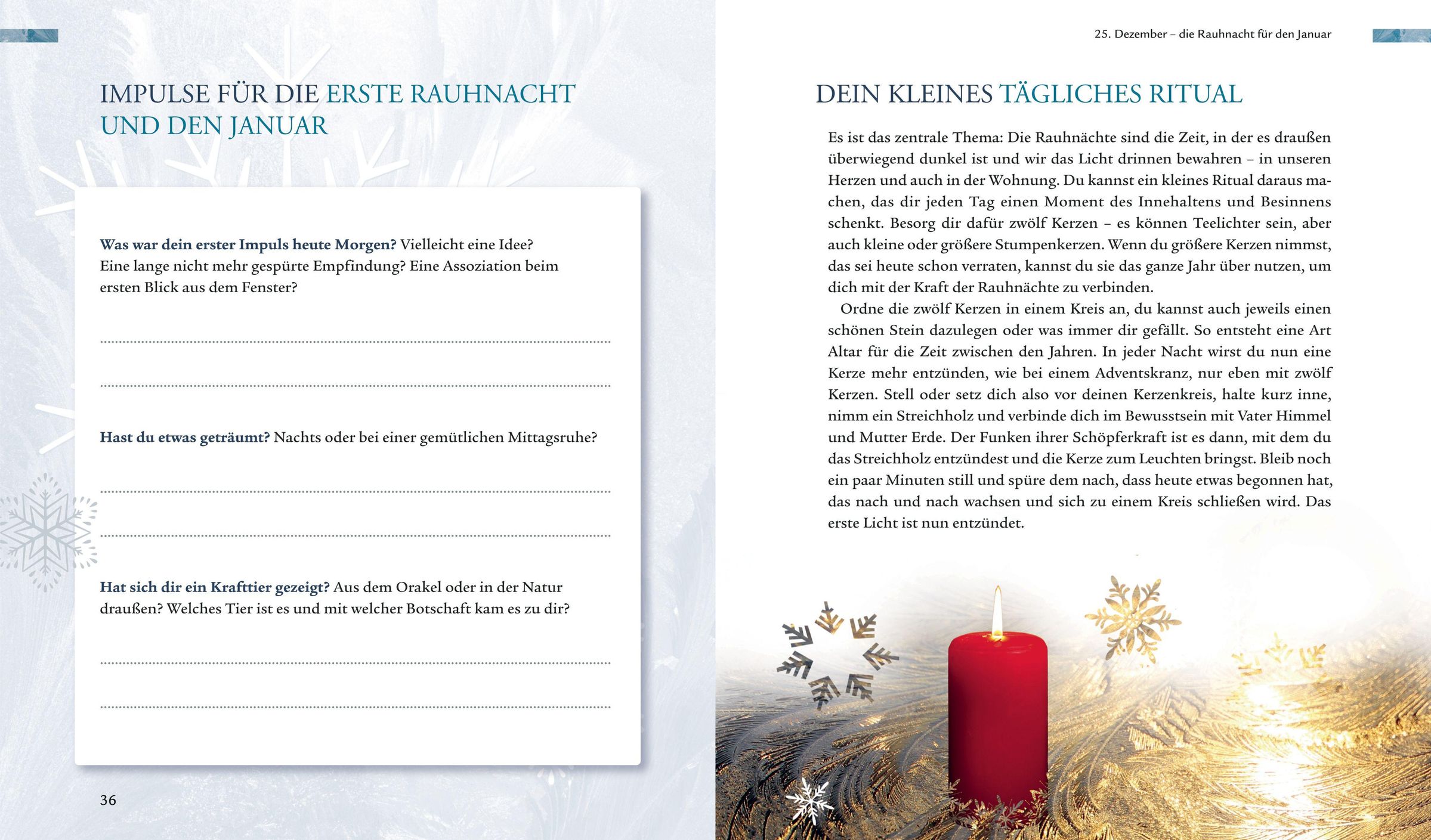 Dieser wunderbar illustrierte persönliche Begleiter durch die Zeit >>zwischen den Jahren<< bietet zahlreiche Anregungen, um alte Bräuche und Traditionen wiederzuentdecken und auf neue, zeitgemäße Weise zu nutzen. Rauhnacht für Rauhnacht findest du hier zahlreiche Anregungen und genügend Raum, um eigene Erfahrungen direkt in diesem Buch zu notieren. Das dabei entstehende Tagebuch kann dich dann das ganze Jahr über begleiten, stärken und inspirieren.