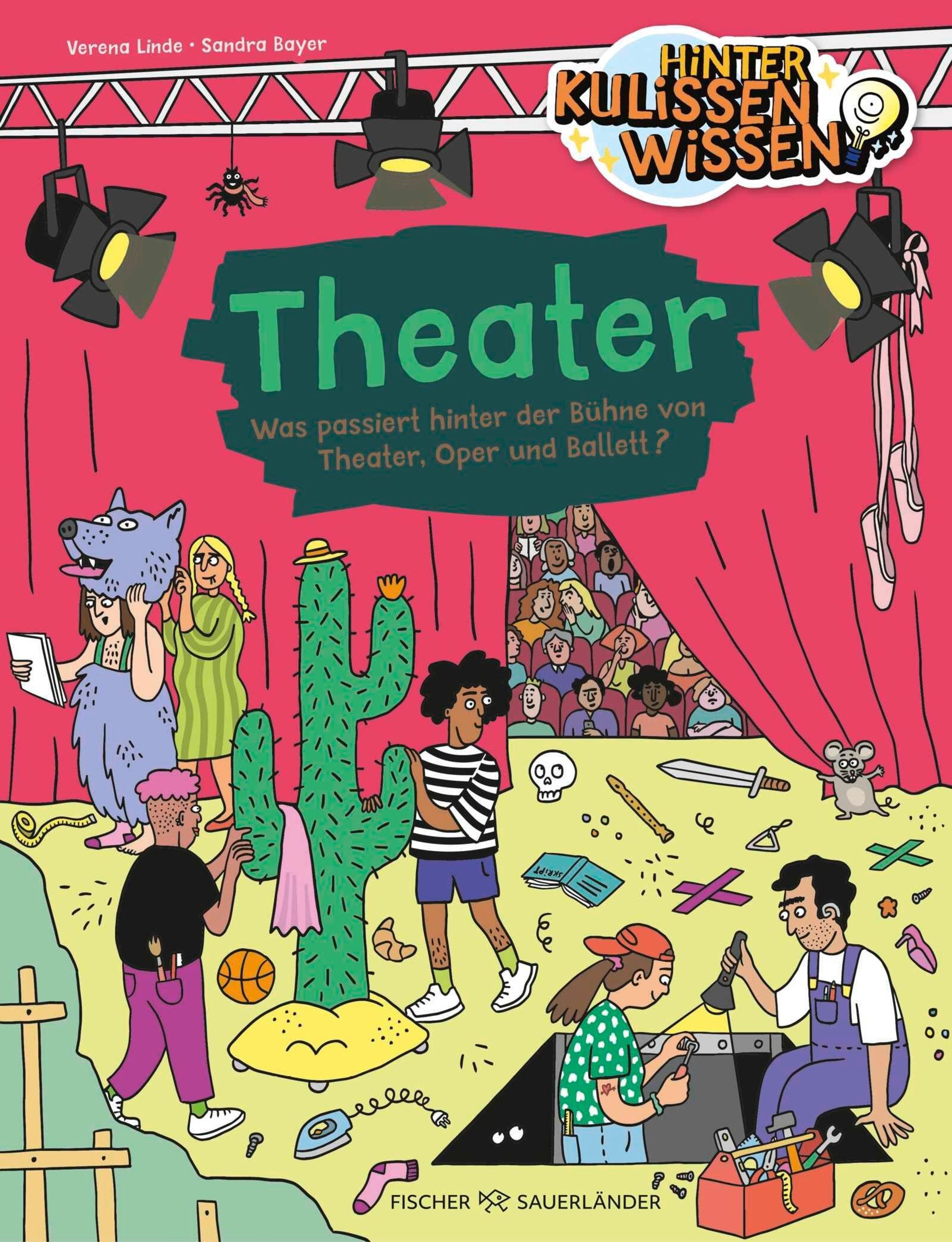 „Theater: Was passiert hinter der Bühne von Theater, Oper und Ballett?“ Illustration von einer bunten Bühnenszene., Buch