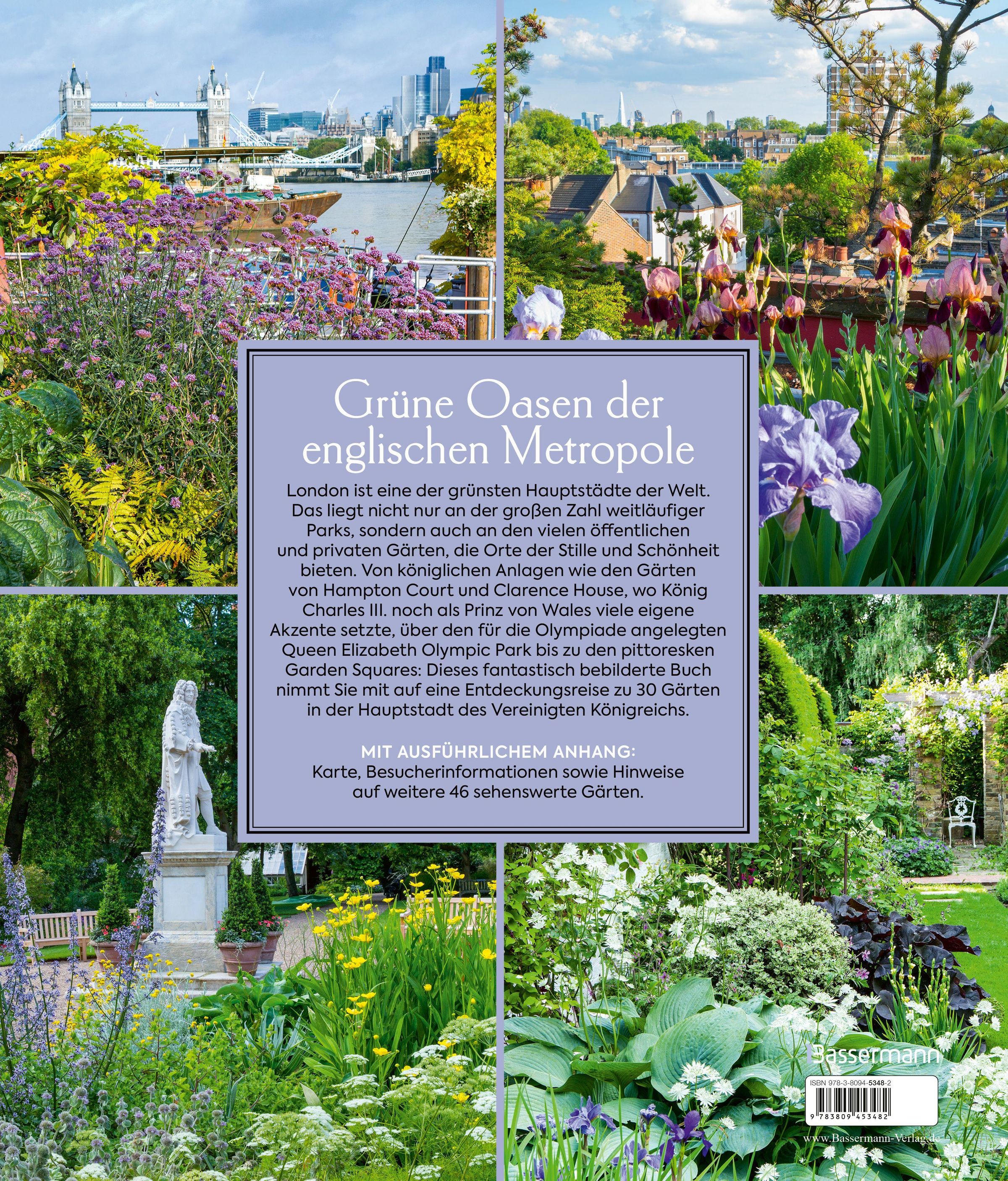 London ist eine der grünsten Hauptstädte der Welt. Das liegt an den weitläufigen Parks und an den vielen öffentlichen und privaten Gärten, die - häufig dem direkten Blick durch Mauern oder dichte Bepflanzung entzogen - Oasen der Stille und Schönheit im lebhaften Stadtleben bieten. Der herausragende Bildband zeigt vielseitige repräsentative Anlagen: den Garten von Downing Street No. 10, Hampton Court, Clarence House, den für die Olympiade angelegten Queen Elizabeth Olympic Park in Stratford, pittoreske Garden Squares oder botanische Highlights wie den Chelsea Physic Garden. Das Buch von Marianne Majerus und Hugo Rittson-Thomas nimmt uns mit auf eine Entdeckungsreise zu 30 bekannten und unbekannten Gärten in der englischen Metropole. Im Anhang befinden sich eine Karte, Besucherinformationen sowie Hinweise auf weitere 46 sehenswerte Gärten.