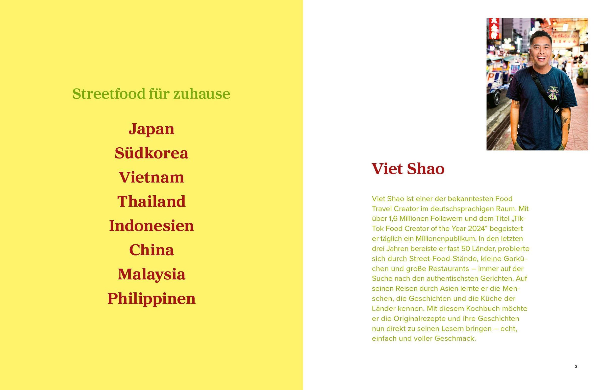 Mit seiner Erfahrung vor Ort und seinem heutigen Leben in München schlägt Viet Shao eine Brücke zwischen den Straßen Asiens und unserer eigenen Küche. So gelingt der Spagat zwischen jungen, frischen Rezeptideen und der Wertschätzung traditioneller Esskultur -- perfekt für alle, die Lust haben, Asien zuhause authentisch zu erleben.