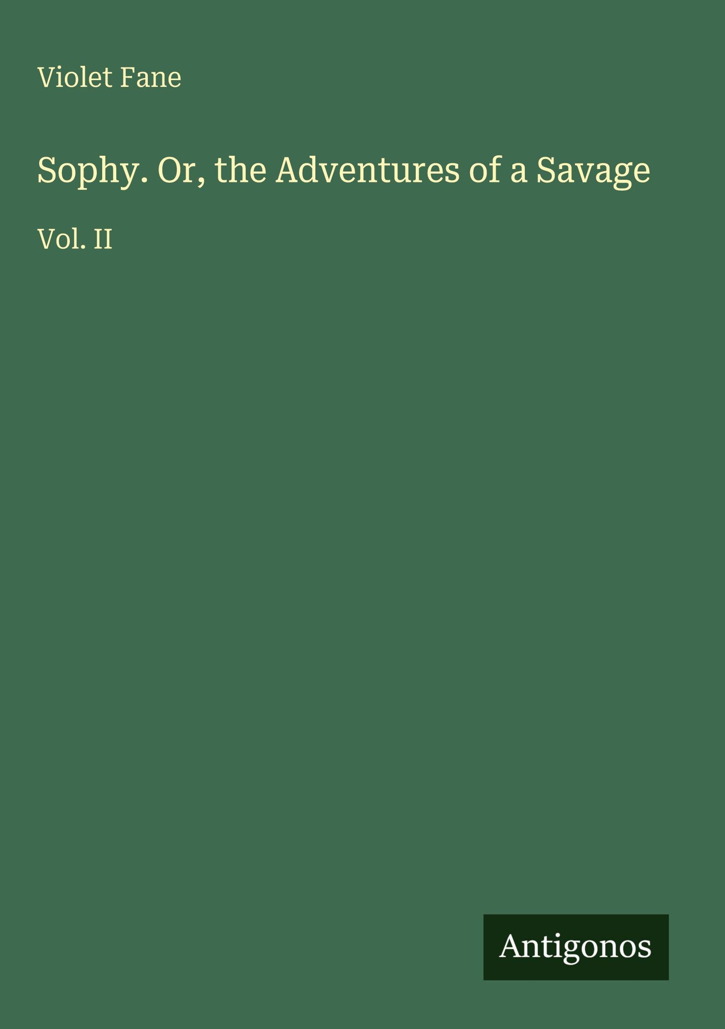 Text: „Violet Fane. Sophy. Or, the Adventures of a Savage Vol. II.“ Unten steht „Antigonos“. Grüner Hintergrund., Buch