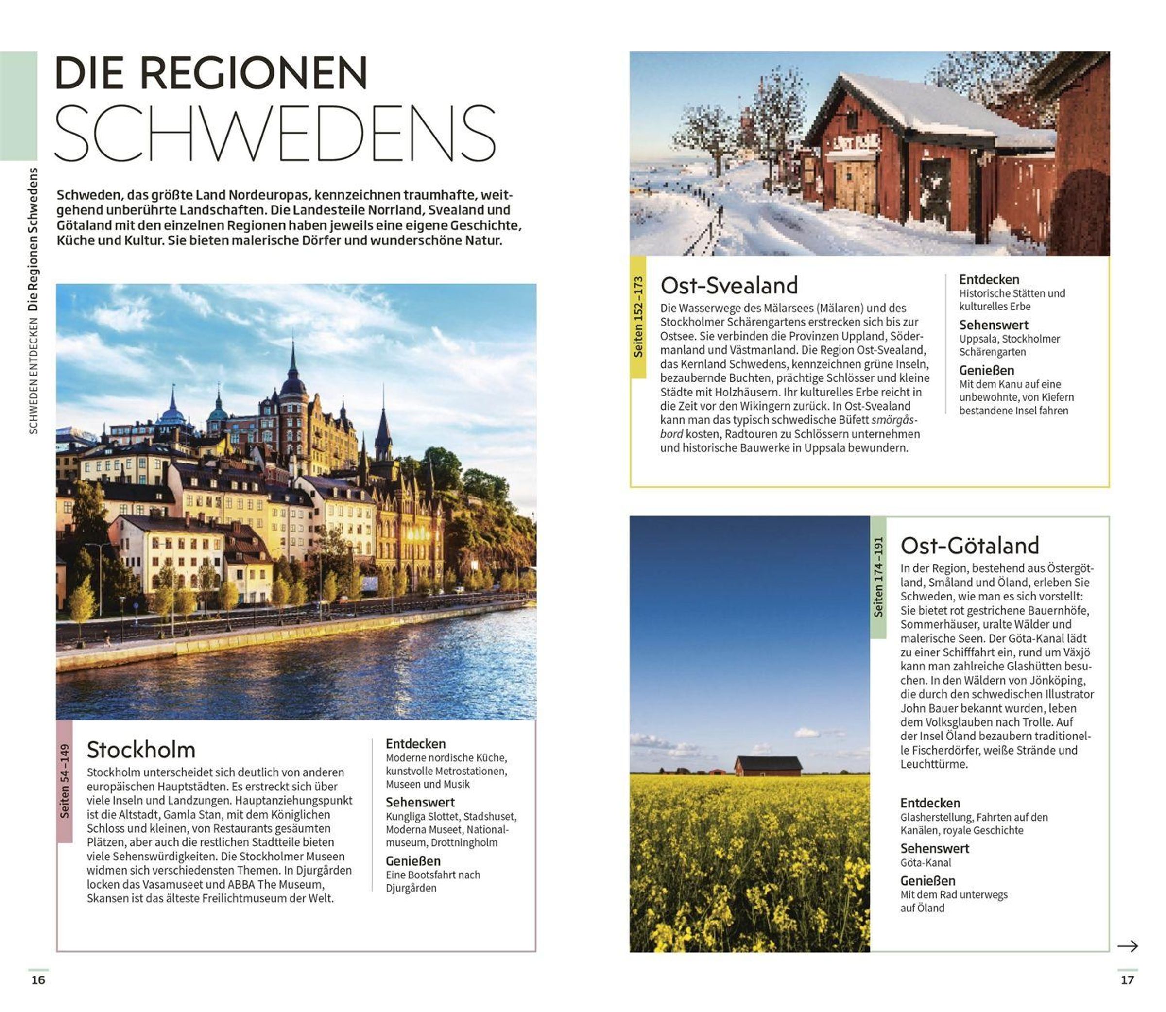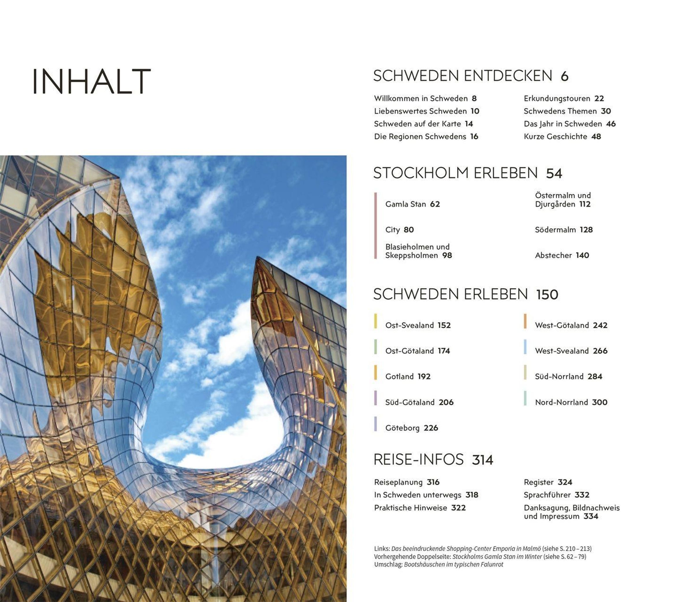 Die einzigartigen 3-D-Illustrationen der Vis-à-Vis Bände bieten Ihnen ganz neue Einblicke in berühmte Gebäude und Sehenswürdigkeiten, darunter das Königliche Schloss in Stockholm oder Schloss Gunnebo mit seinen herrlichen Gärten. Mit den Tourenvorschlägen und handgezeichneten Spaziergängen entdecken Sie faszinierende Landschaften oder Stadtteile wie Göteborgs Zentrum Västa Nordstan oder Visbys Zentrum auf ganz besondere Art und Weise. Bildgewaltige Themenseiten rücken charakteristische Besonderheiten in den Fokus, wie den Lifestyle der Schweden, moderne und traditionelle Architektur oder die schönsten Fotomotive.