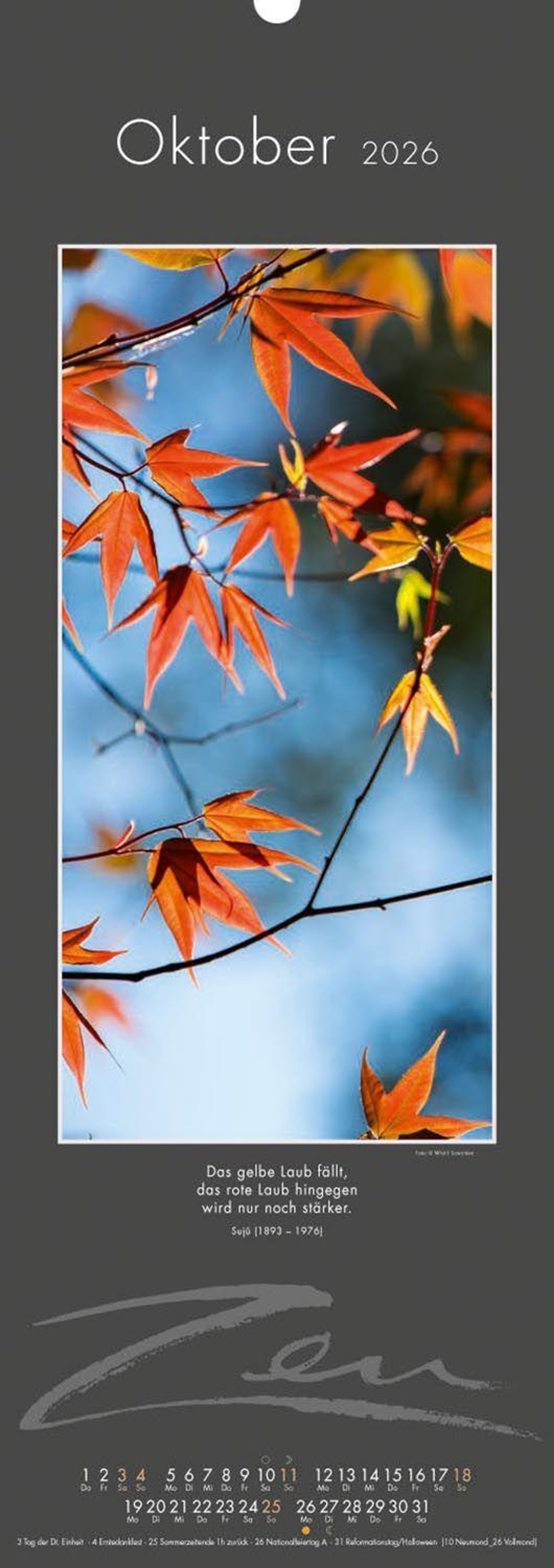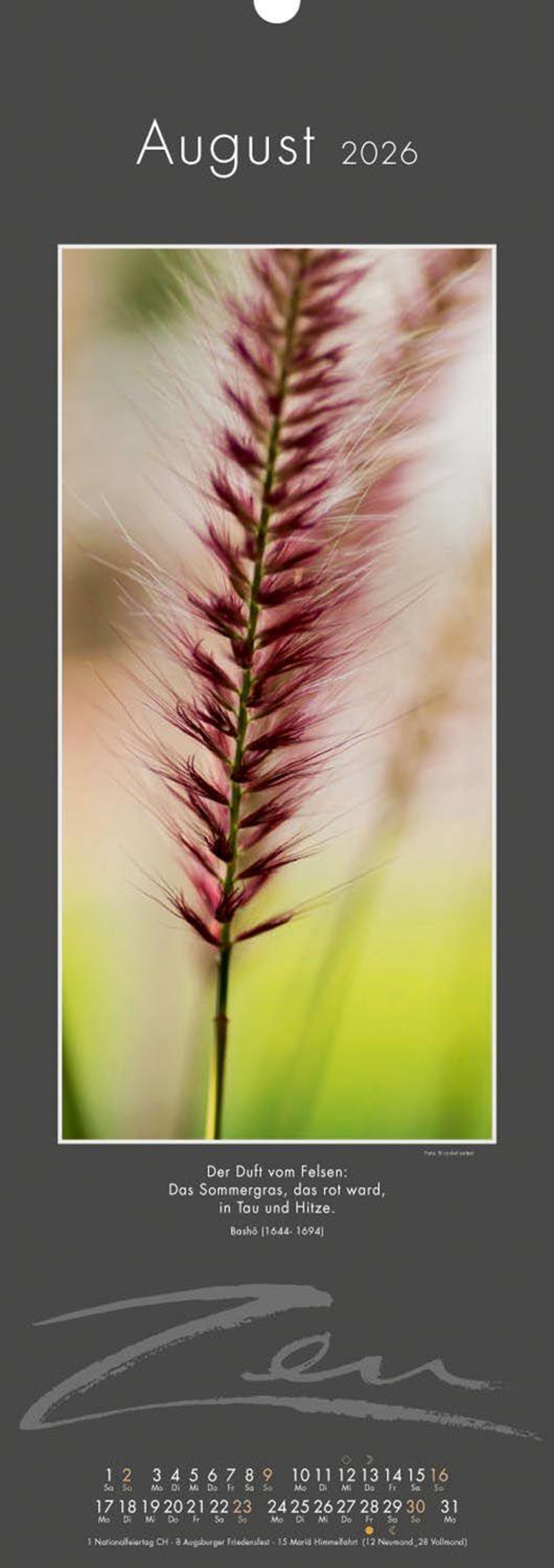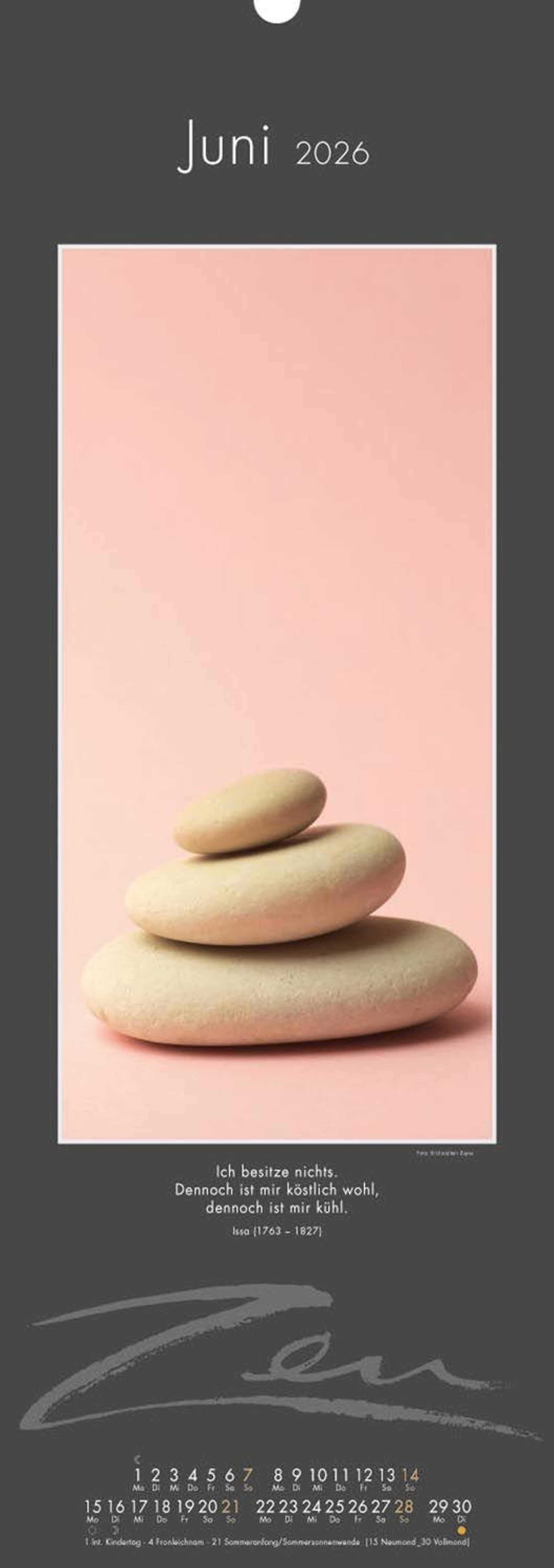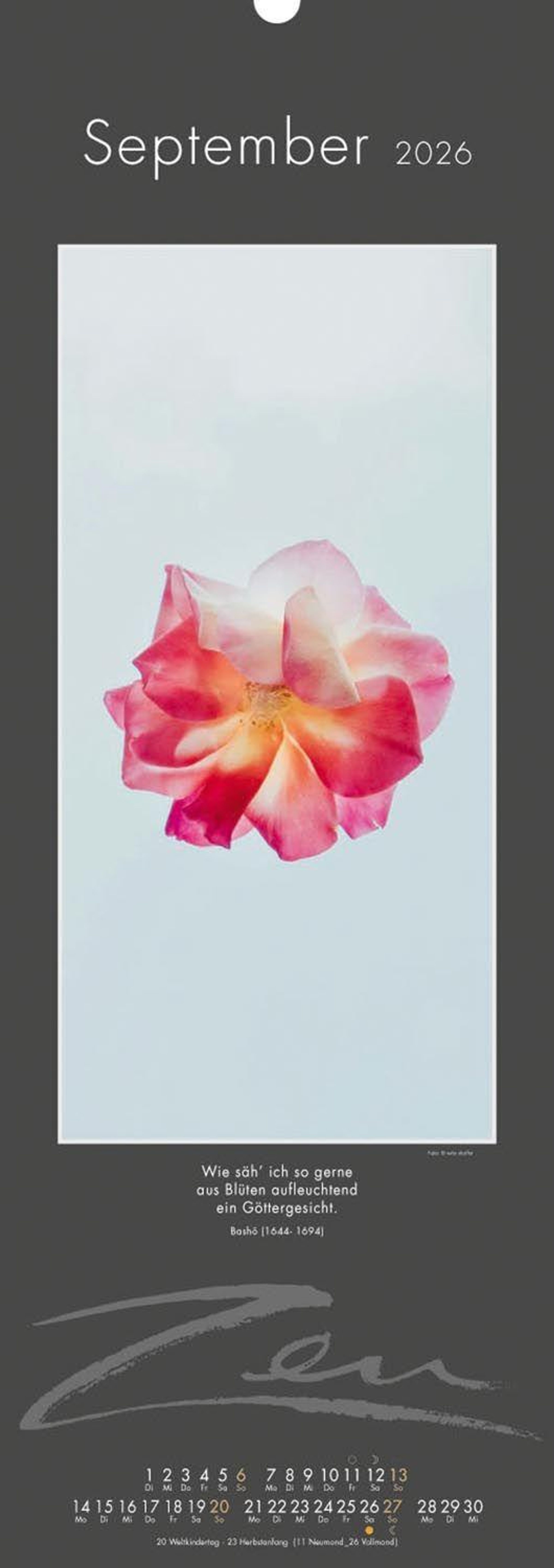 - Hochwertiger Wandkalender, 12 Zen-Bilder, Gräser, Blüten, Steine, Zen-Gärten, meditative Objekte, Titelblatt aus Transparentpapier mit Handschrift, Zen-Gedichte und Haiku, Spiralbindung, Rückseite mit