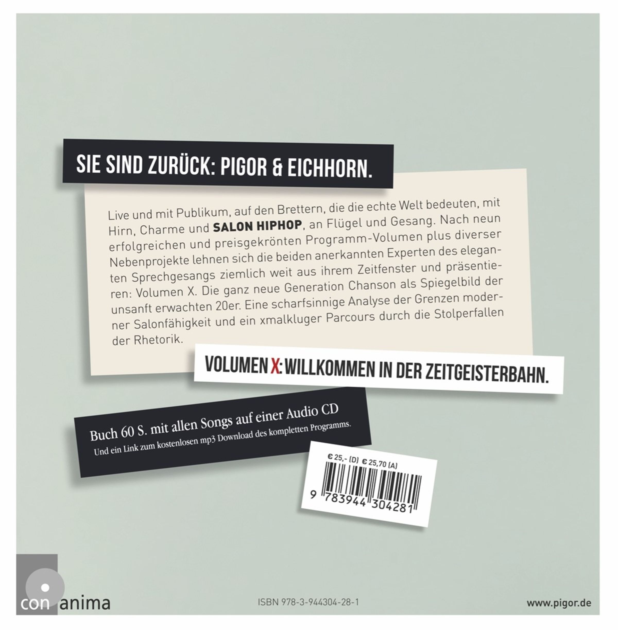 Volumen XSie sind zurück: Pigor & Eichhorn. Live und mit Publikum, auf den Brettern, die die echte Welt bedeuten, mit Hirn, Charme und Salon HipHop, an Flügel und Gesang. Nach neun erfolgreichen und preisgekrönten Programm-Volumen plus diverser Nebenprojekte wäre es nun an der Zeit für die Jubiläumsauflage - doch statt zurückzuschauen, lehnen sich die beiden anerkannten Experten des eleganten Sprechgesangs ziemlich weit aus ihrem Zeitfenster und präsentieren: Volumen X. Die ganz neue Generation C
