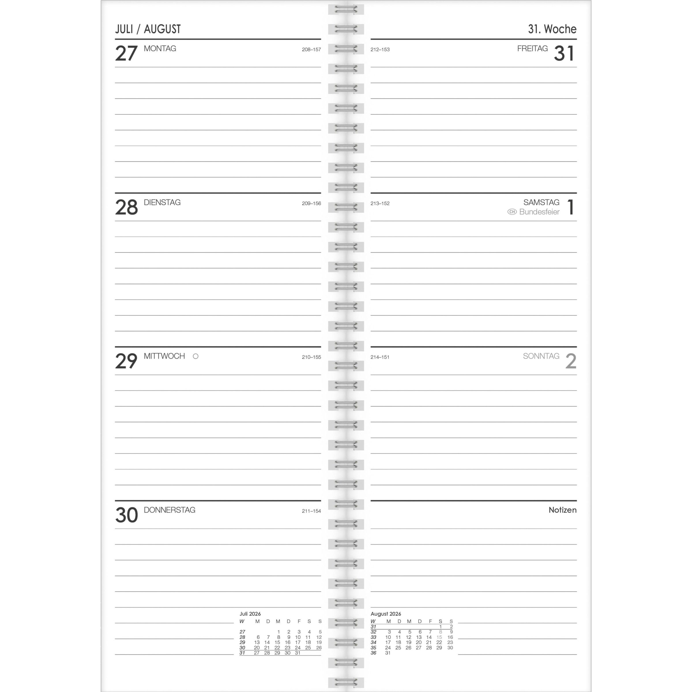 Übersichtliches Kalendarium: 1 Woche auf 2 Seiten, Sonn- und Feiertage hervorgehoben