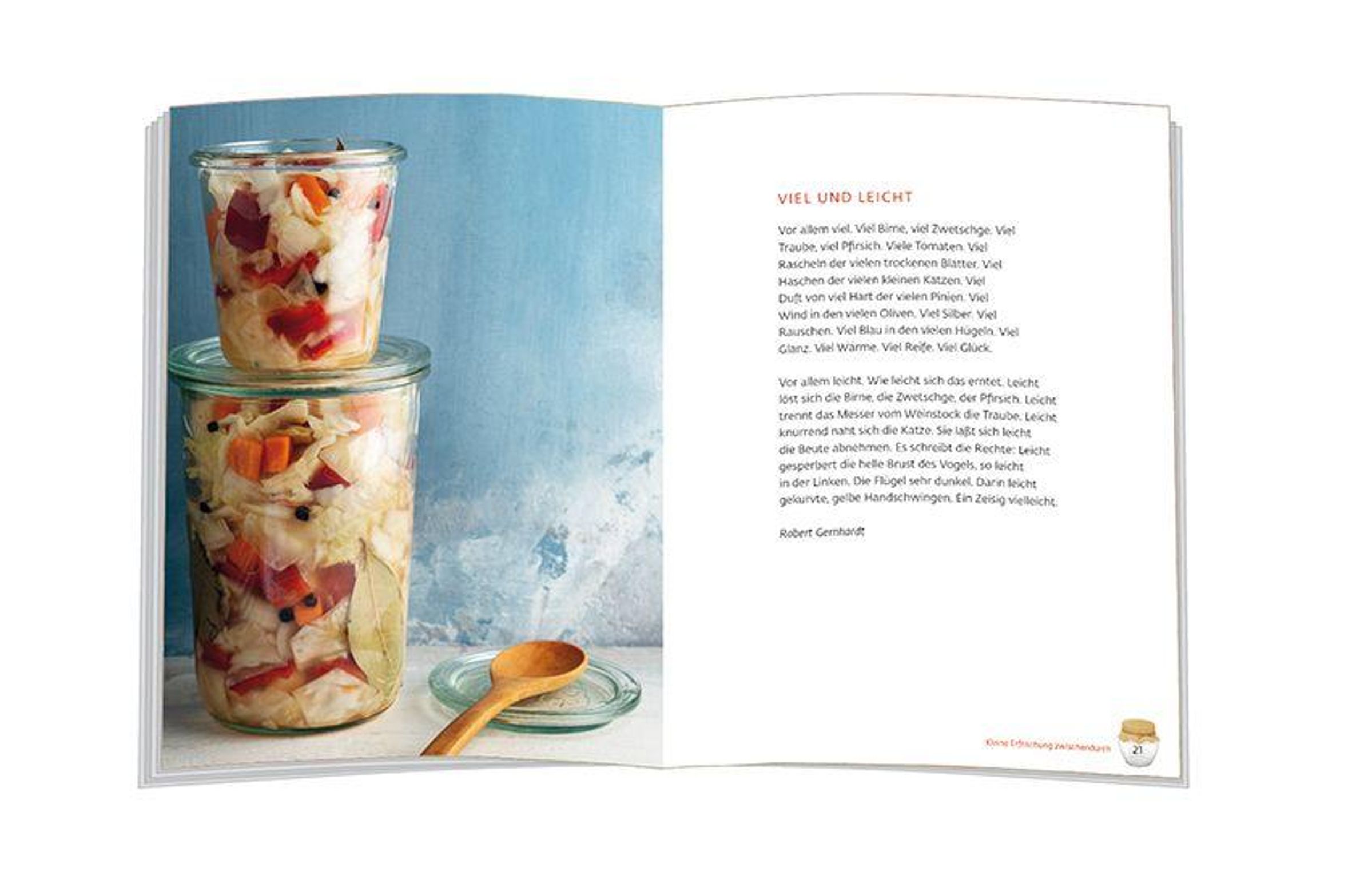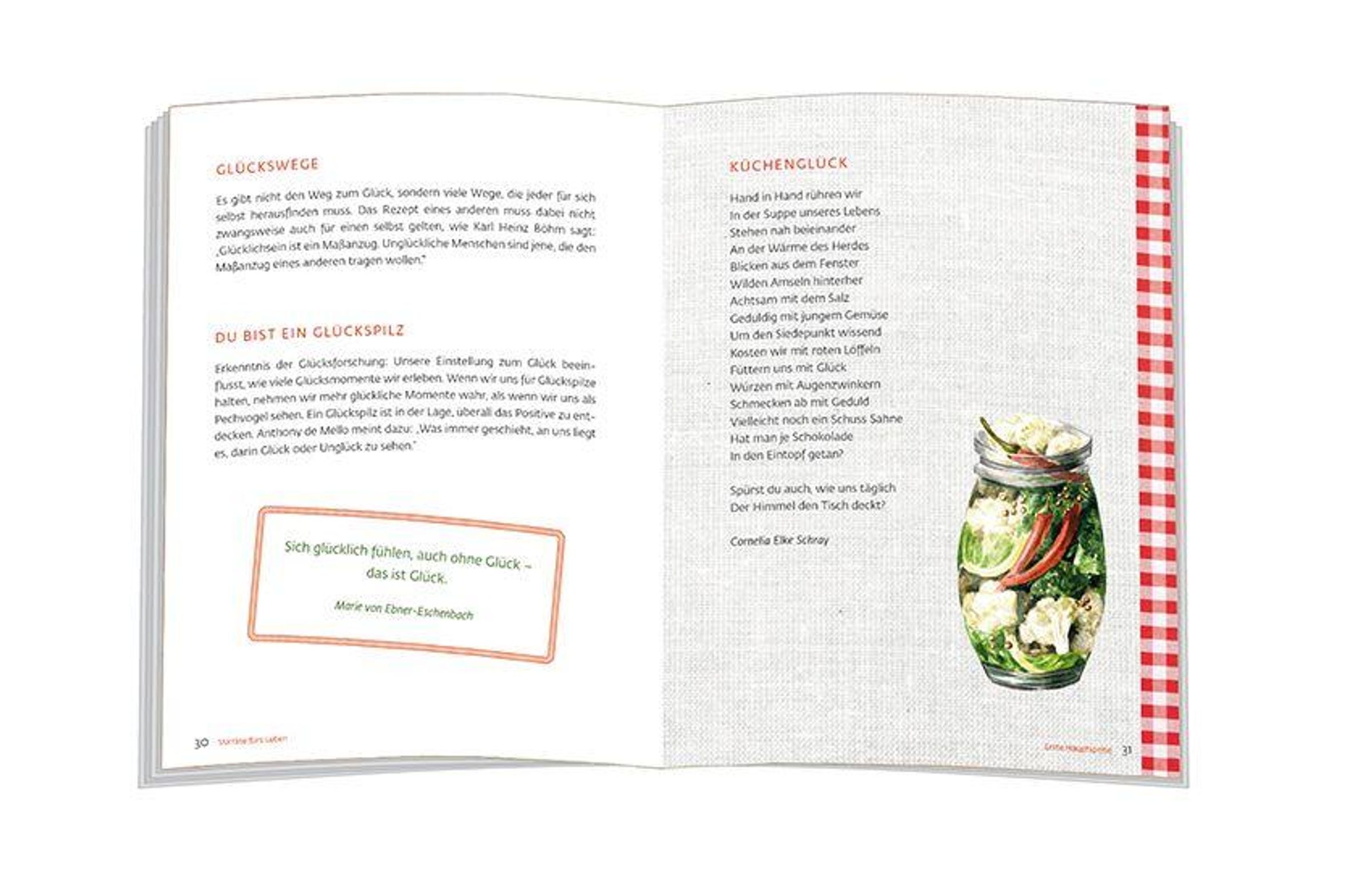 Füllen Sie mit diesen Vorräten Ihre ganz persönliche Speisekammer, und lassen Sie sich von guten Gedanken, weisen Worten und inspirierenden Geschichten stärken. Sie sind Nahrung für Leib und Seele - immer griffbereit und ohne Verfallsdatum. So kann das Leben schmecken. Mit Texten von Doris Dörrie, Max Feigenwinter, Robert Gernhardt, Ilka Haederle, Jörn Heller, Dorothea Kiausch, Bernhard Kraus, Barbara Reik, Isabella Schneider, Corrnelia Elke Schray, David Steindl-Rast, Annemarie Zeyen u. a.