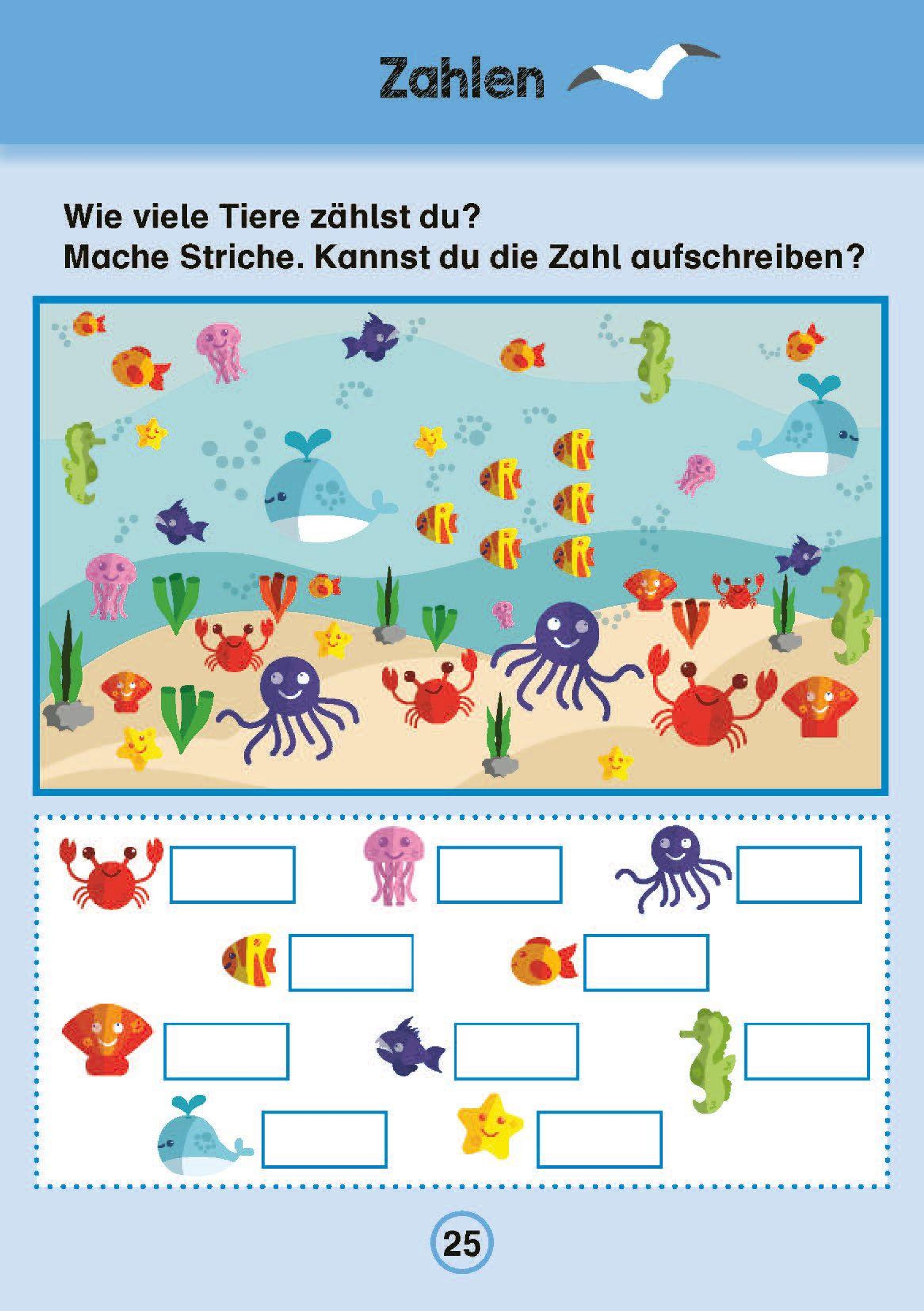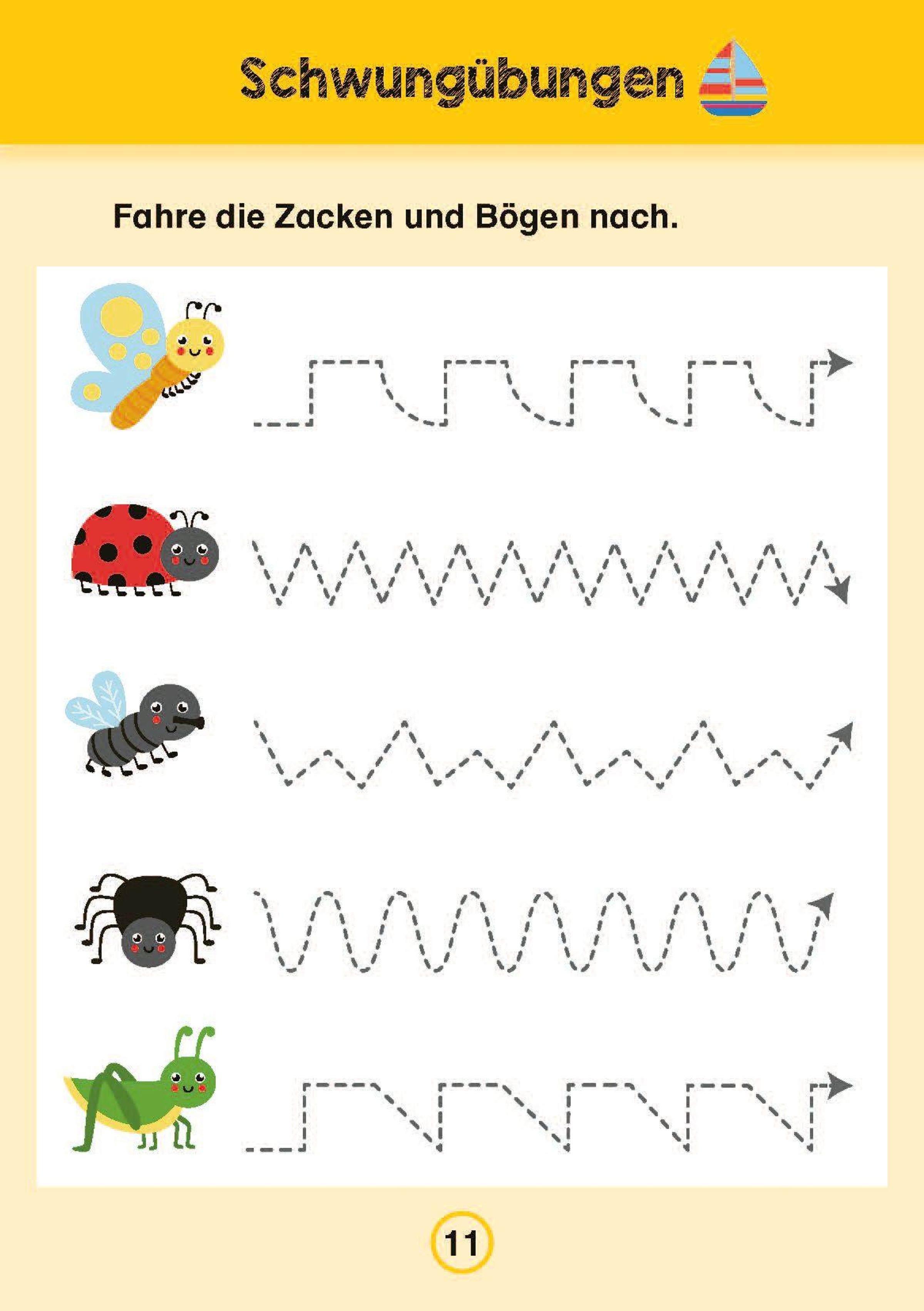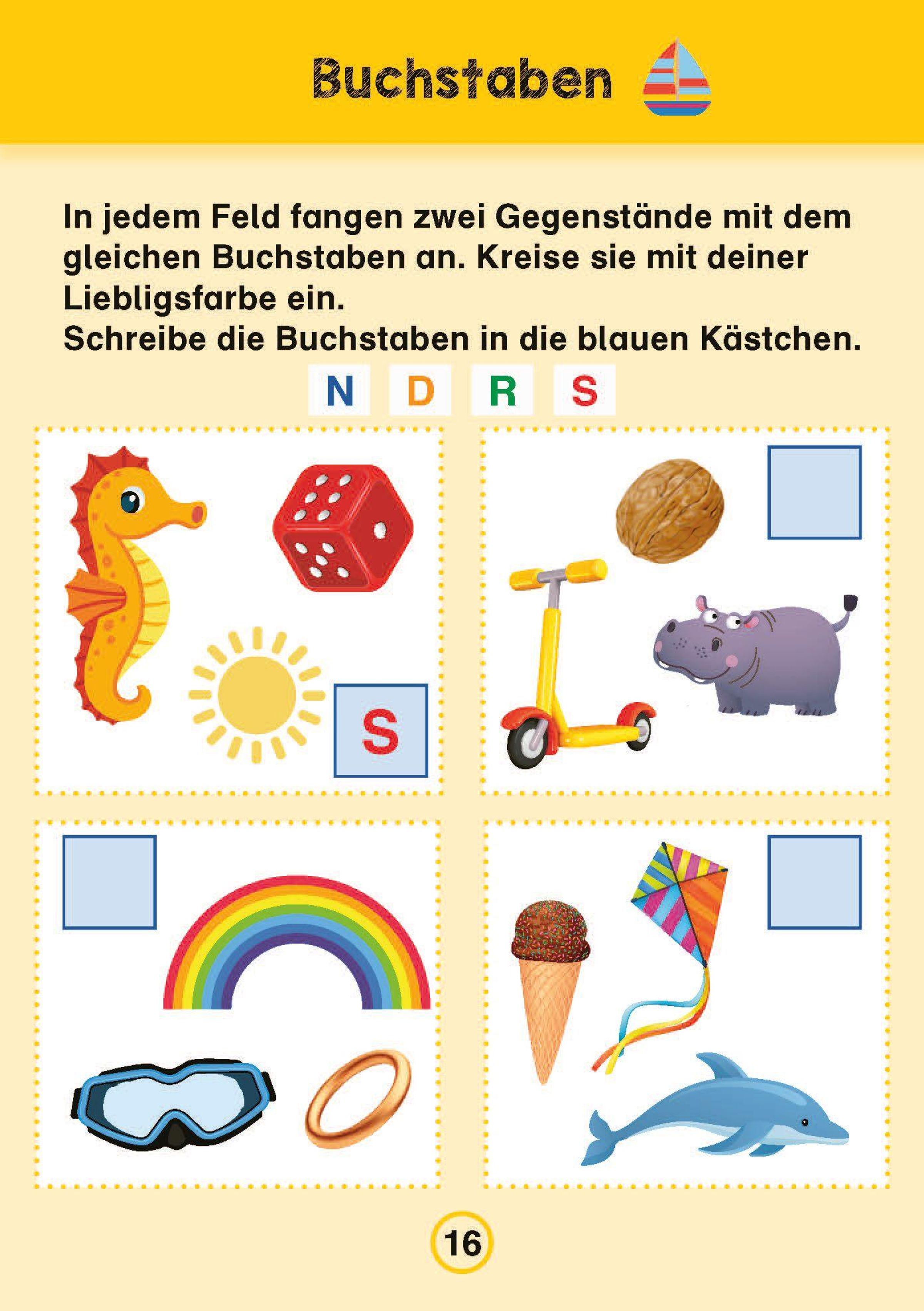 Der Block für Vorschulkinder enthält spielerische Übungen und Rätsel zu den gängigen Bereichen des Vorschulunterrichts, wie Schwungübungen, Buchstaben, Zahlen, Formen, Konzentration und logisches Denken. So üben die Kinder beispielsweise Schwünge anhand von typischen Ferienmotiven, zählen Tiere und verbinden sie dann mit der passenden Zahl, spuren geometrische Formen nach und malen sie aus, verbinden Gegenstände, die mit demselben Anfangsbuchstaben beginnen oder sich reimen, lösen Punkt-zu-Punkt-Aufgaben und vieles mehr.