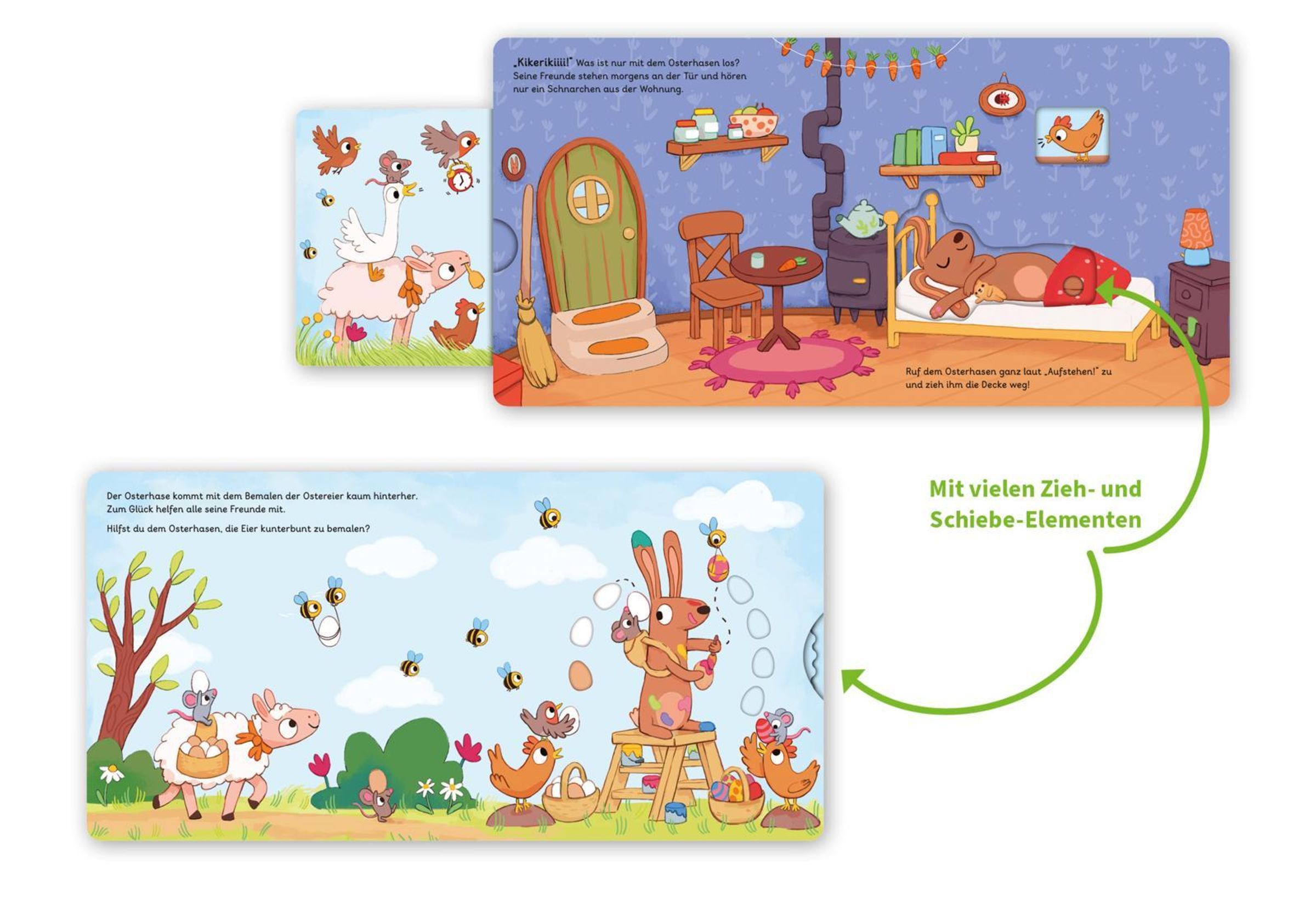 Ostern steht vor der Tür, doch der kleine Osterhase hat verschlafen! Jetzt heißt es: Aufwachen, Eier sammeln, bunt bemalen und schnell verstecken - und dabei braucht der Osterhase die Hilfe der Kinder. Mit lustigen Schiebe- und Dreheffekten können die Kleinen selbst aktiv werden. Jetzt kann der Osterhase seine morgendlichen Turnübungen machen, bei den Hühnern die Eier abholen, diese schön bemalen und mit seinen Freunden auf dem Motorrad davonbrausen. So wird die Geschichte lebendig und fördert ganz nebenbei die Feinmotorik.