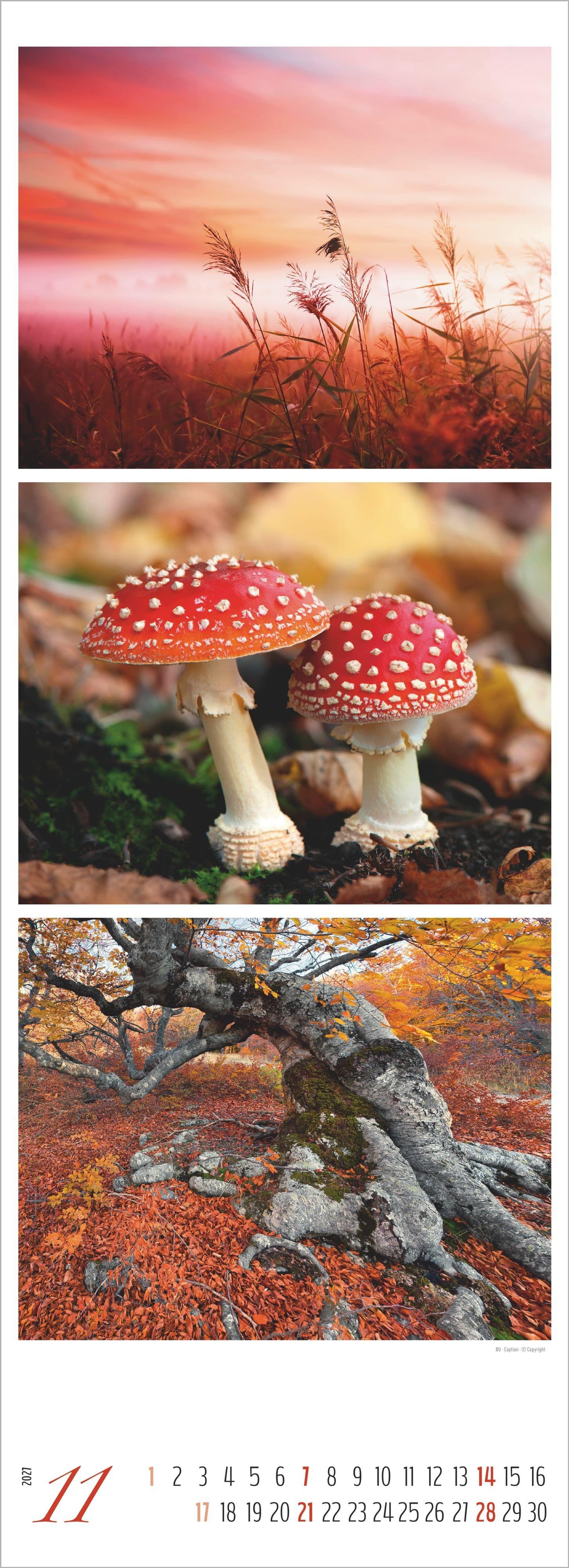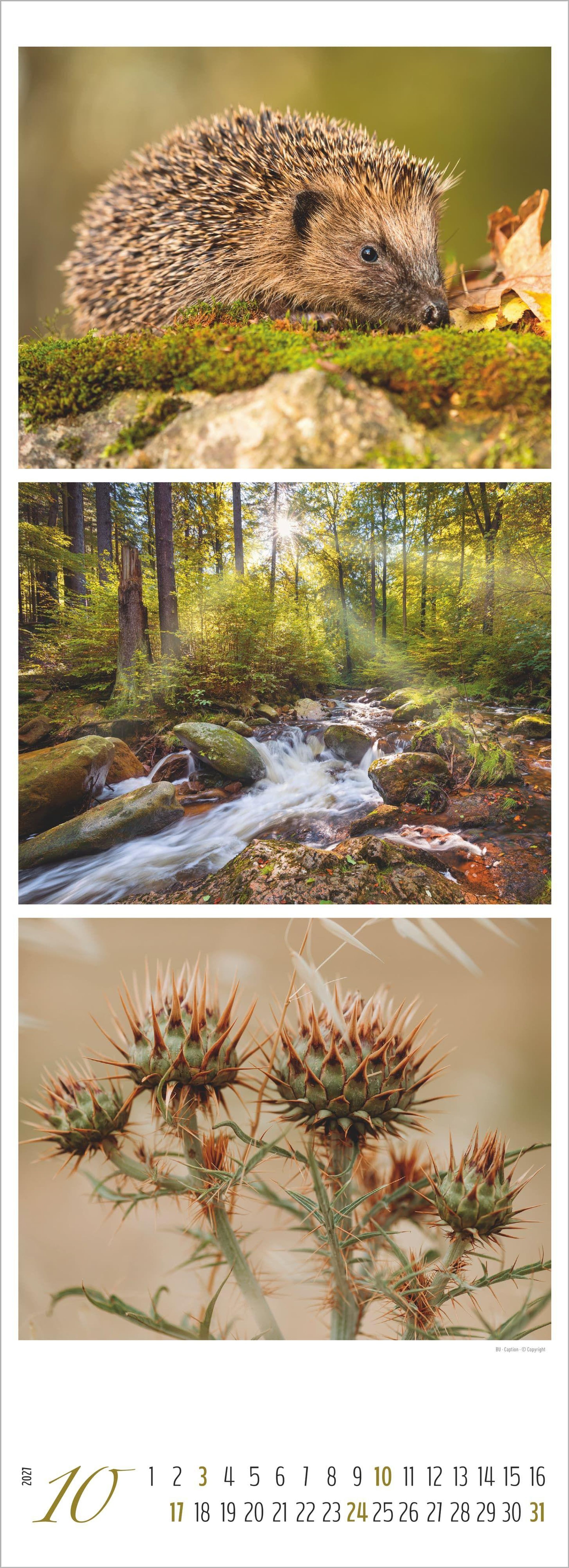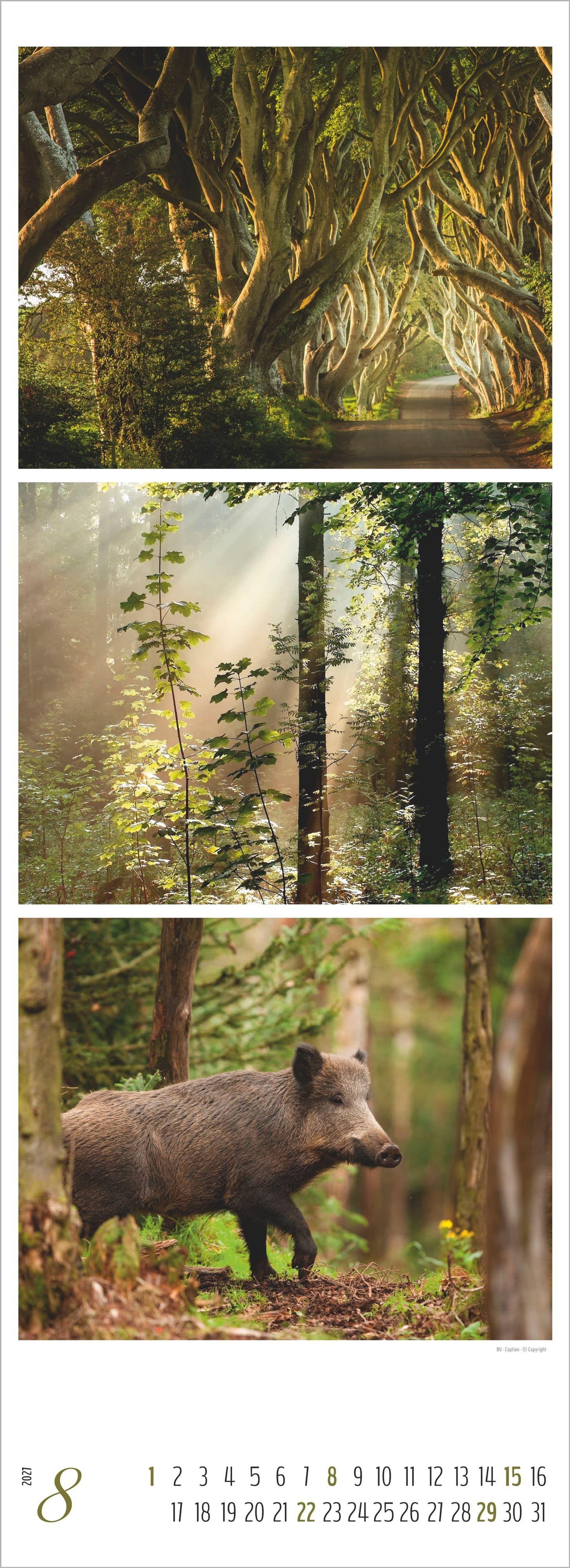 Triplets-Design: Drei harmonisch aufeinander abgestimmte Bildmotive pro Monat, die das Waldleben in Szene setzen.