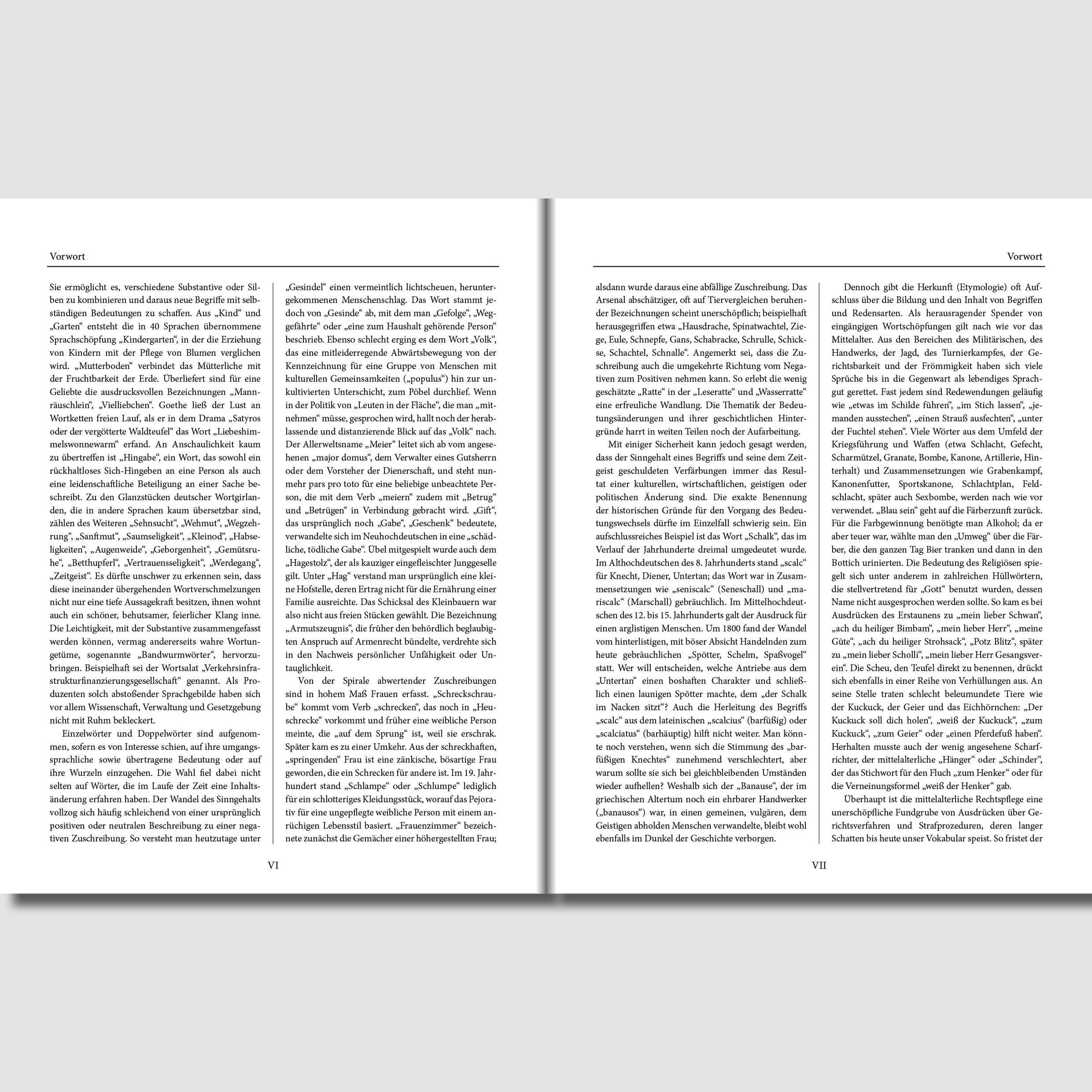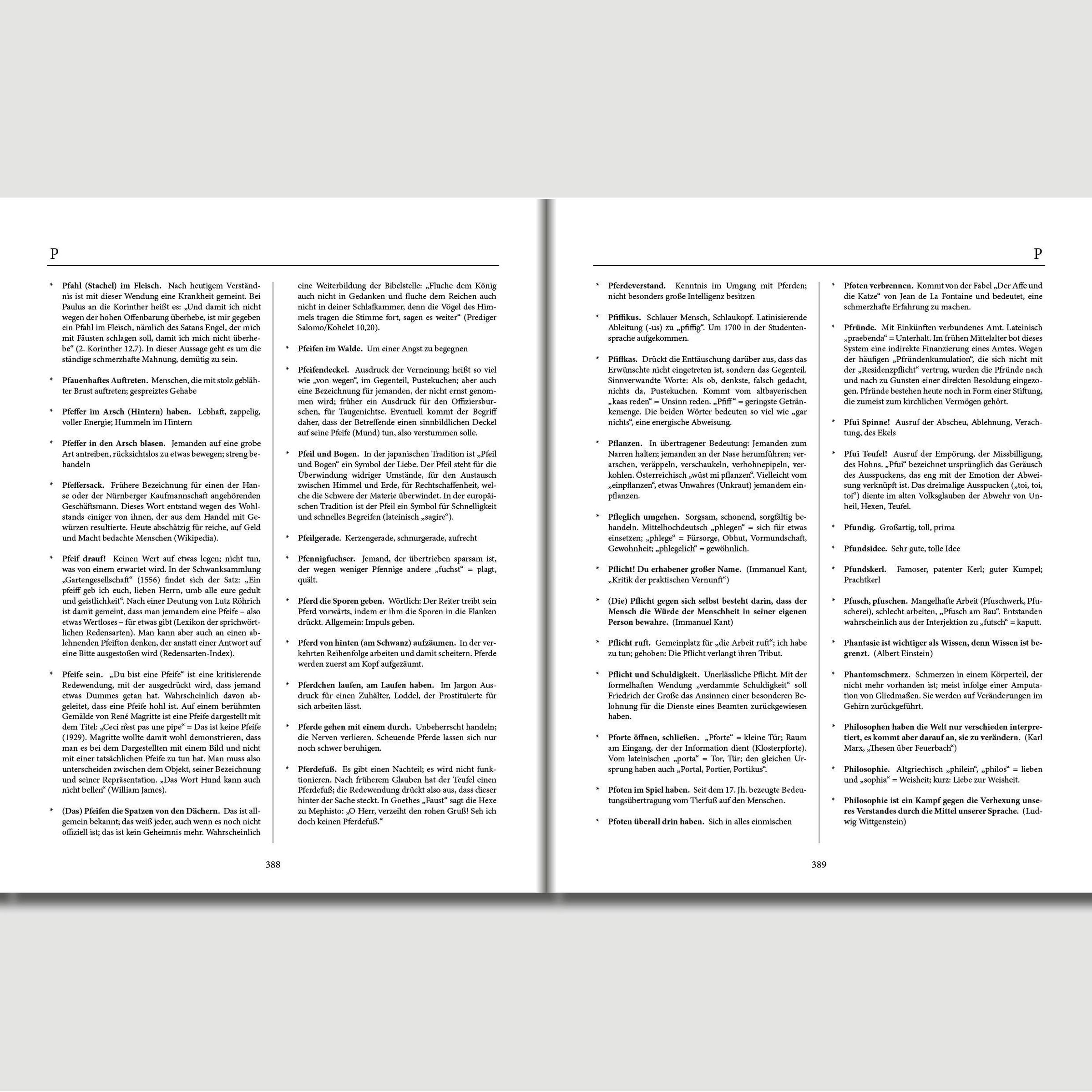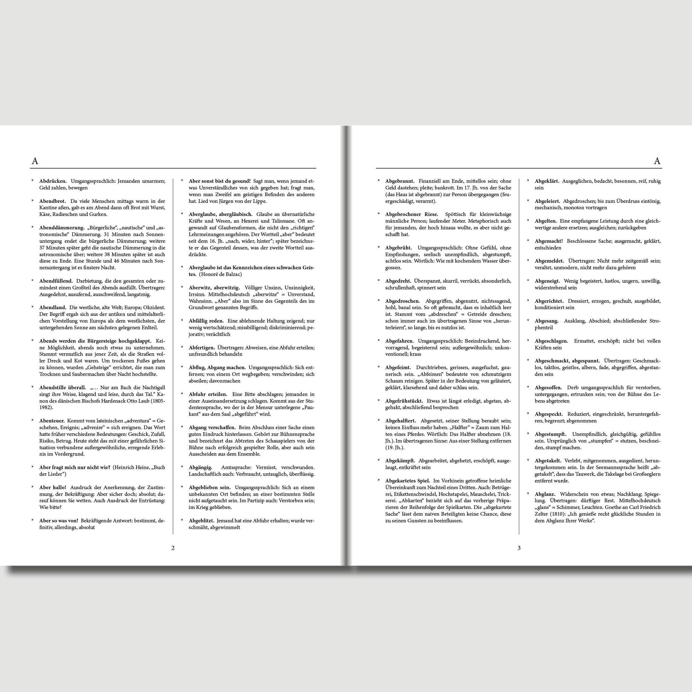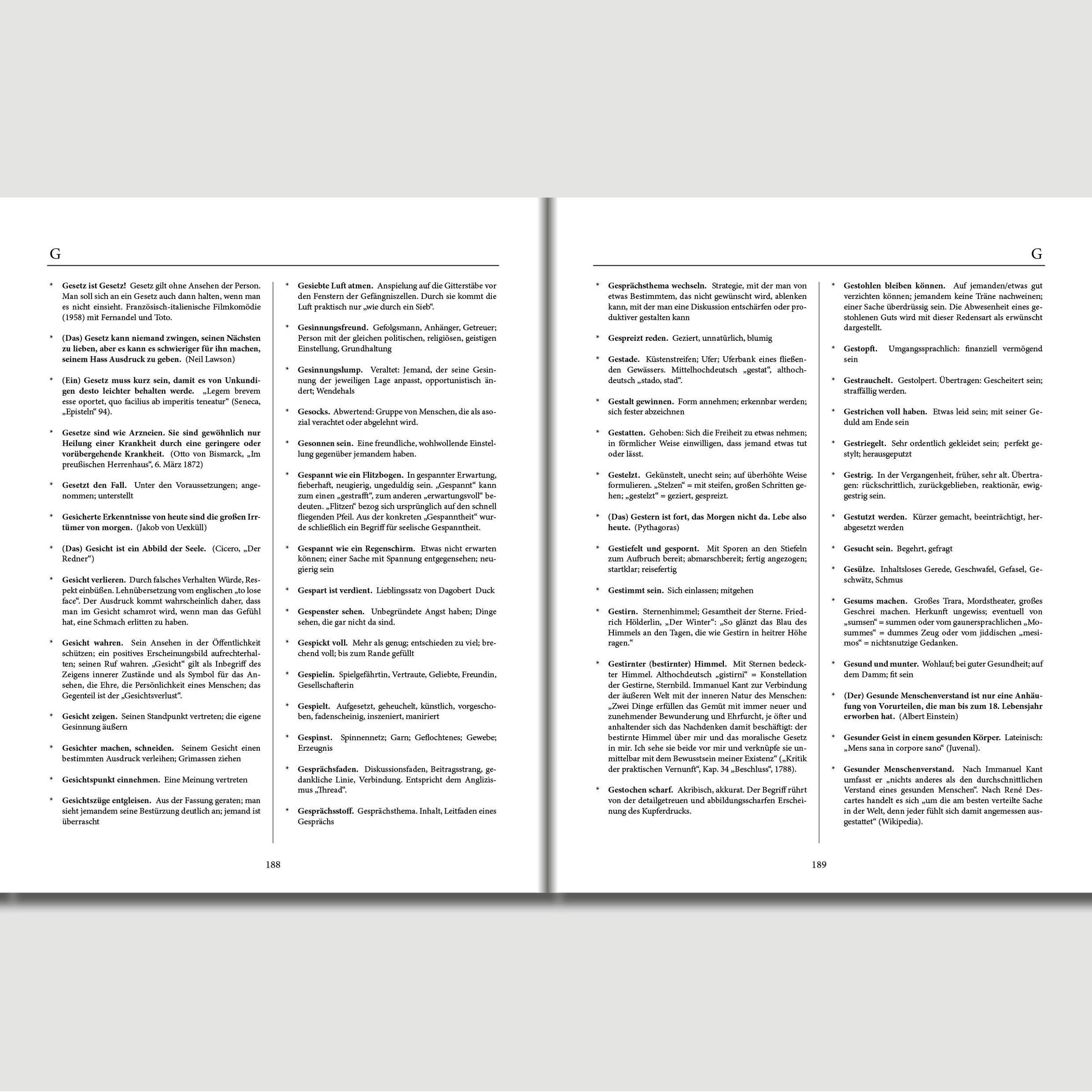 Inhaltlich stehen Redensarten, Sprichwörter, halb vergessene und zusammengesetzte Worte, Umgangssprachliches, Wissenswertes sowie Aphorismen und Zitate im Vordergrund. In ihnen bildet sich ein breites Spektrum einprägsamer Bilder und gehaltvoller Bedeutungen ab, die einen Großteil unserer Gedankenwelt und Kommunikation ausmachen.