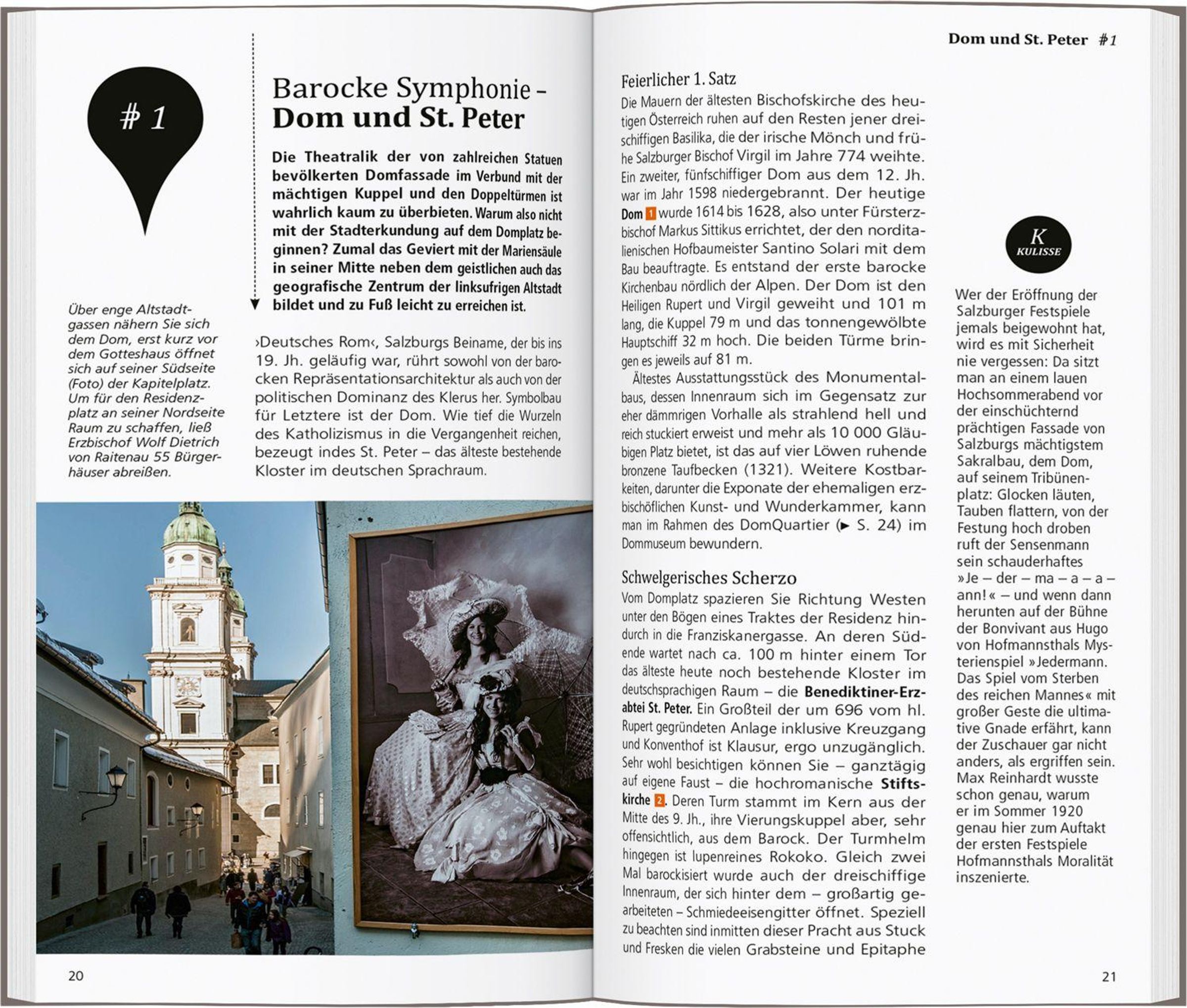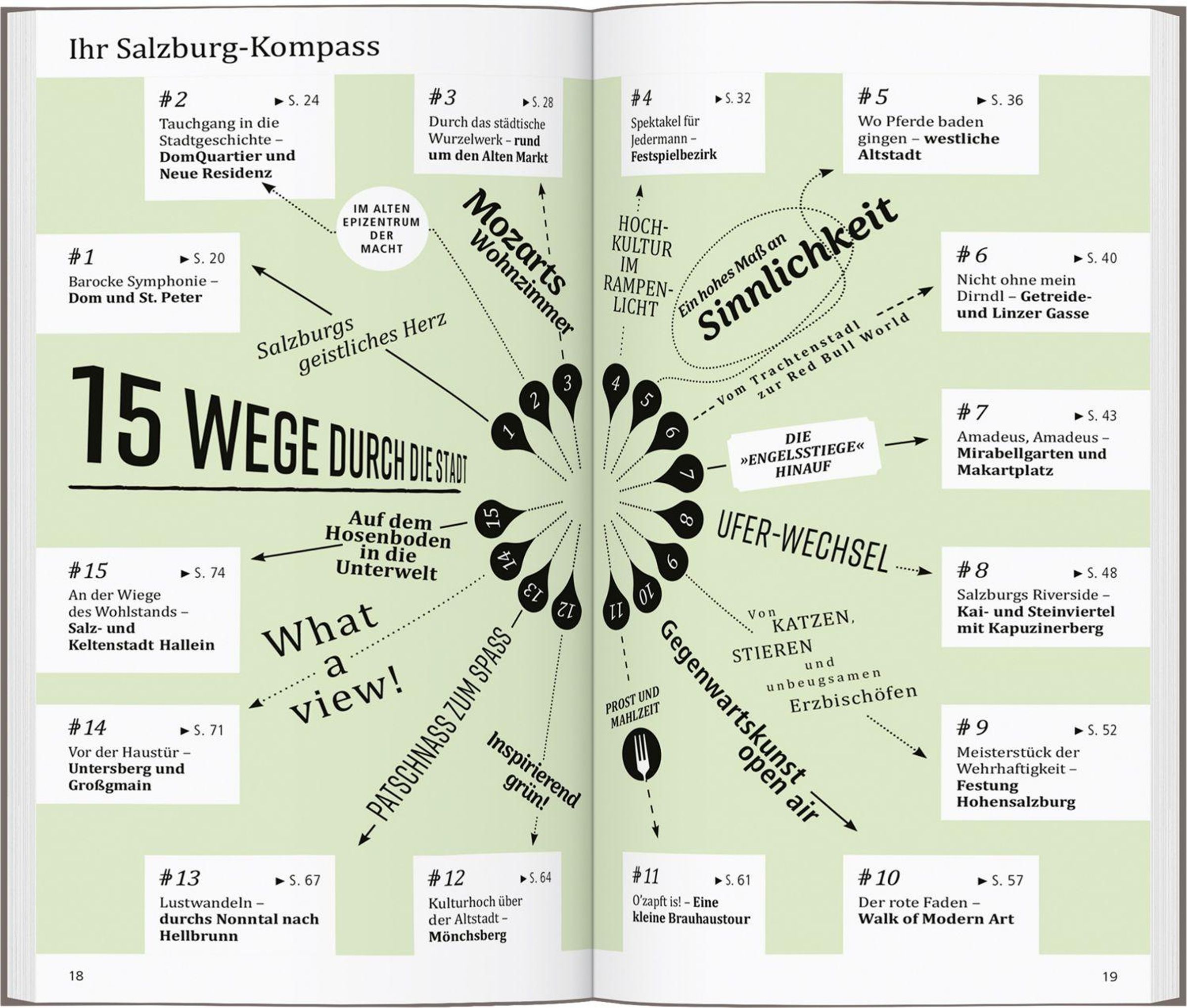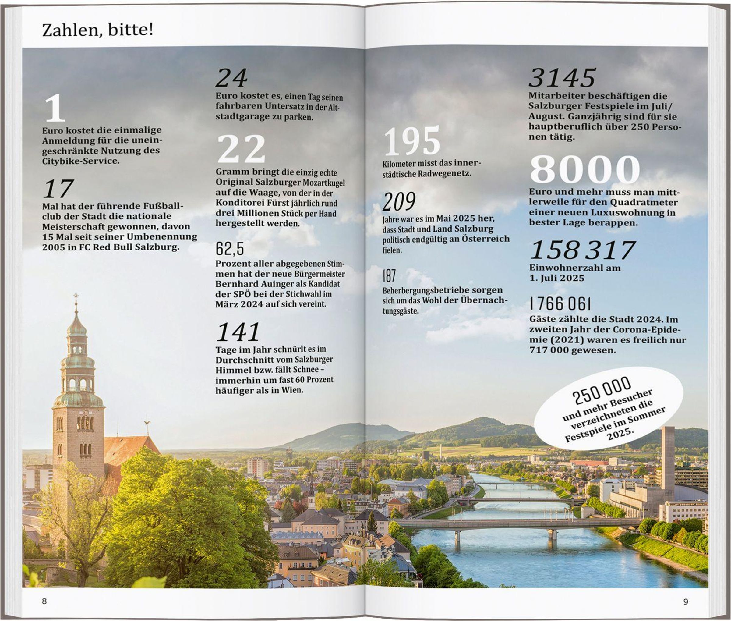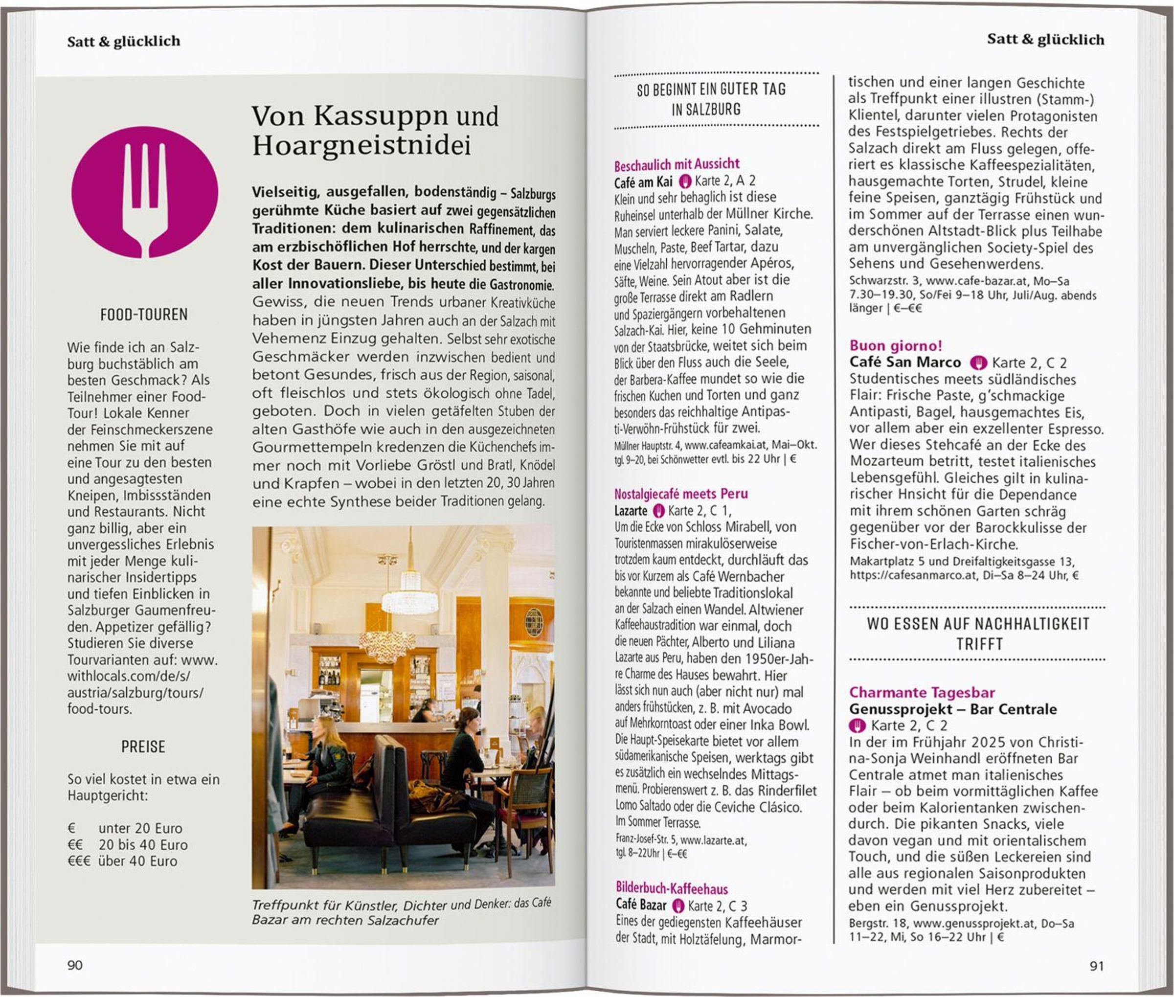 In eigenen Kapiteln erfahren Sie, wo es sich in fremden Betten gut schläft, wo Sie glücklich satt werden, wohin die Salzburger zum Stöbern und Entdecken gehen und wohin es sie zieht, wenn die Nacht beginnt.