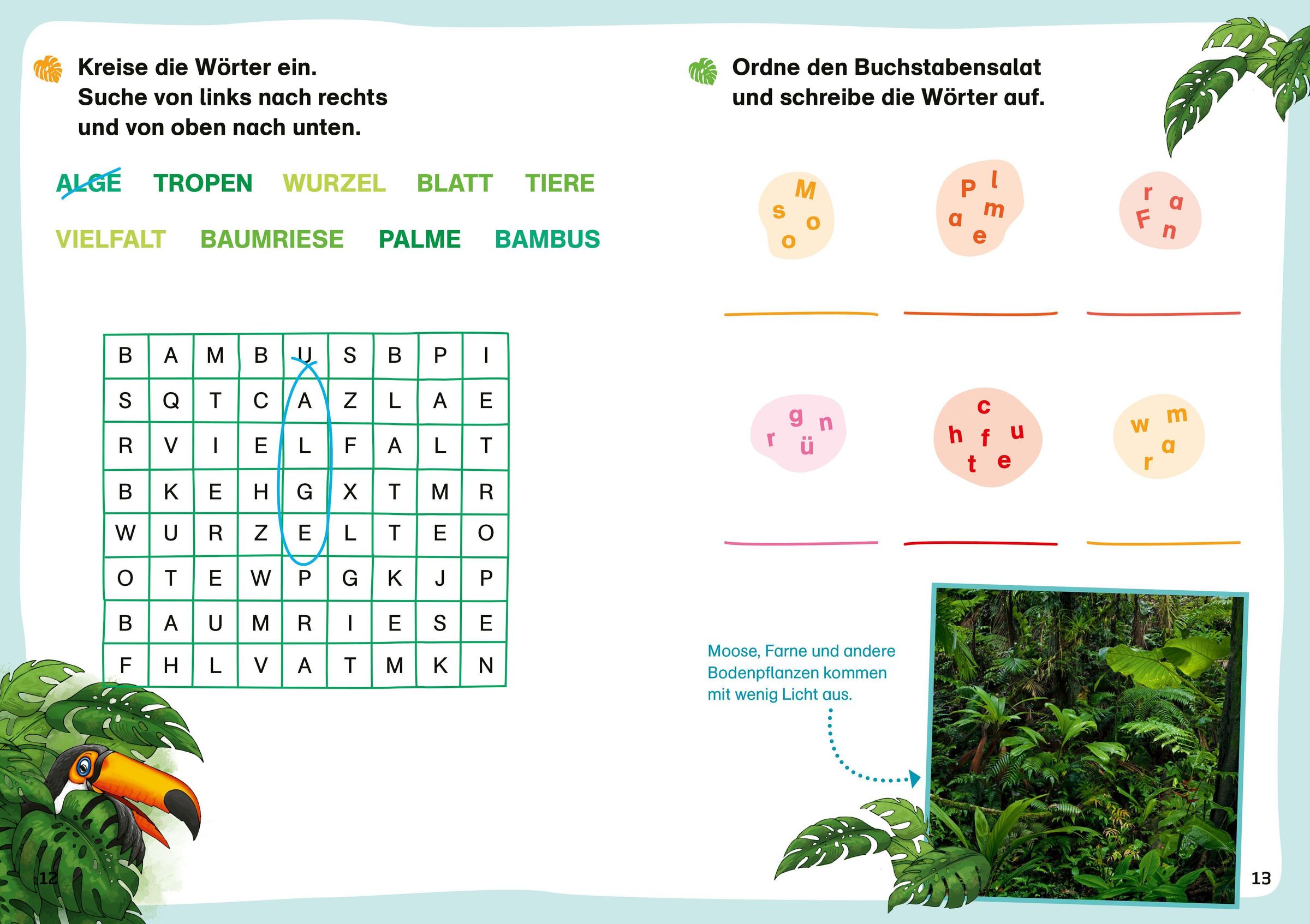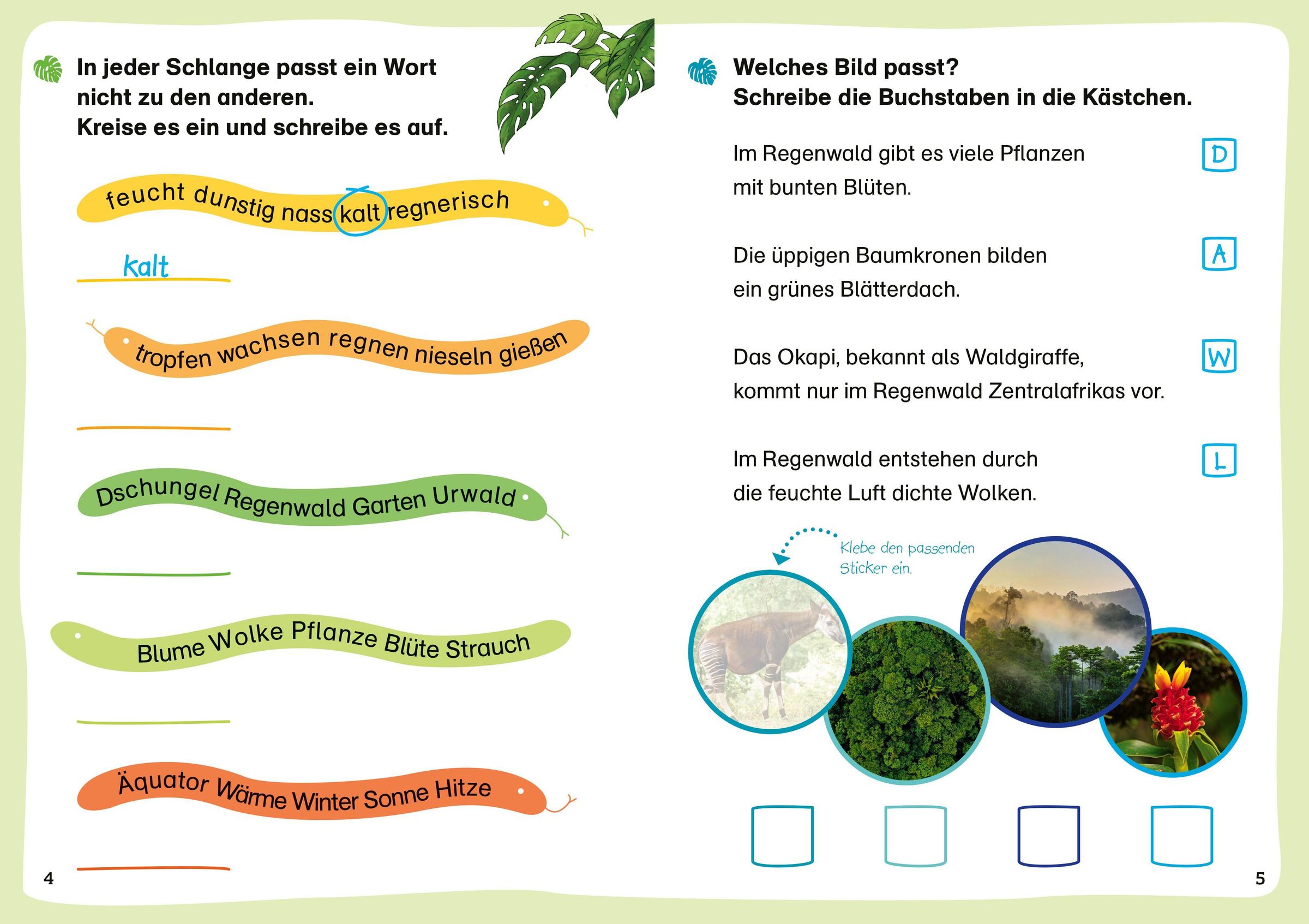 Auf in den Regenwald mit Tukan Toni! Er hat spannnendes Sachwissen über seine Heimat im Gepäck. Mit einfachen Texten, bunten Fotos und Illustrationen erfahren Leseanfängerinnen und Leseanfänger eine Menge über den Regenwald und das Leben seiner Bewohner. Auf jeden Sachtext folgen Rätsel, die das Leseverständnis fördern und die Rechtschreibung optimieren. Zum Lösen einiger Rätsel und zum Verzieren eigener Kunstwerke, finden die Kinder in der Heftmitte einen Stickerbogen. So macht das Lesenlernen noch mehr Spaß!