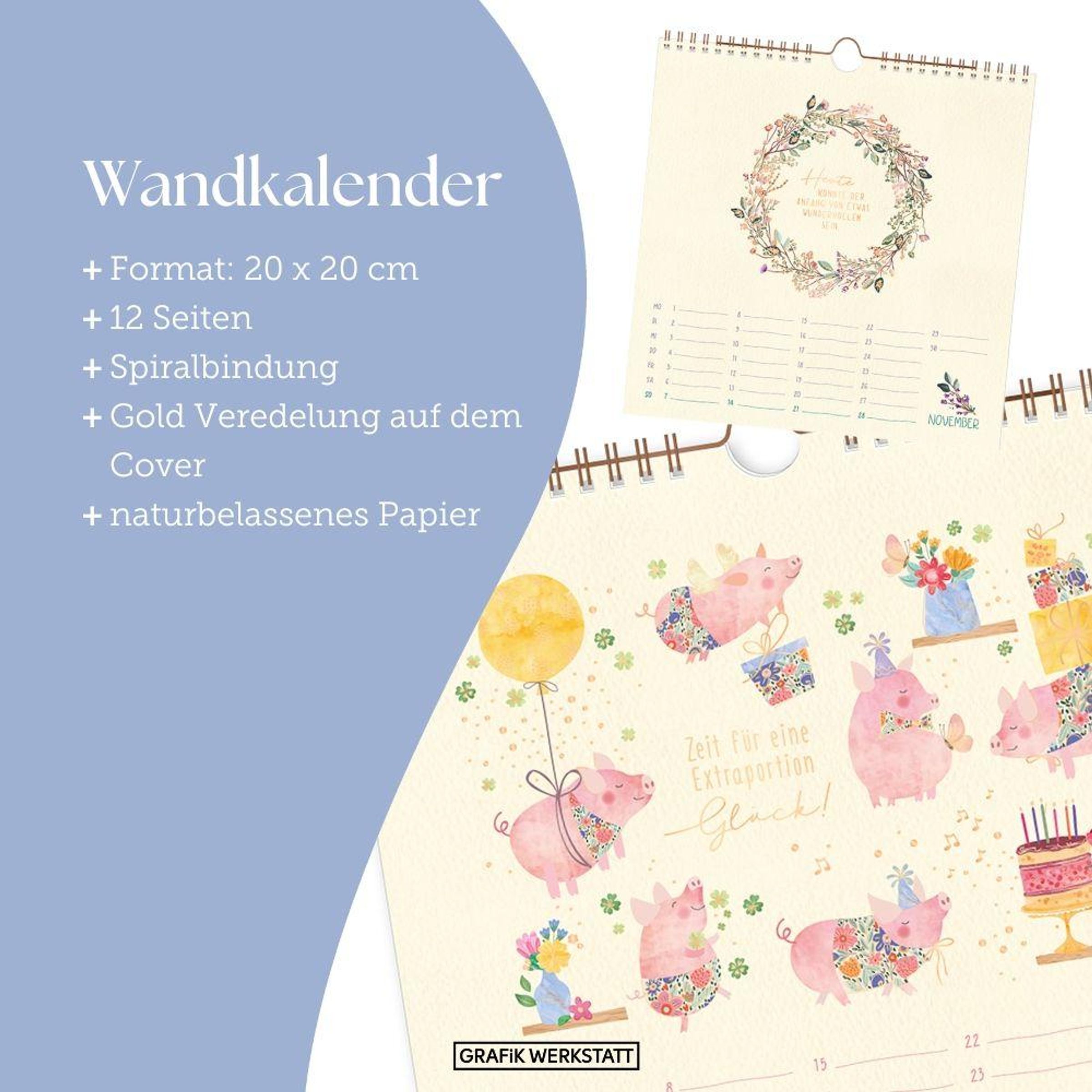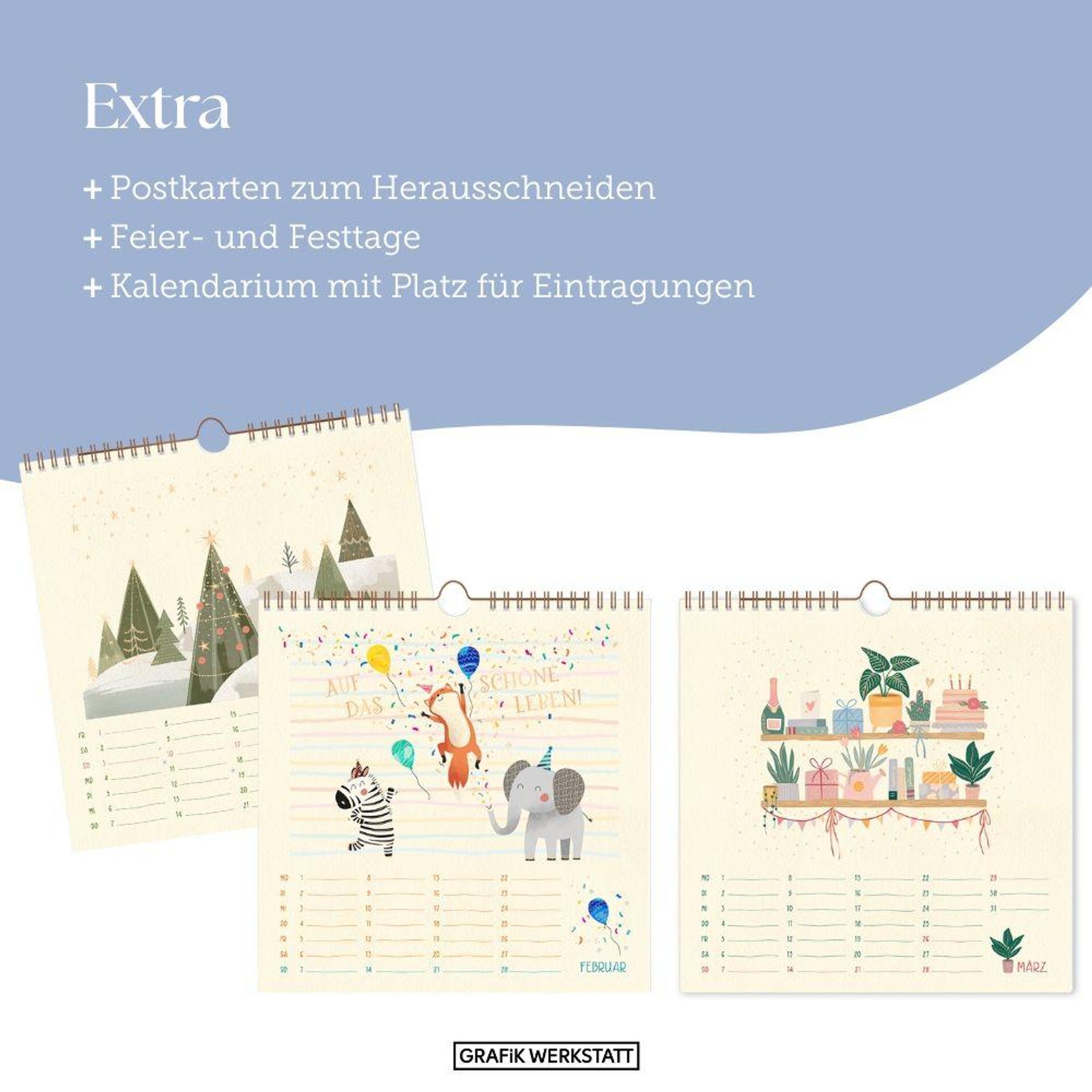 Jeden Tag ein Lächeln, jeden Monat eine Überraschung - das ganze Jahr über Freude! Dieser Kalender verschönert mit edlem Fedrigoni-Papier, Goldveredelungen und handgefertigten Illustrationen Blatt für Blatt deine vier Jahreszeiten und deine vier Wände. Durch das praktische Kalendarium behältst du stets den Überblick, egal ob im Büro oder zu Hause. Die einzelnen Motive lassen sich problemlos ausschneiden und als Postkarte versenden. Jeder Monat ist übersichtlich auf einer Seite dargestellt und es gibt viel Platz für Notizen und Eintragungen. Auch Feier- und Festtage sind im Kalender eingetragen.