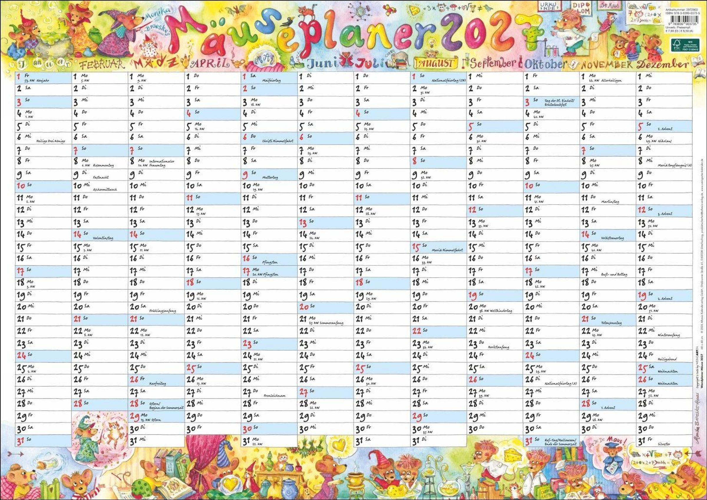 - Praktischer Kalender mit Überblick über das ganze Jahr. Feiertage und Kalenderwochen in einem Posterplaner mit lustigen Mauszeichnungen. 68 x 48 cm