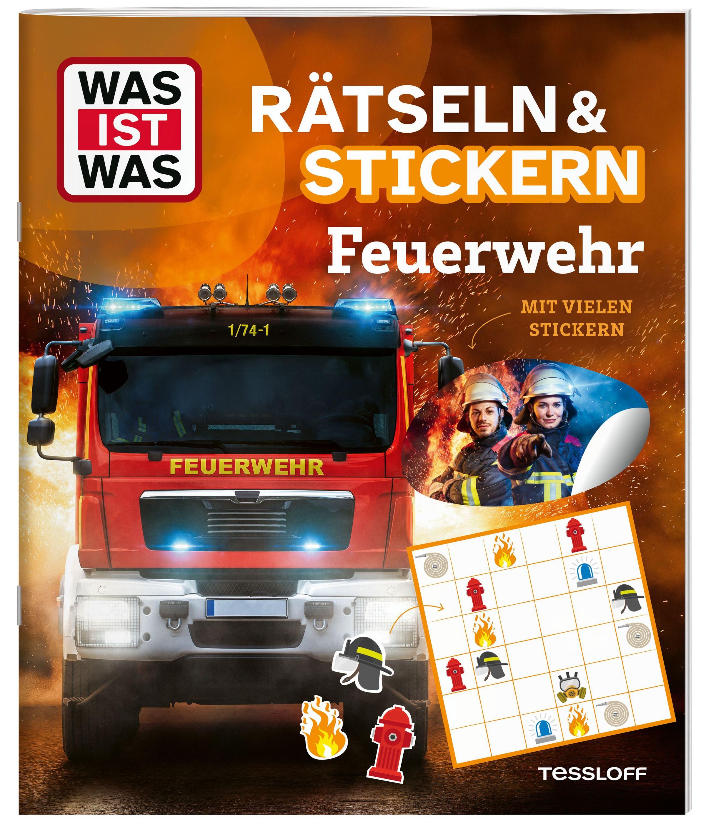 "Rätseln & Stickern: Feuerwehr. Mit vielen Stickern. WAS IST WAS Logo. Rotes Feuerwehrauto, Feuerwehrleute, Stickerbogen.", Buch