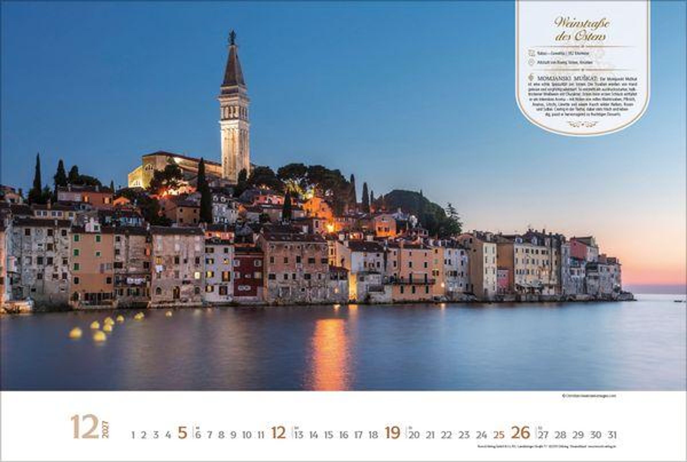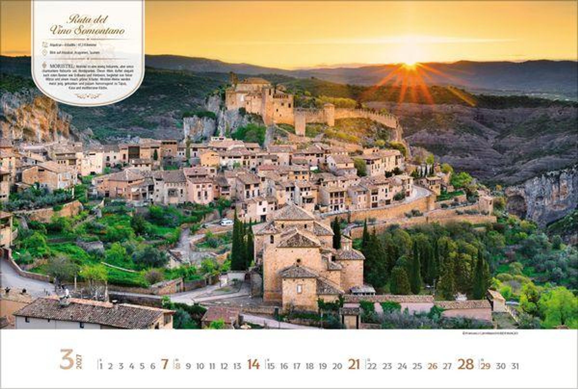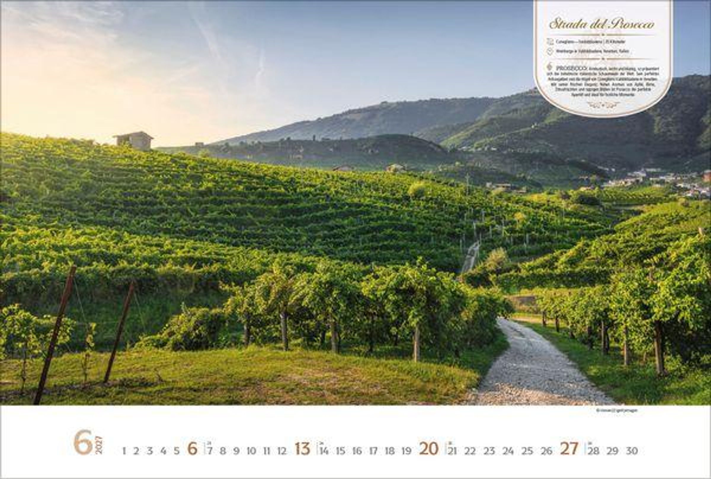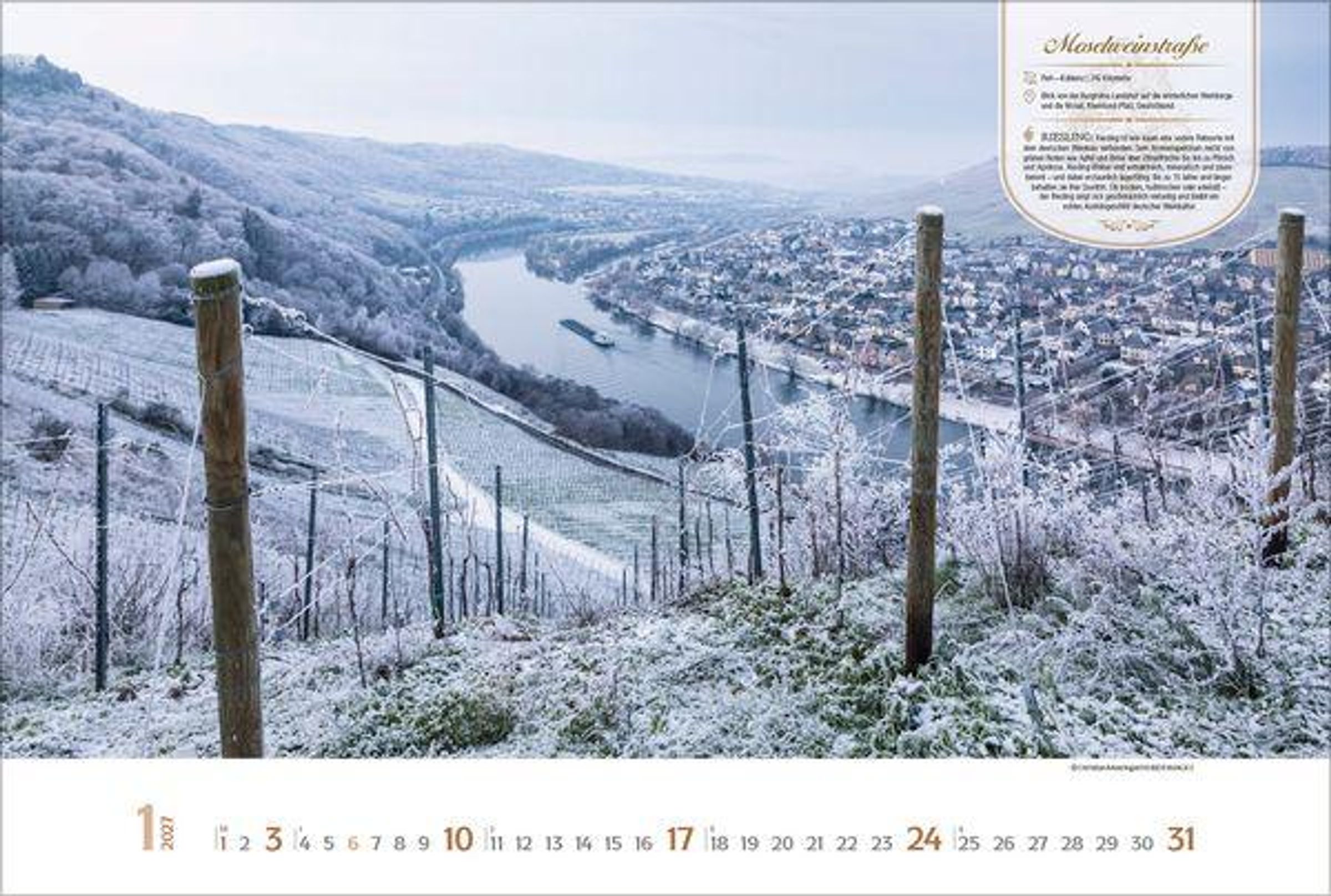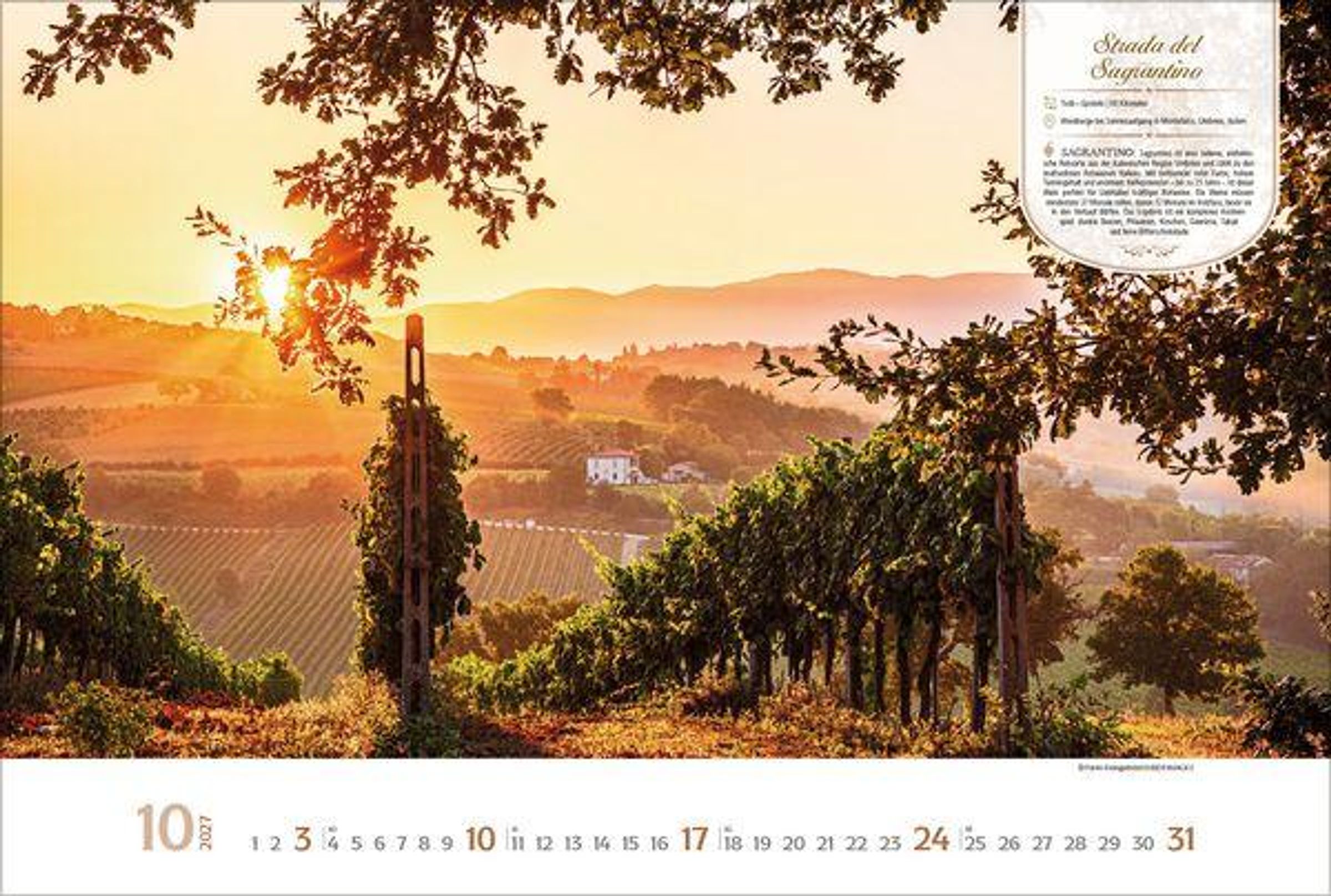 Dieser Kalender lädt den Betrachter ein auf eine visuelle Entdeckungsreise entlang der schönsten Weinstraßen Europas. Monat für Monat erwarten den Betrachter stimmungsvolle Aufnahmen malerischer Orte, sanfter Rebhänge und traditionsreicher Weinlandschaften. Neben den Fotografien bietet jeder Monat wissenswerte Informationen zur jeweiligen Weinstraße sowie eine kurze Vorstellung eines typischen Weins aus der Region. Ein perfekter Kalender für alle, die Genuss, Reiselust und die Vielfalt europäischer Weinkultur schätzen.