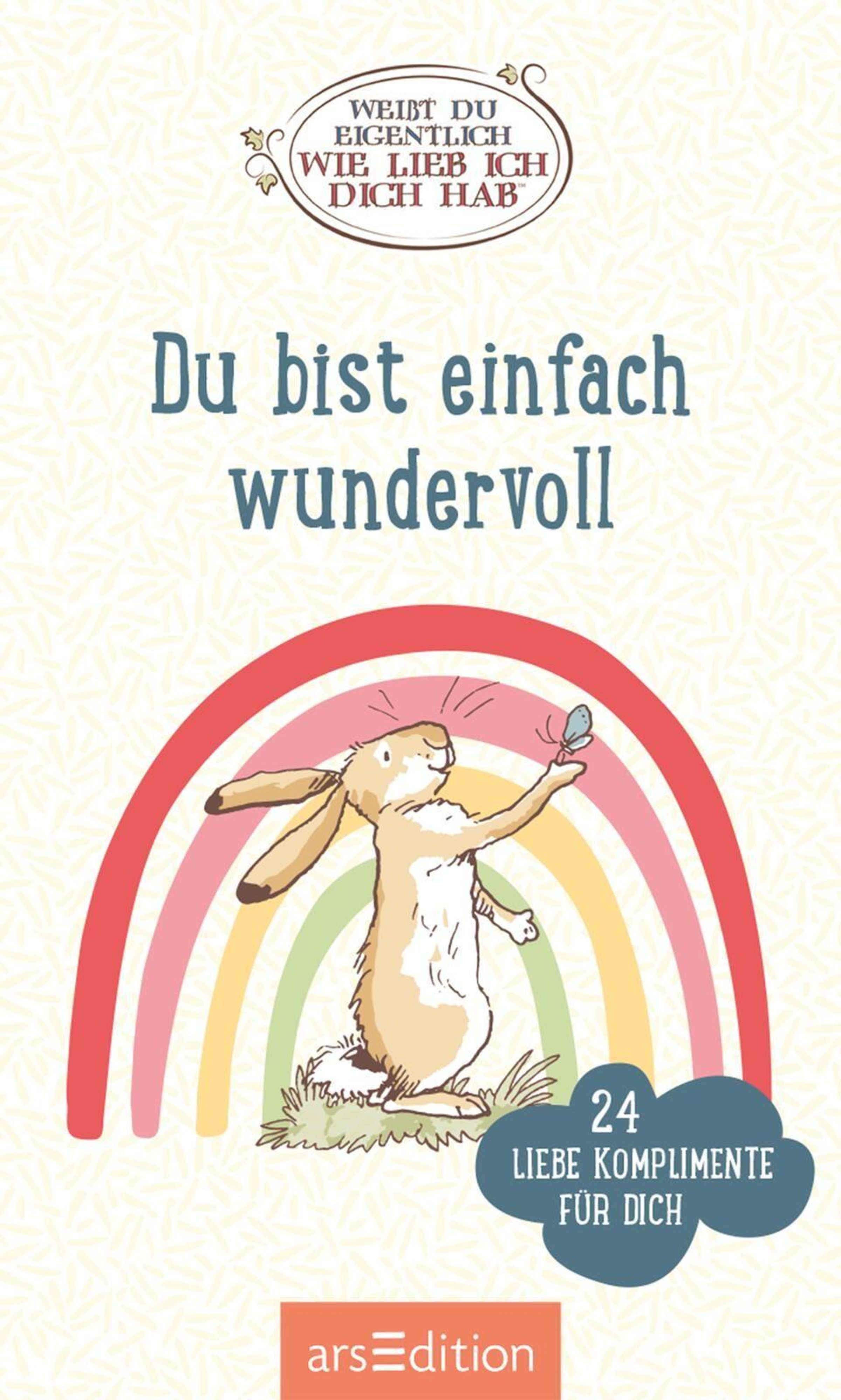 Komplimente kann man nie genug machen. Dieser zauberhafte Block enthält 24 heraustrennbare Karten mit wunderbaren Zitaten und herzerwärmenden Botschaften für die Seele. Mit den bekannten und wunderschönen Illustrationen der weltbekannten Hasen sind sie eine hochwertige kleine Aufmerksamkeit für liebe Menschen. Die stabilen Kärtchen lassen sich ganz einfach aus dem Block heraustrennen. Mit ihren liebevollen Botschaften zaubern sie garantiert ein Lächeln auf die Gesichter der Beschenkten. Ein charmantes Geschenk für alle, denen wir sagen wollen, wie lieb wir sie haben.