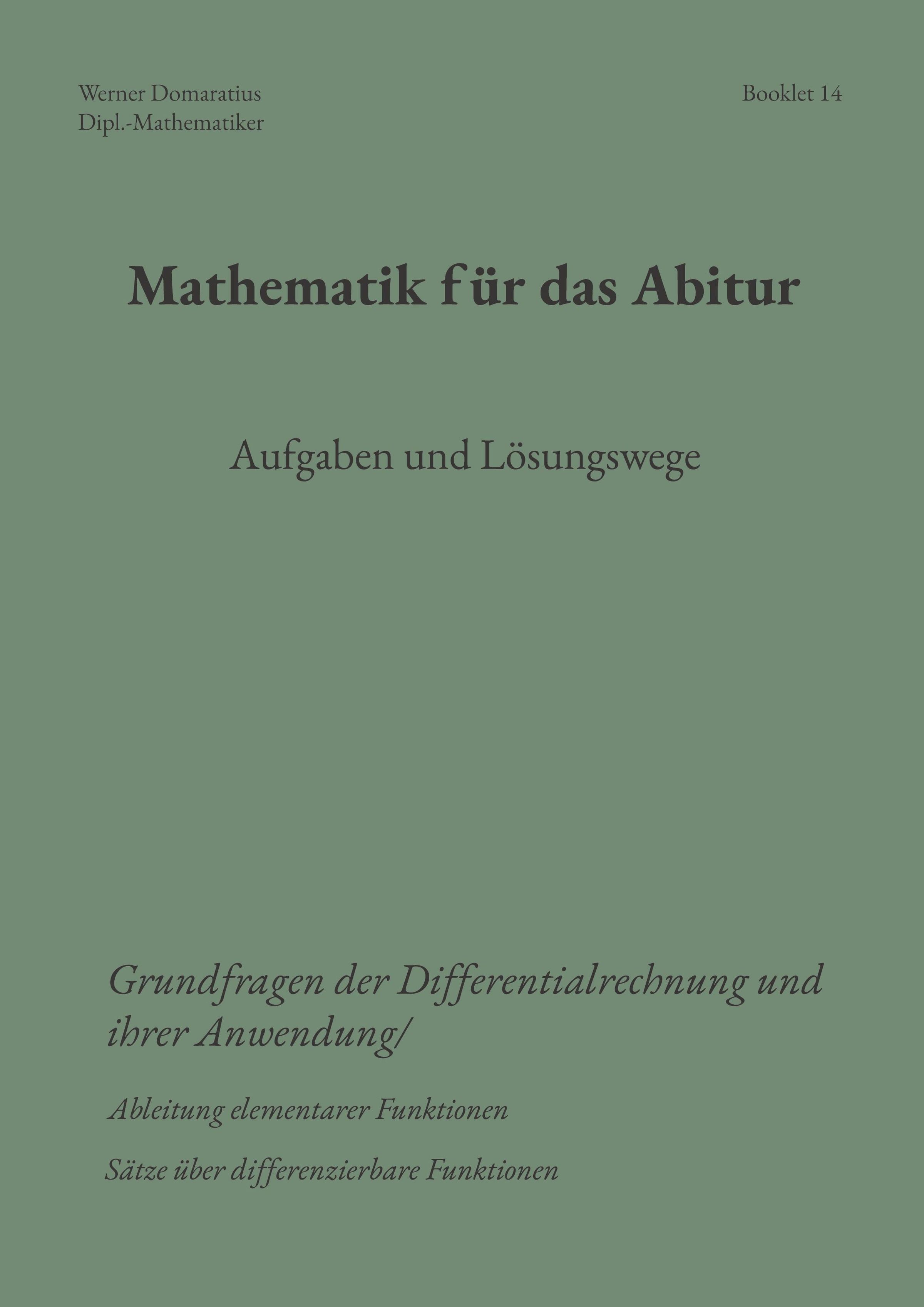Booklet 1: Der Begriff Funktion Booklet 2: Lineare Funktionen Booklet 3: Quadratische Funktionen Booklet 4: Potenzfunktionen, Kurvenscharen Booklet 5: Trigonometrische Funktionen Booklet 6: Exponential- und Logarithmusfunktionen Booklet 7: Verknüpfen, Verketten und Umkehren von Funktionen Booklet 8: Weitere reelle Funktionen Booklet 9: Zahlenfolgen, Eigenschaften Booklet 10: Spezielle Zahlenfolgen Booklet 11: Grenzwerte von Zahlenfolgen Booklet 12: Grenzwerte von Funktionen Booklet 13: Der Begriff Ableitung einer Funktion, Ableitungsregeln Booklet 14: Ableitung elementarer Funktionen Booklet 15: Untersuchung von Funktionseigenschaften Booklet 16: Kurvendiskussion Booklet 17: Extremwertprobleme Booklet 18: Unbestimmtes / bestimmtes Integral Booklet 19: Anwendungen der Integralrechnung Booklet 20: Integration weiterer Funktionen Booklet 21: Vektoren im Betrachtungsraum Booklet 22: Vektoren in Koordinatensystemen Booklet 23: Geraden in Ebene und Raum Booklet 24: Ebenen im Raum Booklet 25: Skalarprodukt von Vektoren Booklet 26: Kreis und Kugel