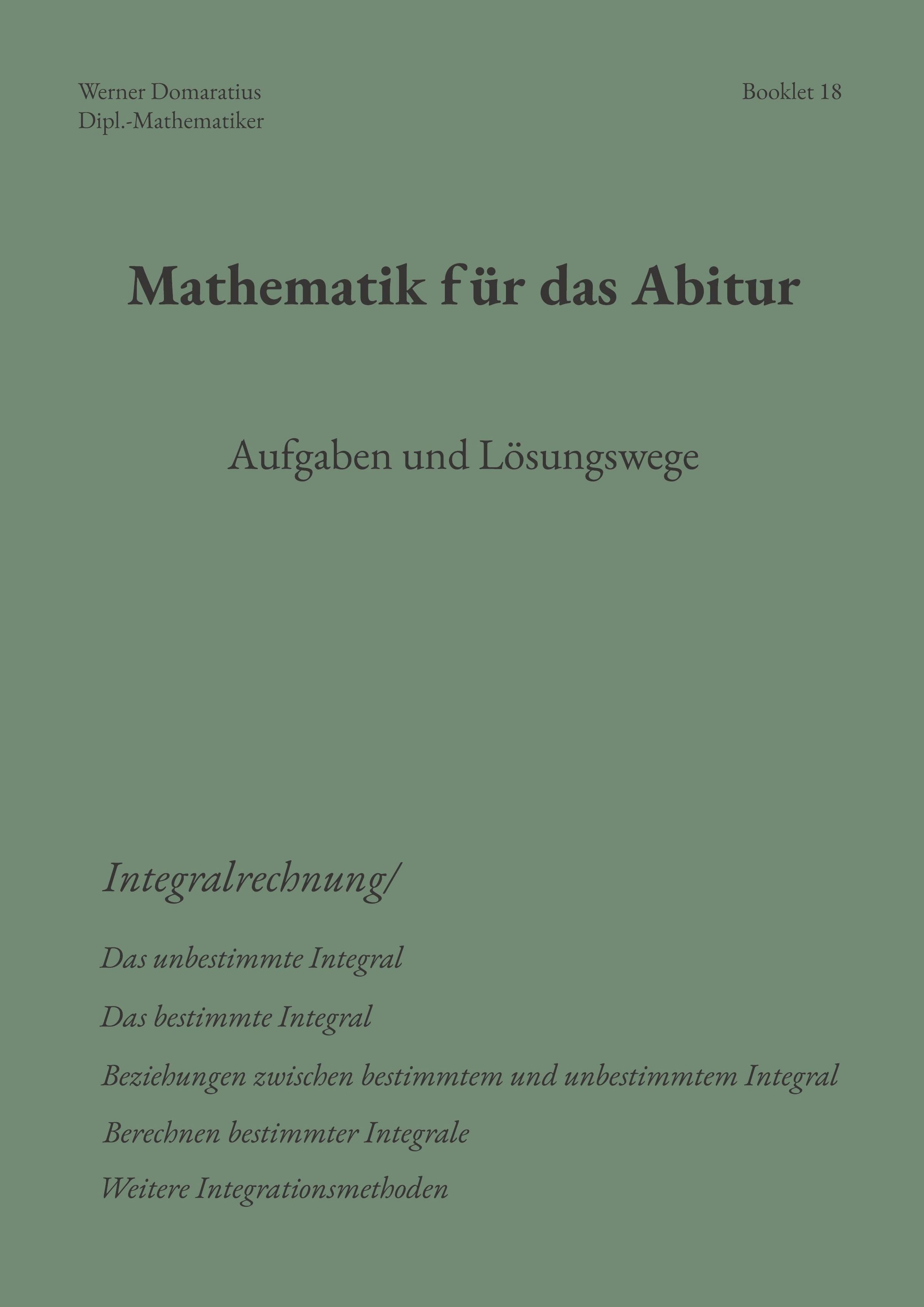 Booklet-Reihe: Booklet 1: Der Begriff Funktion Booklet 2: Lineare Funktionen Booklet 3: Quadratische Funktionen Booklet 4: Potenzfunktionen, Kurvenscharen Booklet 5: Trigonometrische Funktionen Booklet 6: Exponential- und Logarithmusfunktionen Booklet 7: Verknüpfen, Verketten und Umkehren von Funktionen Booklet 8: Weitere reelle Funktionen Booklet 9: Zahlenfolgen, Eigenschaften Booklet 10: Spezielle Zahlenfolgen Booklet 11: Grenzwerte von Zahlenfolgen Booklet 12: Grenzwerte von Funktionen Booklet 13: Der Begriff Ableitung einer Funktion, Ableitungsregeln Booklet 14: Ableitung elementarer Funktionen Booklet 15: Untersuchung von Funktionseigenschaften Booklet 16: Kurvendiskussion Booklet 17: Extremwertprobleme Booklet 18: Unbestimmtes / bestimmtes Integral Booklet 19: Anwendungen der Integralrechnung Booklet 20: Integration weiterer Funktionen Booklet 21: Vektoren im Betrachtungsraum Booklet 22: Vektoren in Koordinatensystemen Booklet 23: Geraden in Ebene und Raum Booklet 24: Ebenen im Raum Booklet 25: Skalarprodukt von Vektoren Booklet 26: Kreis und Kugel