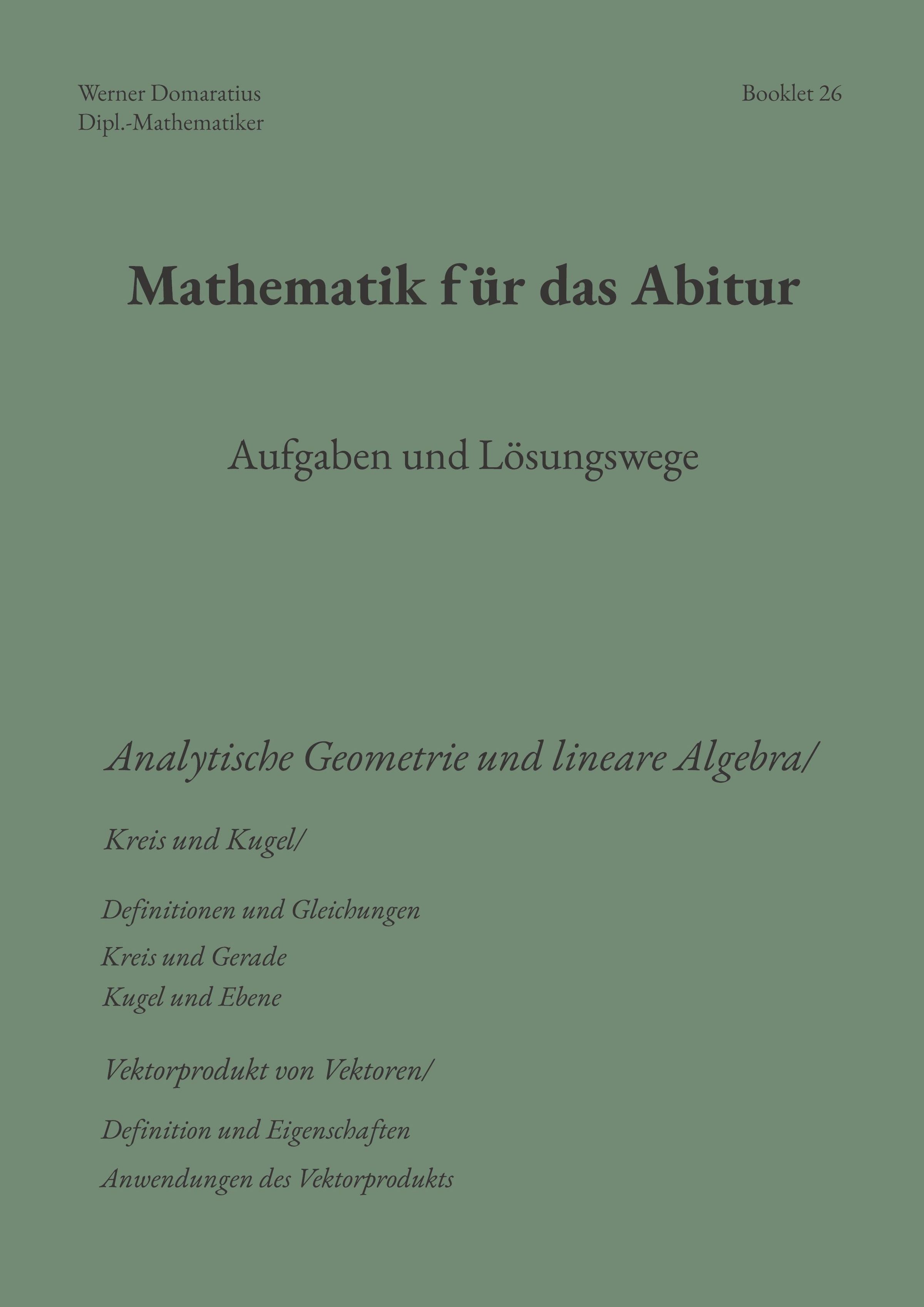 Booklet 1: Der Begriff Funktion Booklet 2: Lineare Funktionen Booklet 3: Quadratische Funktionen Booklet 4: Potenzfunktionen, Kurvenscharen Booklet 5: Trigonometrische Funktionen Booklet 6: Exponential- und Logarithmusfunktionen Booklet 7: Verknüpfen, Verketten und Umkehren von Funktionen Booklet 8: Weitere reelle Funktionen Booklet 9: Zahlenfolgen, Eigenschaften Booklet 10: Spezielle Zahlenfolgen Booklet 11: Grenzwerte von Zahlenfolgen Booklet 12: Grenzwerte von Funktionen Booklet 13: Der Begriff Ableitung einer Funktion, Ableitungsregeln Booklet 14: Ableitung elementarer Funktionen Booklet 15: Untersuchung von Funktionseigenschaften Booklet 16: Kurvendiskussion Booklet 17: Extremwertprobleme Booklet 18: Unbestimmtes / bestimmtes Integral Booklet 19: Anwendungen der Integralrechnung Booklet 20: Integration weiterer Funktionen Booklet 21: Vektoren im Anschauungsraum Booklet 22: Vektoren in Koordinatensystemen Booklet 23: Geraden in Ebene und Raum Booklet 24: Ebenen im Raum Booklet 25: Skalarprodukt von Vektoren Booklet 26: Kreis und Kugel