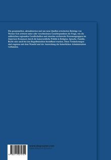 Die gesammelten Beiträge von Werner Eck erörtern unter sehr verschiedenen sachlichen Gesichtspunkten die Frage, wie die zahlreichen regionalen Gesellschaften und einzelne reichsweite Personengruppen im Imperium Romanum durch die kaiserzeitliche Politik in Religion, Sprache, Familie, Recht oder auch bei den Begräbnissitten beeinflusst wurden. Erörtert werden etwa Folgen für die Stellung und öffentliche Präsentation von Frauen, für die rechtliche und reale Lage der Soldaten römischen und peregrinen Rechts sowie für den reichsweit rekrutierten Senatorenstand. Diese Veränderungen sind engstens mit der Gestaltung und Ausweitung der kaiserlichen Administration in den Provinzen, aber auch in der Stadt Rom selbst verbunden, wobei besonderes Gewicht auf die Funktionen des Heeres gelegt wird. Eingeschlossen ist auch die Frage des Euergetismus für das Funktionieren der Städte, dem gegenüber die Leistung der Gemeinden allzu oft unterschätzt wird. Die Beiträge sind unter Berücksichtigung neuer Quellen soweit nötig und möglich auf neuen Stand gebracht worden.