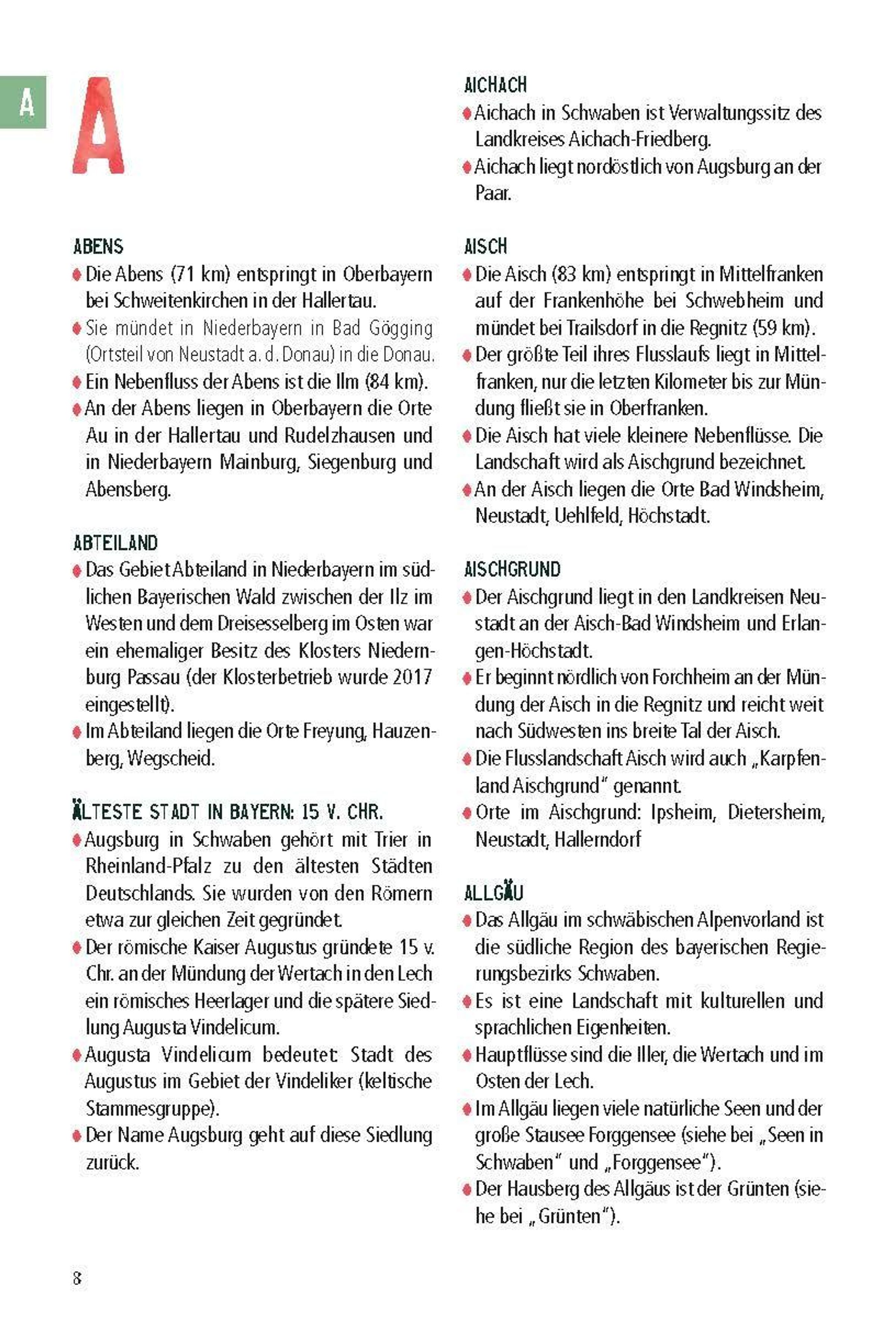In diesem kleinen Bayern-Lexikon finden Sie ein buntes Stichwort-Sammelsurium, das Sie einmal quer durch den schönen Freistaat Bayern führt. Dabei erfahren Sie Spannendes über Geschichte, Geologie und Geografie des Bundeslandes, über die zahlreichen Sehenswürdigkeiten und Feste, die Bayern zu bieten hat, über bayerische Straßen, Städte, Politik und vieles mehr. Ein Buch zum Nachschlagen und Suchen, zum Lernen und Entdecken!