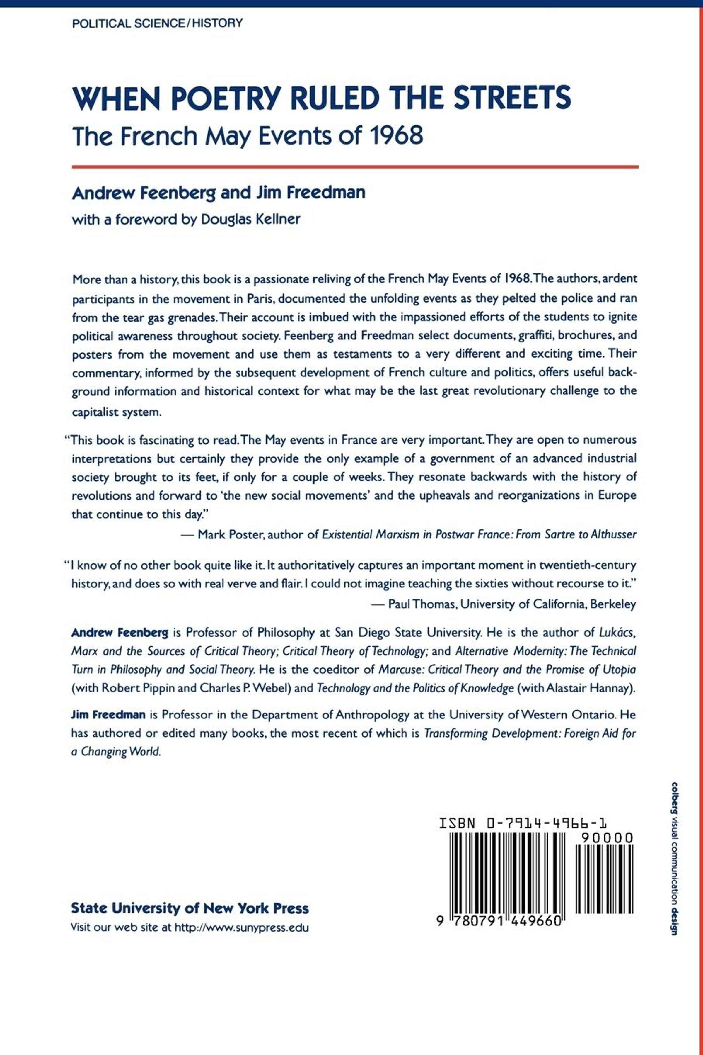 More than a history, this book is a passionate reliving of the French May Events of 1968. The authors, ardent participants in the movement in Paris, documented the unfolding events as they pelted the police and ran from the tear gas grenades. Their account is imbued with the impassioned efforts of the students to ignite political awareness throughout society. Feenberg and Freedman select documents, graffiti, brochures, and posters from the movement and use them as testaments to a very different and exciting time. Their commentary, informed by the subsequent development of French culture and politics, offers useful background information and historical context for what may be the last great revolutionary challenge to the capitalist system.