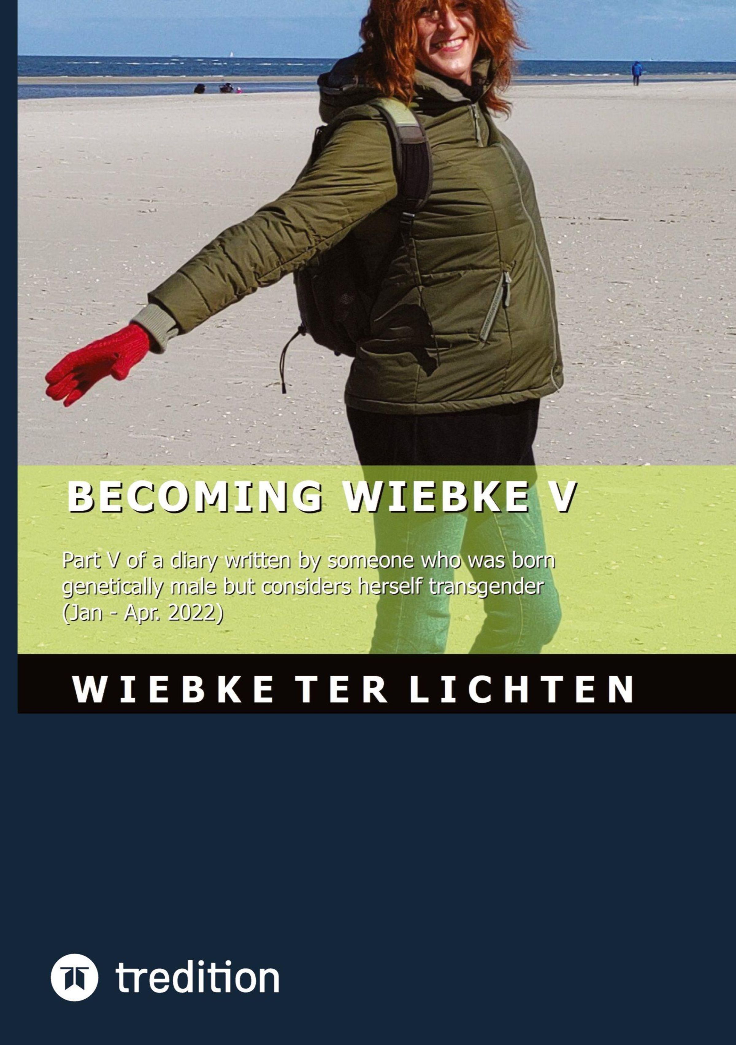 BECOMING WIEBKE V; Tagebuchteil über Transgender-Thema. Person in grüner Jacke auf Sandstrand mit ausgestreckten Armen., Buch