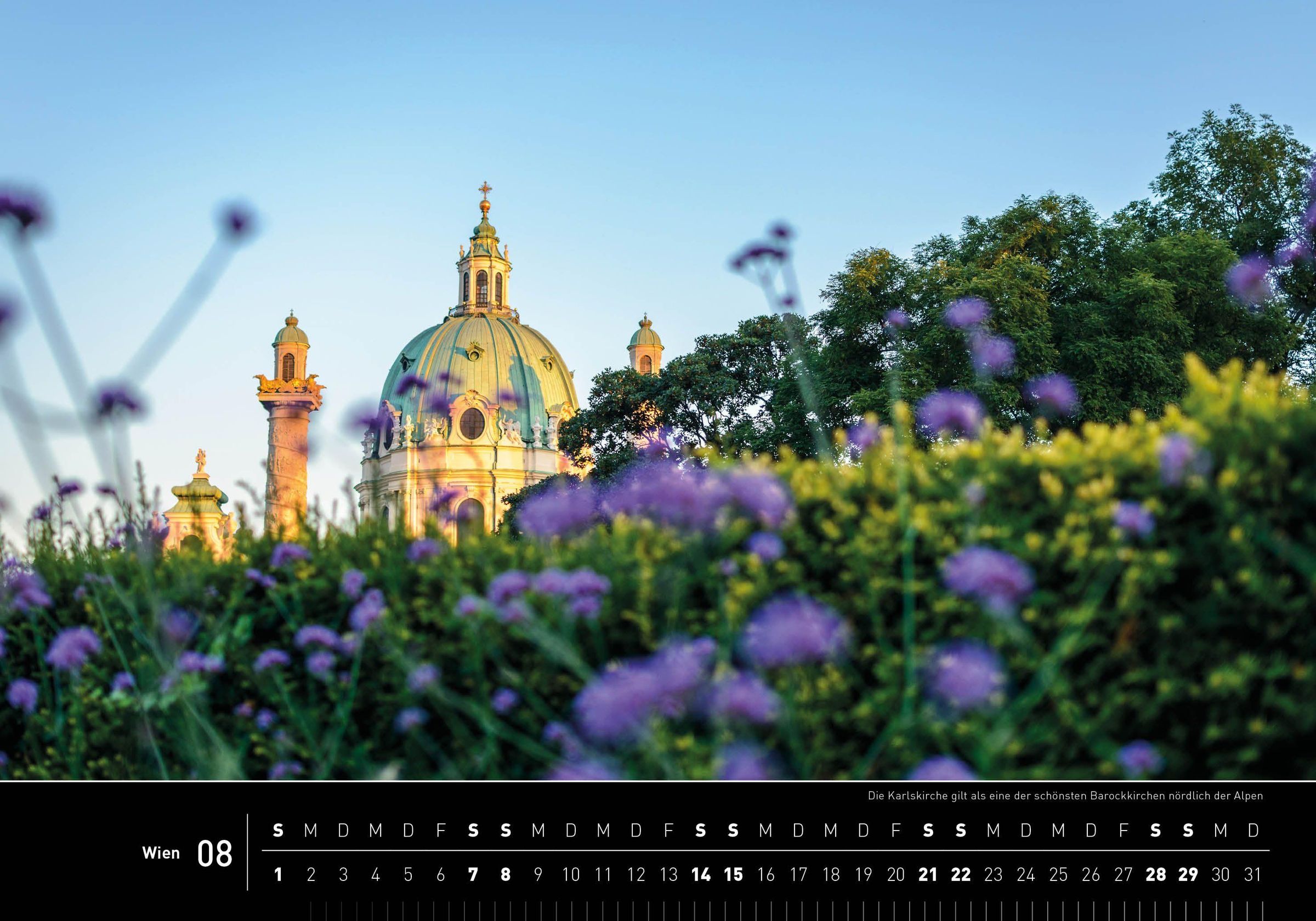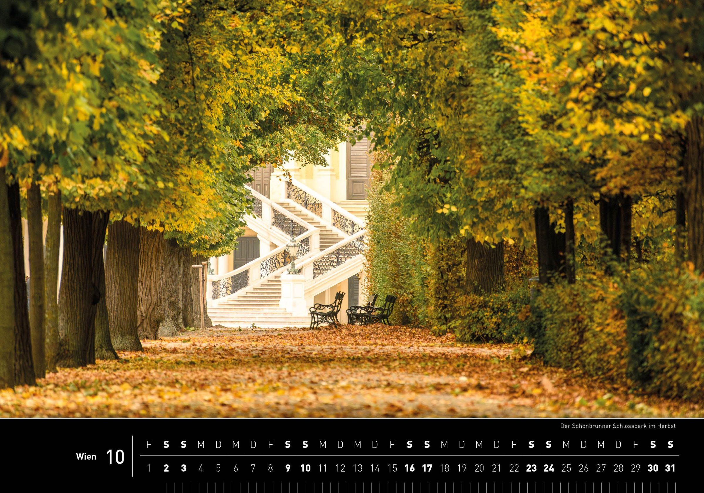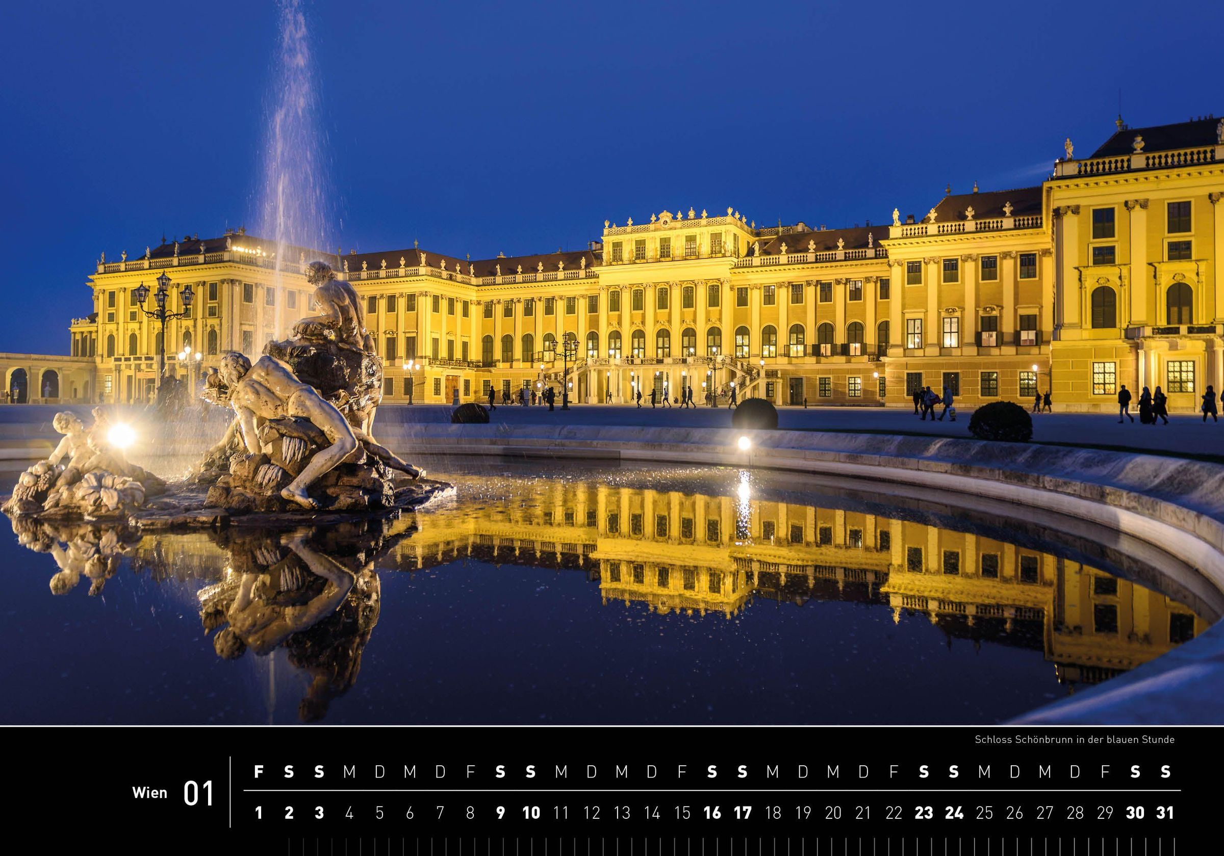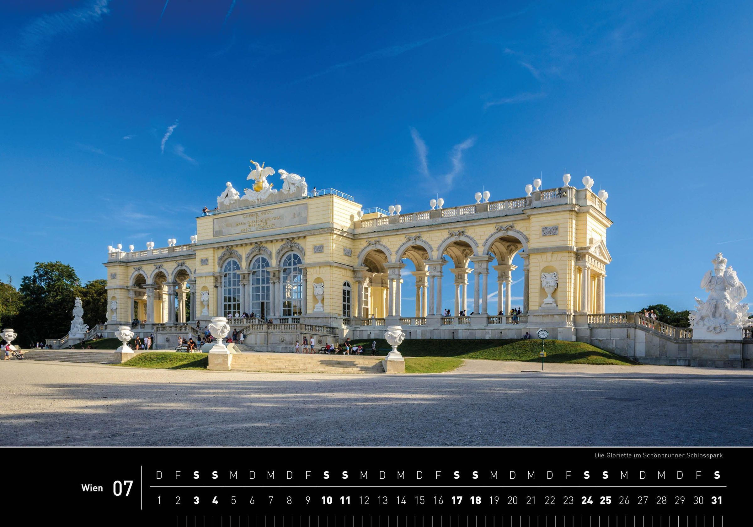 "Wien 2027" und "Schloss Schönbrunn war die Sommerresidenz der Habsburger" in weißen Texten. Darunter Gartenansicht., Kalender