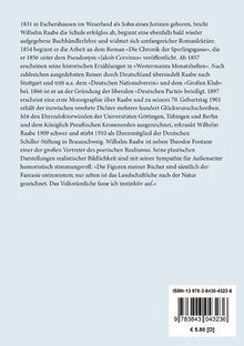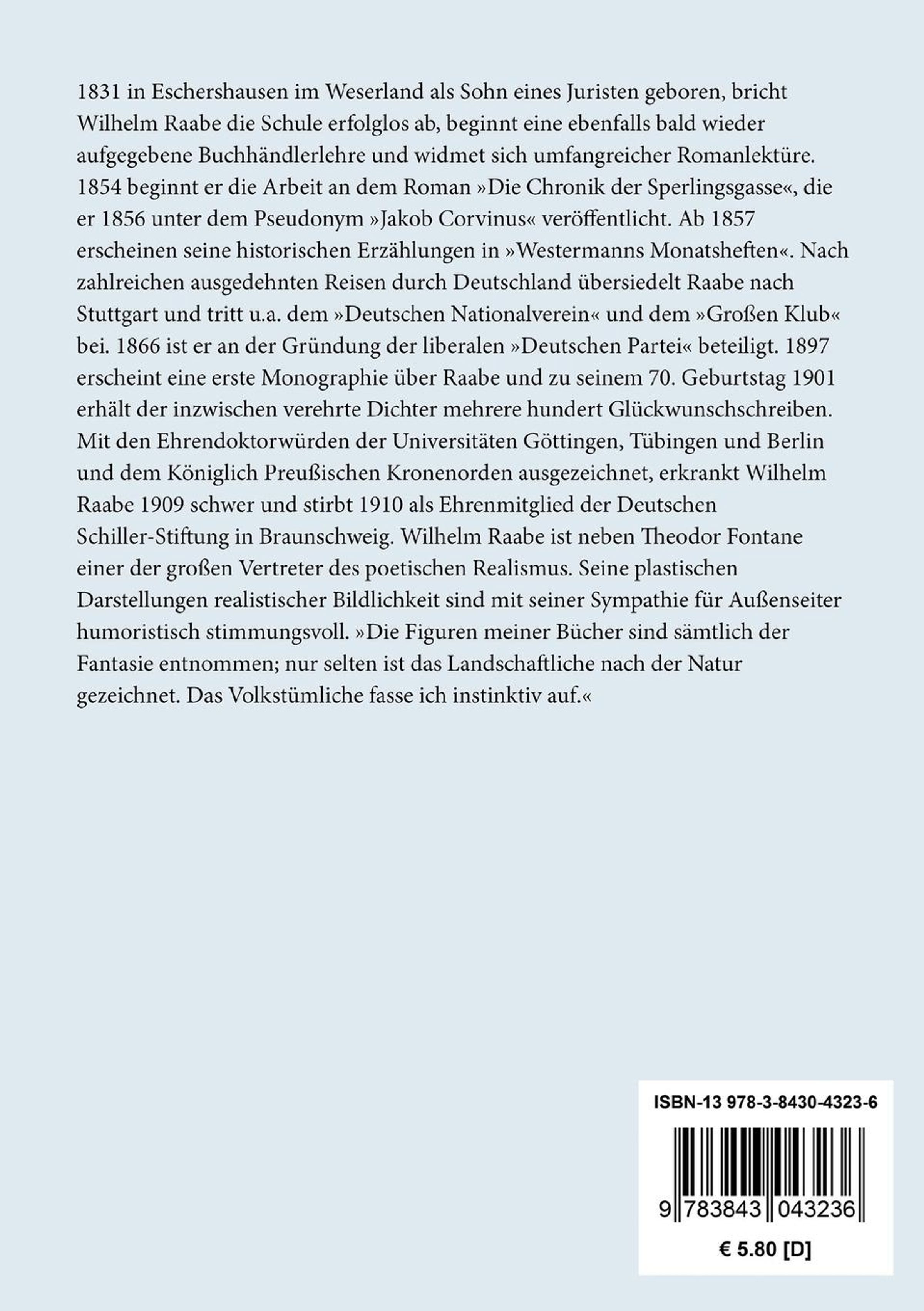 1831 in Eschershausen im Weserland als Sohn eines Juristen geboren, bricht Wilhelm Raabe die Schule erfolglos ab, beginnt eine ebenfalls bald wieder aufgegebene Buchhändlerlehre und widmet sich umfangreicher Romanlektüre. 1854 beginnt er die Arbeit an dem Roman >>Die Chronik der Sperlingsgasse<<, die er 1856 unter dem Pseudonym >>Jakob Corvinus<< veröffentlicht. Ab 1857 erscheinen seine historischen Erzählungen in >>Westermanns Monatsheften<<. Nach zahlreichen ausgedehnten Reisen durch Deutschland übersiedelt Raabe nach Stuttgart und tritt u. a. dem >>Deutschen Nationalverein<< und dem >>Großen Klub<< bei. 1866 ist er an der Gründung der liberalen >>Deutschen Partei<< beteiligt. 1897 erscheint eine erste Monographie über Raabe und zu seinem 70. Geburtstag 1901 erhält der inzwischen verehrte Dichter mehrere hundert Glückwunschschreiben. Mit den Ehrendoktorwürden der Universitäten Göttingen, Tübingen und Berlin und dem Königlich Preußischen Kronenorden ausgezeichnet, erkrankt Wilhelm Raabe 1909 schwer und stirbt 1910 als Ehrenmitglied der Deutschen Schiller-Stiftung in Braunschweig. Wilhelm Raabe ist neben Theodor Fontane einer der großen Vertreter des poetischen Realismus. Seine plastischen Darstellungen realistischer Bildlichkeit sind mit seiner Sympathie für Außenseiter humoristisch stimmungsvoll. >>Die Figuren meiner Bücher sind sämtlich der Fantasie entnommen; nur selten ist das Landschaftliche nach der Natur gezeichnet. Das Volkstümliche fasse ich instinktiv auf.<<