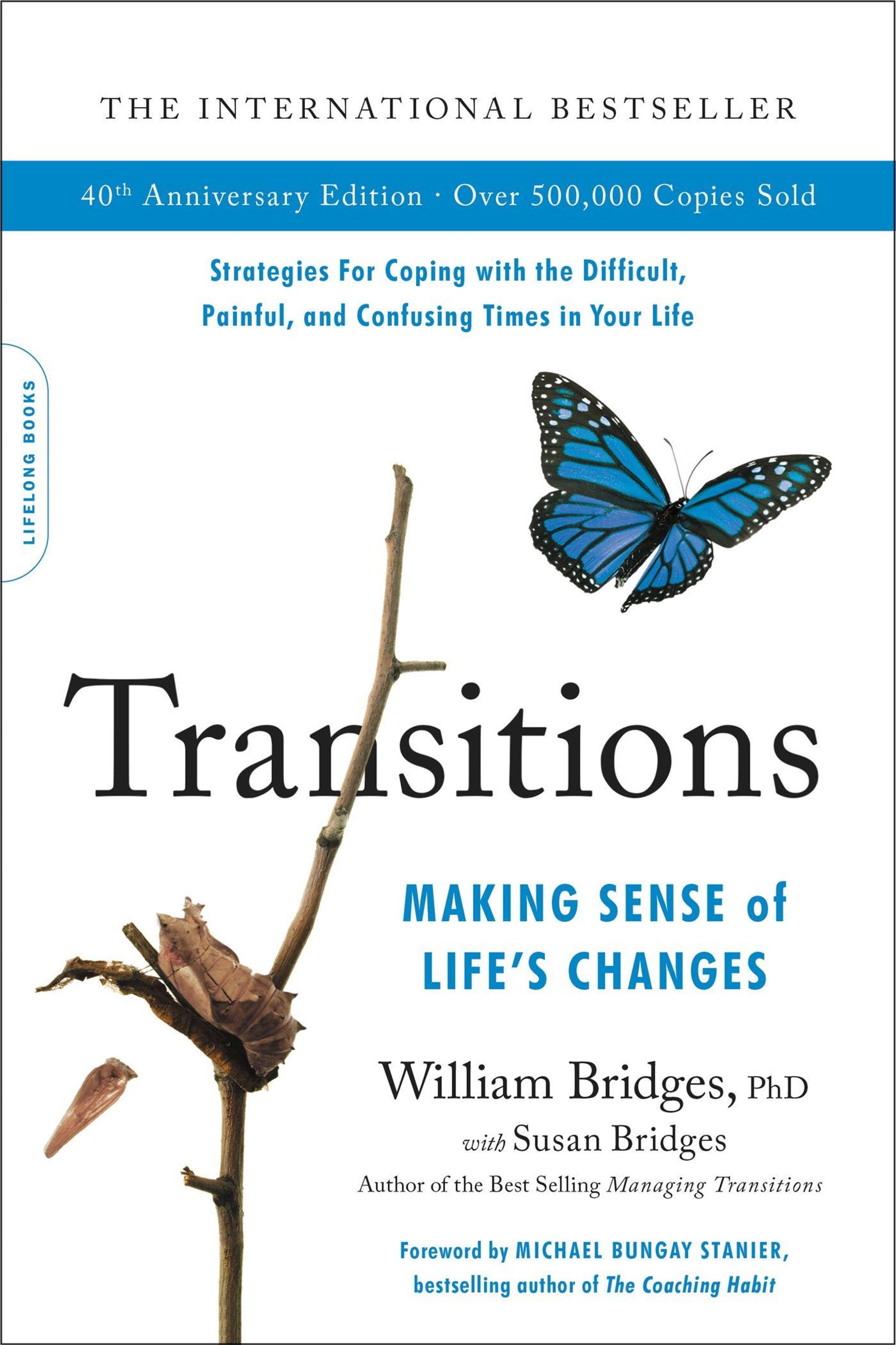 "The International Bestseller", "40th Anniversary Edition", "Transitions", blauer Schmetterling, braune Puppe auf Zweig., Buch