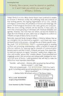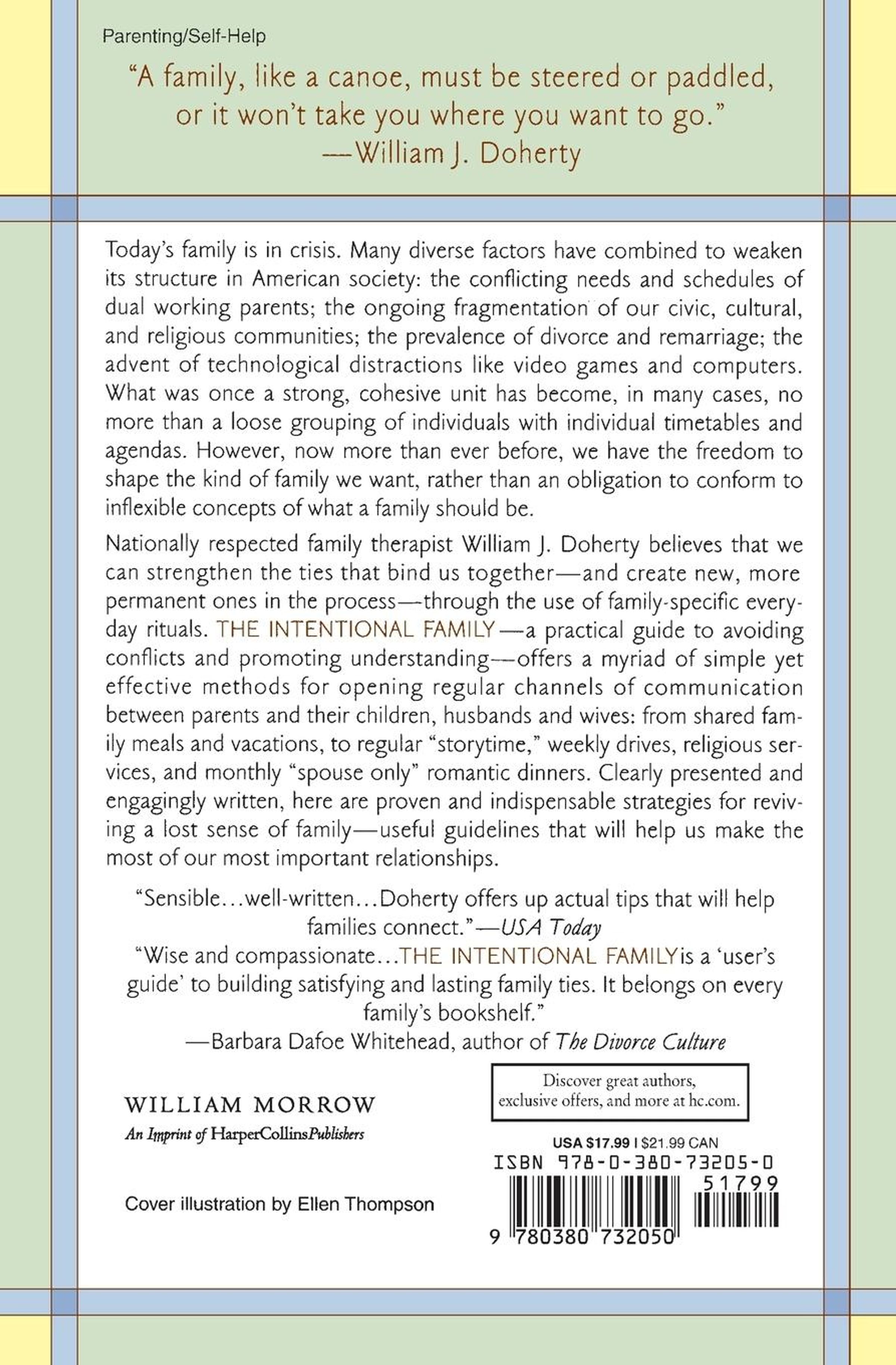 Nationally respected family therapist William J. Doherty believes that we can strengthen the ties that bind us together-and create new, more permanent ones in the process-through the use of family-specific everyday rituals. The Intentional Family -- a practical guide to avoiding conflicts and promoting understanding -- offers a myriad of simple yet effective methods for opening regular channels of communication between parents and their children, husbands and wives: from shared family meals and vacations, to regular "storytime," weekly drives, religious services, and monthly "spouse only" romantic dinners. Clearly presented and engagingly written, here are proven and indispensable strategies for reviving a lost sense of family -- useful guidelines that will help us make the most of our most important relationships.