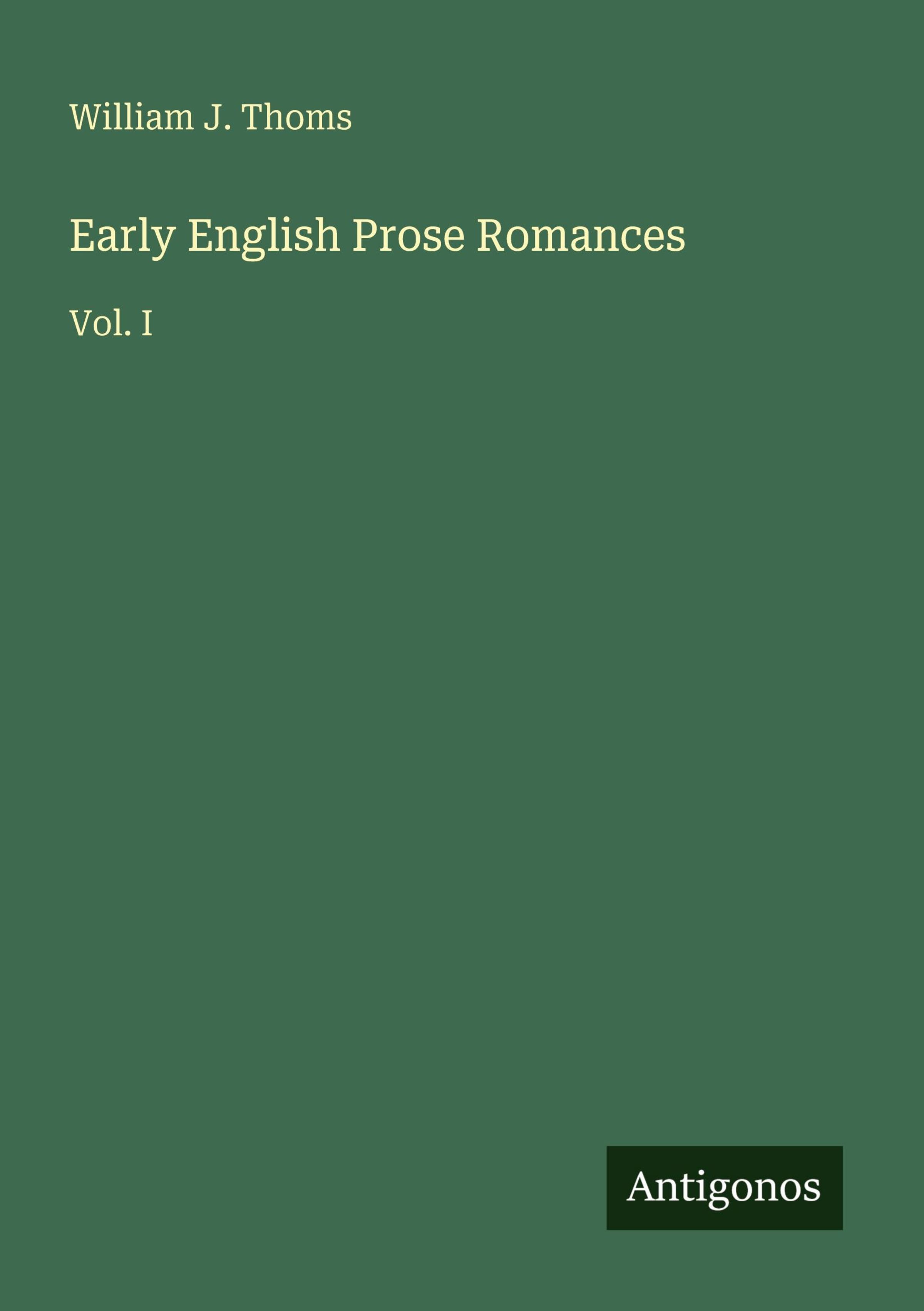 "William J. Thoms: Early English Prose Romances, Vol. I". Grüner Hintergrund mit schwarzem "Antigonos"-Rechteck unten., Buch