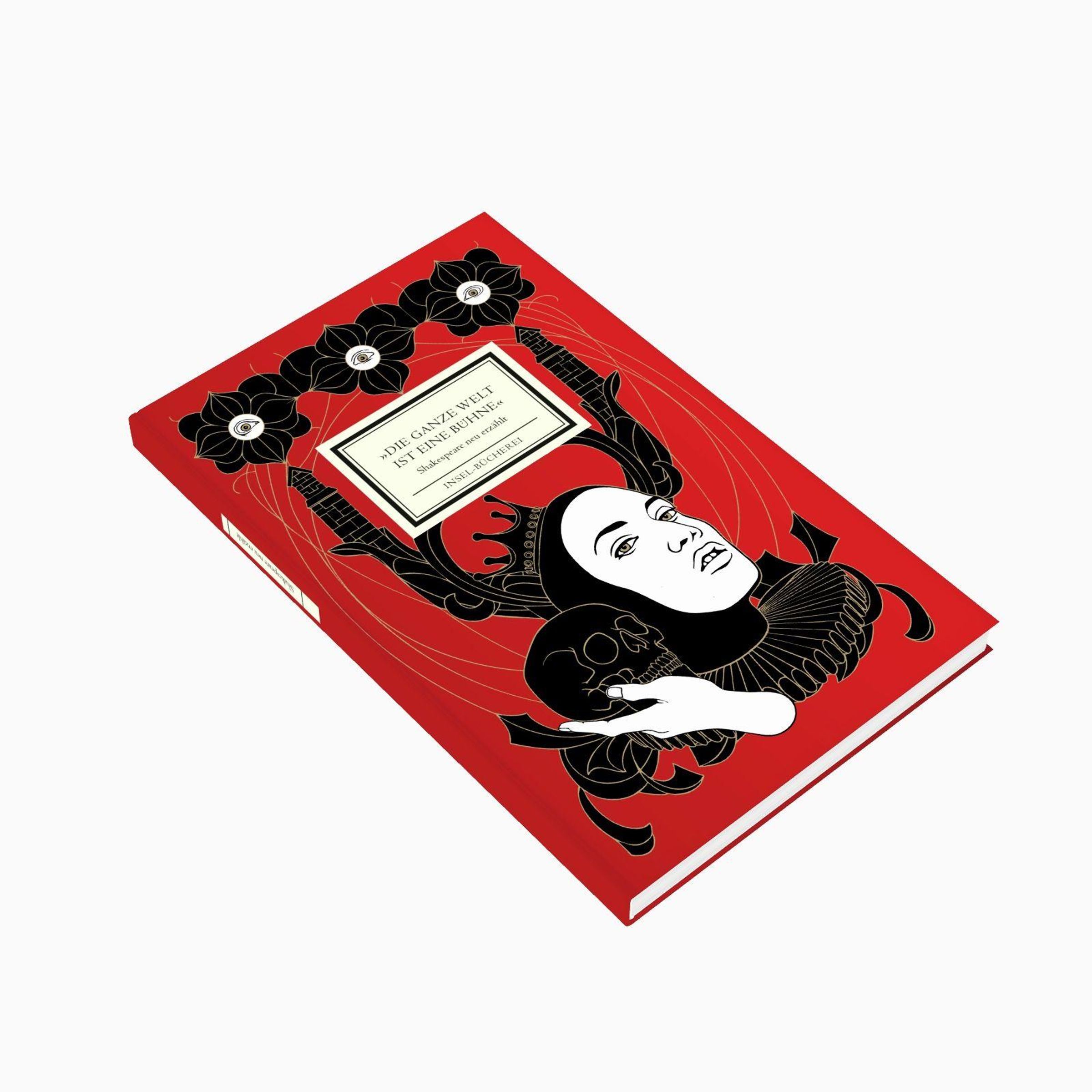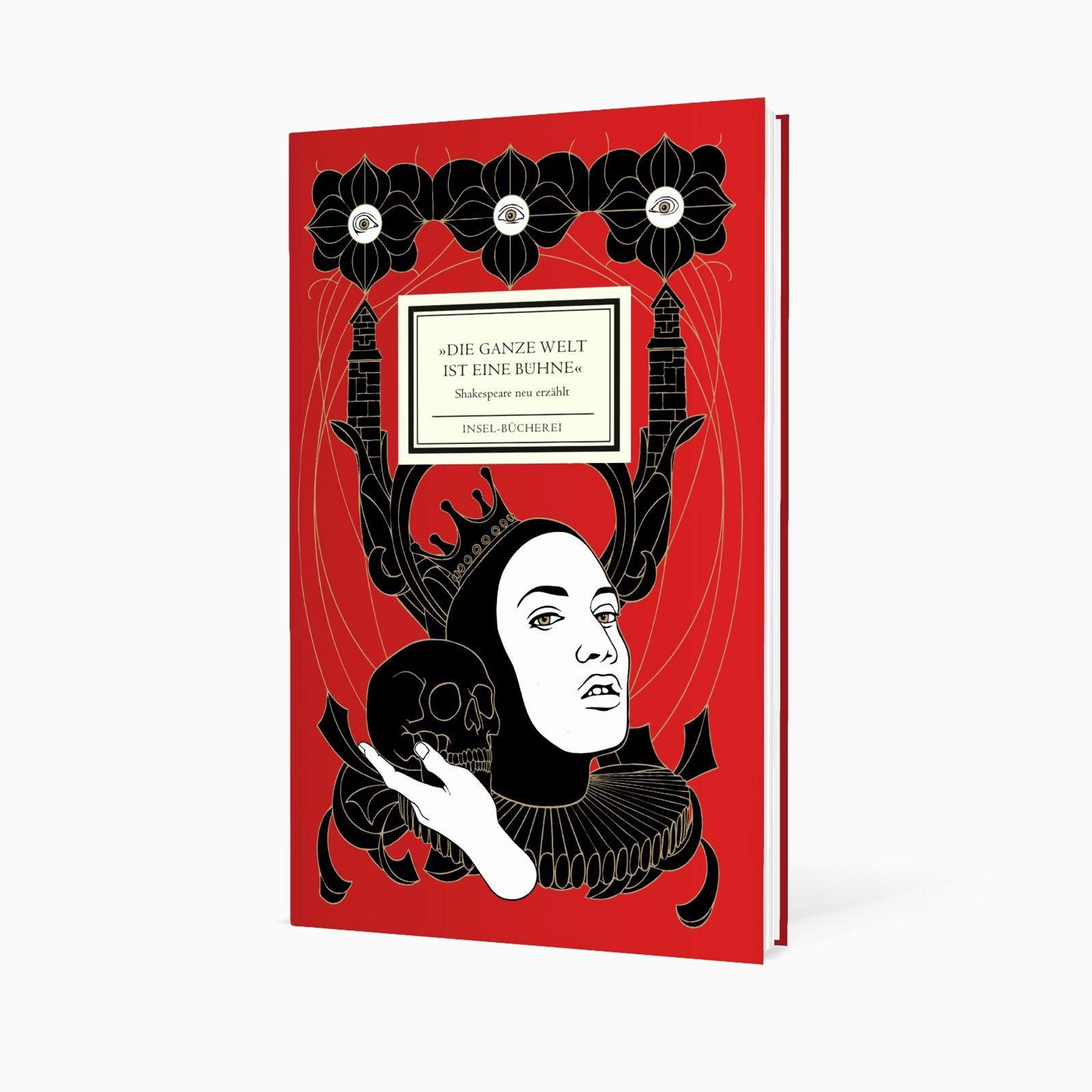 "Die ganze Welt ist eine Bühne", Shakespeare neu erzählt, Insel-Bücherei. Illustration: Frau mit Totenkopf, gotische Muster., Buch