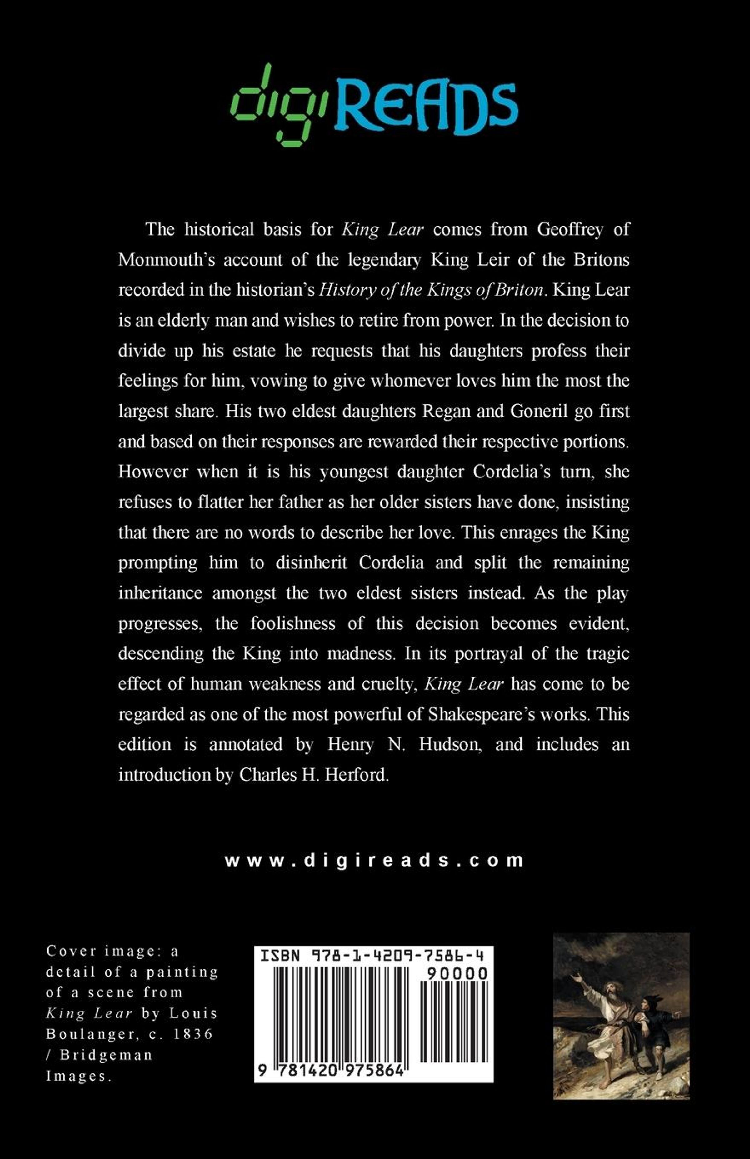 The historical basis for "King Lear" comes from Geoffrey of Monmouth's account of the legendary King Leir of the Britons recorded in the historian's "History of the Kings of Briton." King Lear is an elderly man and wishes to retire from power. In the decision to divide up his estate he requests that his daughters profess their feelings for him, vowing to give whomever loves him the most the largest share. His two eldest daughters Regan and Goneril go first and based on their responses are rewarded their respective portions. However when it is his youngest daughter Cordelia's turn, she refuses to flatter her father as her older sisters have done, insisting that there are no words to describe her love. This enrages the King prompting him to disinherit Cordelia and split the remaining inheritance amongst the two eldest sisters instead. As the play progresses, the foolishness of this decision becomes evident, descending the King into madness. In its portrayal of the tragic effect of human weakness and cruelty, "King Lear" has come to be regarded as one of the most powerful of Shakespeare's works. This edition is printed on premium acid-free paper, is annotated by Henry N. Hudson, and includes an introduction by Charles H. Herford.