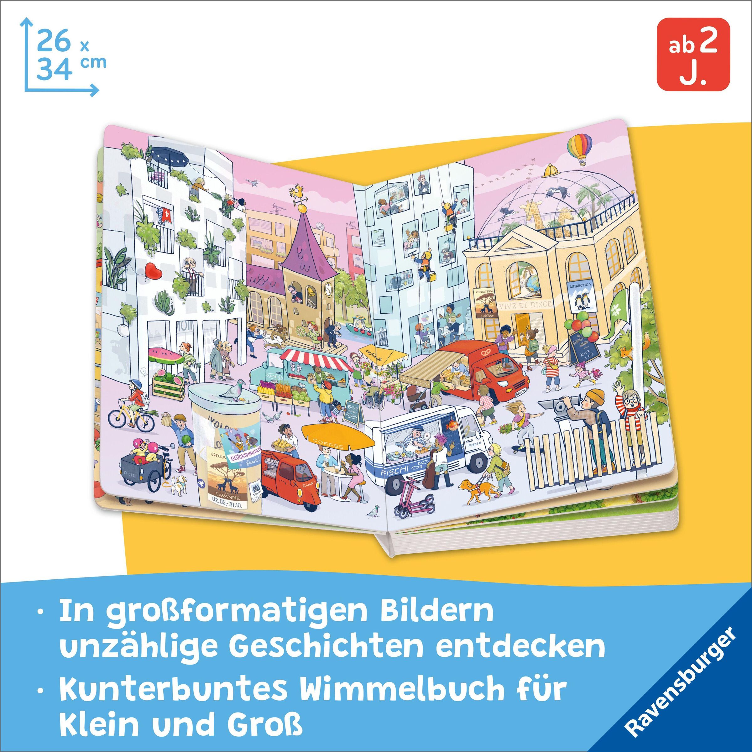 In diesem Wimmelbuch ohne Text entdecken Kinder und Erwachsene viele spannende Geschichten. Auf jeder Seite können einzelne Figuren immer wieder gefunden werden. Siehst du den Papa mit den Zwillingen auf dem Lastenrad? Und was macht die Frau mit dem grünen Rock nach ihrem Einkauf beim Gemüsehändler? Findest du das freche Eichhörnchen auf jeder Seite?