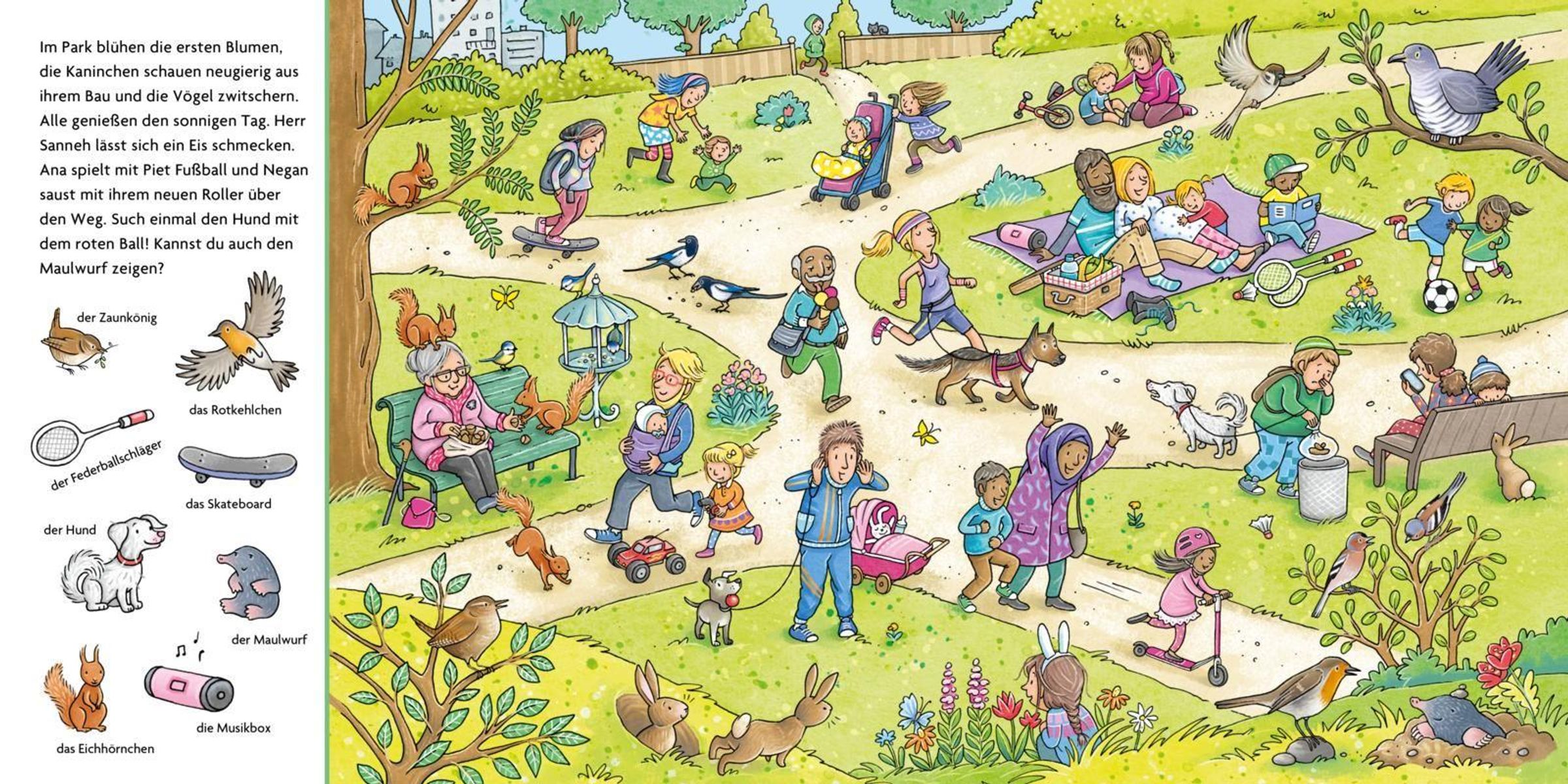 Hinaus in den Park und den Wald, denn hier gibt es so viel zu entdecken! In der Wiese tummeln sich Ameisen, Marienkäfer und viele andere kleine Krabbeltiere. Hier hoppelt ein Kaninchen, dort klettert ein Eichhörnchen. Eine Entenfamilie schwimmt auf dem Teich. Und im Wald haben sich der Fuchs, der Dachs und die Eule versteckt.