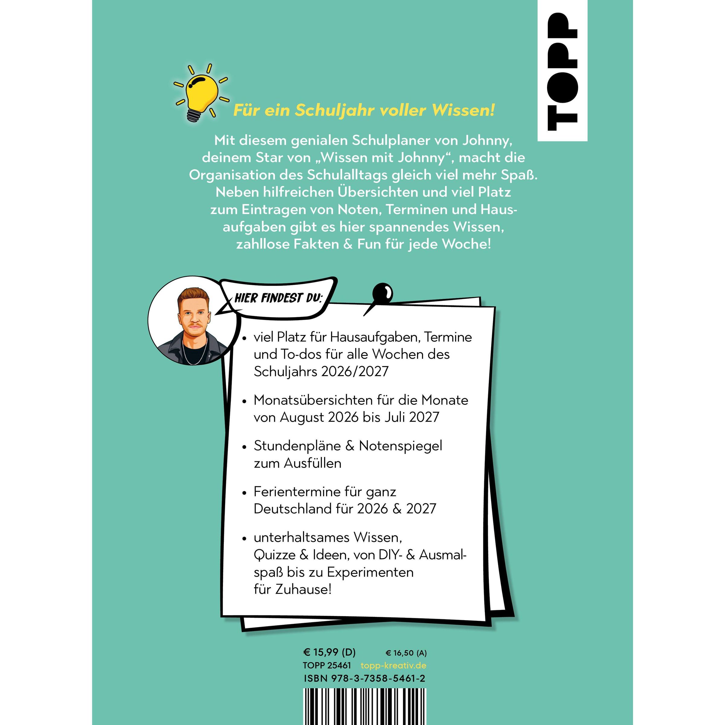 Mit dem ersten Schulplaner von Johnny, dem kreativen Kopf hinter dem erfolgreichen Podcast "Wissen mit Johnny" , wird der Schulalltag nicht nur perfekt organisiert, sondern auch richtig unterhaltsam! Dieser Kalender begleitet dich durchs Schuljahr 2026 / 2027 und verbindet cleveres Planen mit spannendem Wissen - so wird jeder Tag abwechslungsreich und motivierend.