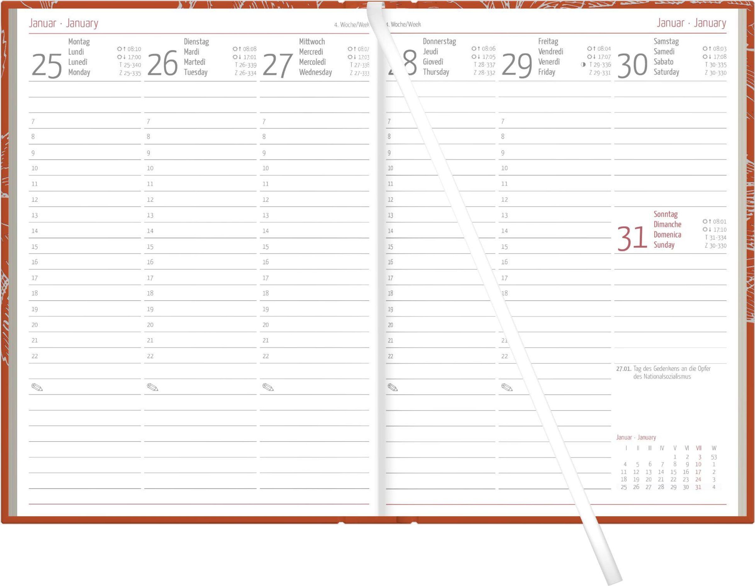 Übersichtliches Kalendarium: 1 Woche auf 2 Seiten, mit hervorgehobenen Sonn- und Feiertagen, Tages- und Wochenzählung, Monatsübersicht und Sonnenzeiten