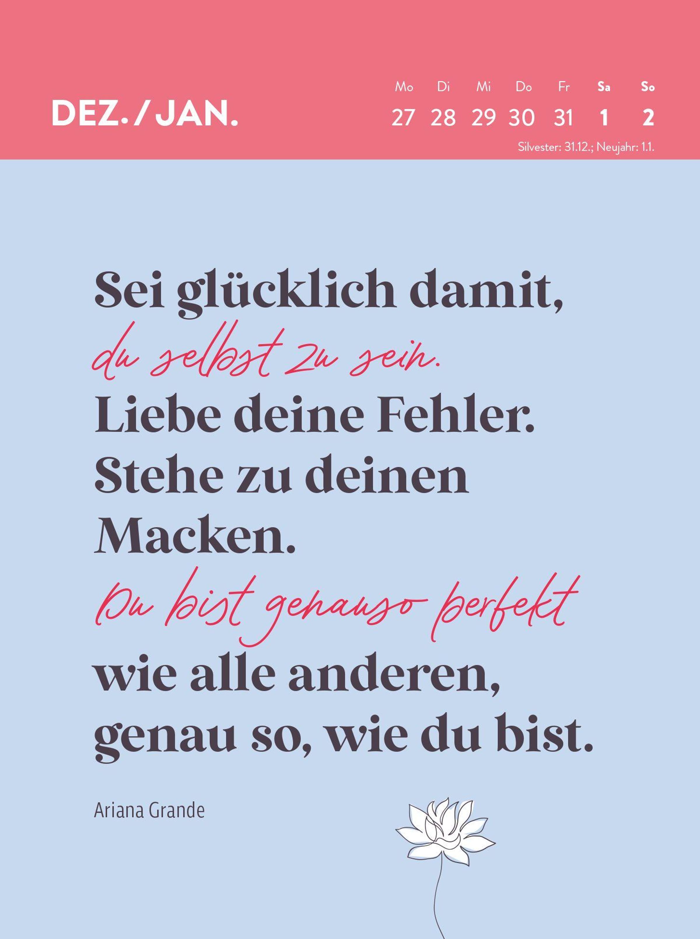 In dem farbenfrohen Wochenkalender Frauen sind großartig! Von perfekt war nie die Rede 2027 zum Aufstellen kommen Frauen zu Wort, die alle eines gemeinsam haben: Sie sind stark, sie glauben an sich - und sie möchten, dass wir das auch tun. Meryl Streep, Brené Brown, Maya Angelou und andere bedeutende Persönlichkeiten überraschen Woche für Woche mit einem inspirierenden Spruch, immer mit der klaren Botschaft: 'Frauen, glaubt an Euch, ihr seid gut so, wie ihr seid - und stärker als ihr denkt!' Das macht den dekorativen Jahreskalender 2027 zum perfekten Geschenk für deine beste Freundin oder natürlich dich selbst.