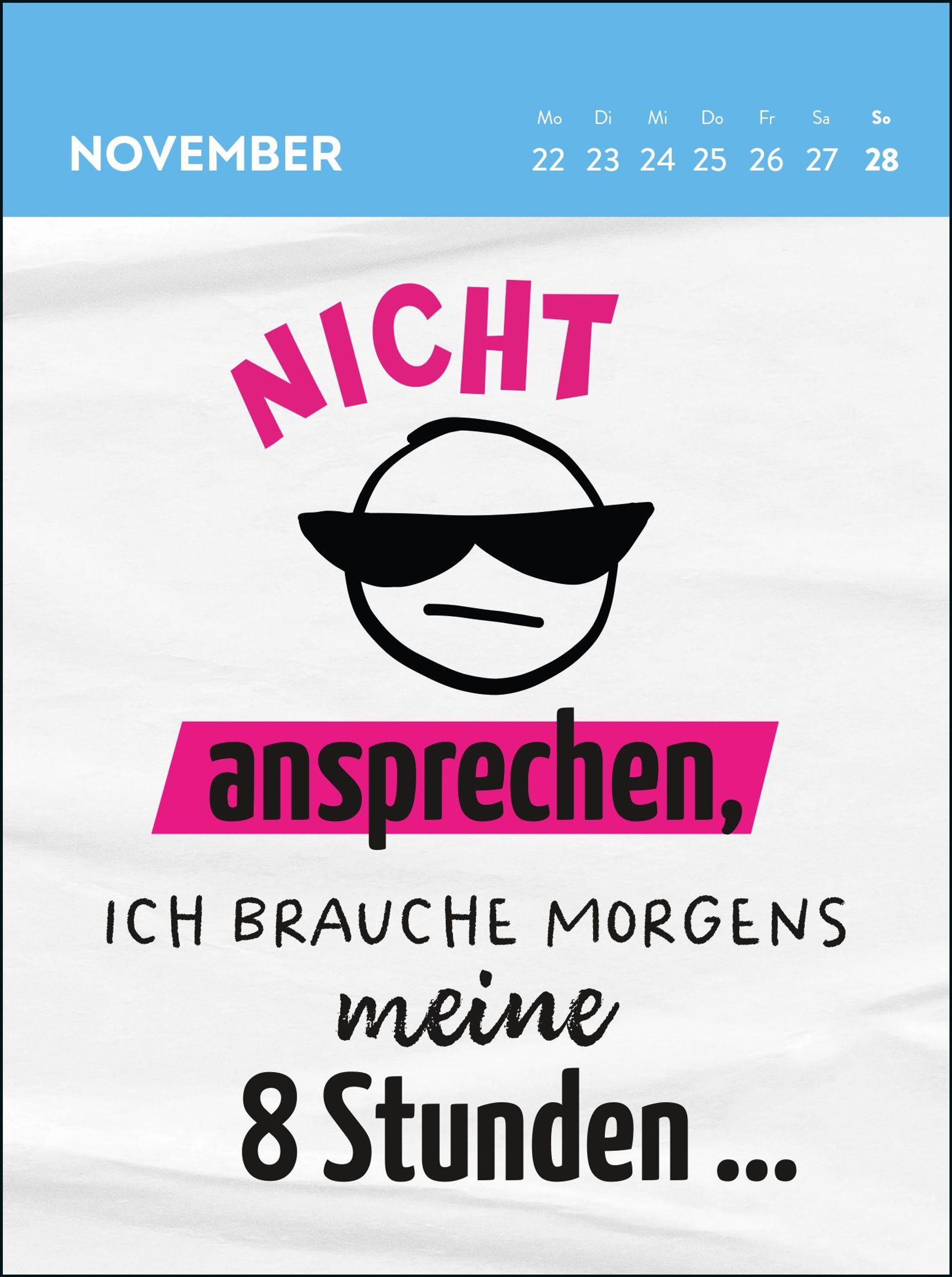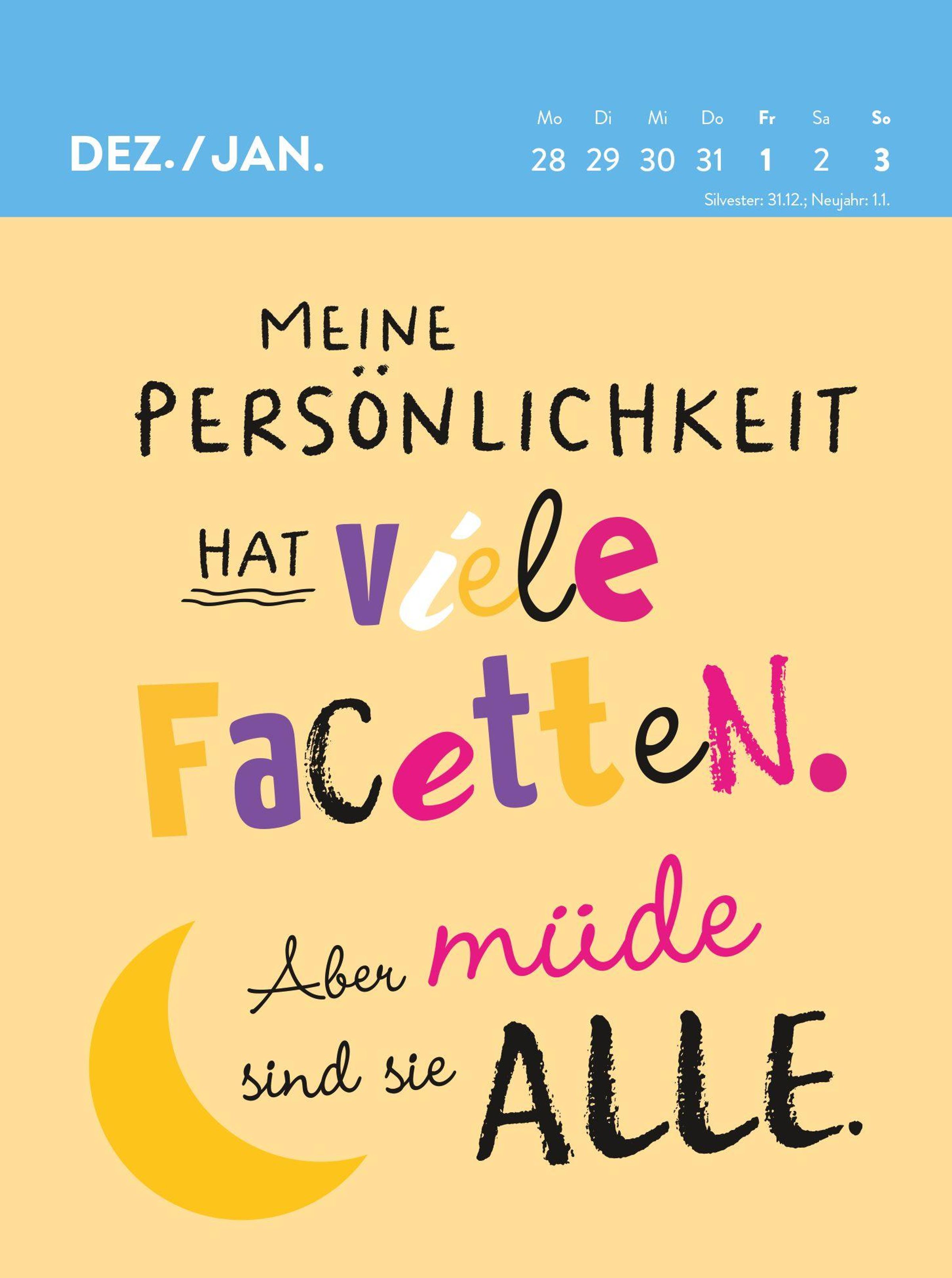 Der Sprüchekalender Heute ist ein guter Tag - um mich in Ruhe zu lassen 2027 , der Woche für Woche dazu einlädt, das Leben mit einer Prise Humor und Gelassenheit zu nehmen, denn: "Je weniger man zuhört, desto professioneller sollte man nicken" und "Warum spazieren gehen, wenn man auch lüften kann?". Diese und 51 weitere, lebensnahe Erkenntnisse machen den lustigen Tischkalender 2027 zum perfekten Begleiter auf dem Schreibtisch im Büro oder im Homeoffice. Der Aufstellkalender 2027 im praktischen Hochformat braucht nur wenig Platz und sorgt mit seinen frechen Sprüchengarantiert für gute Laune.